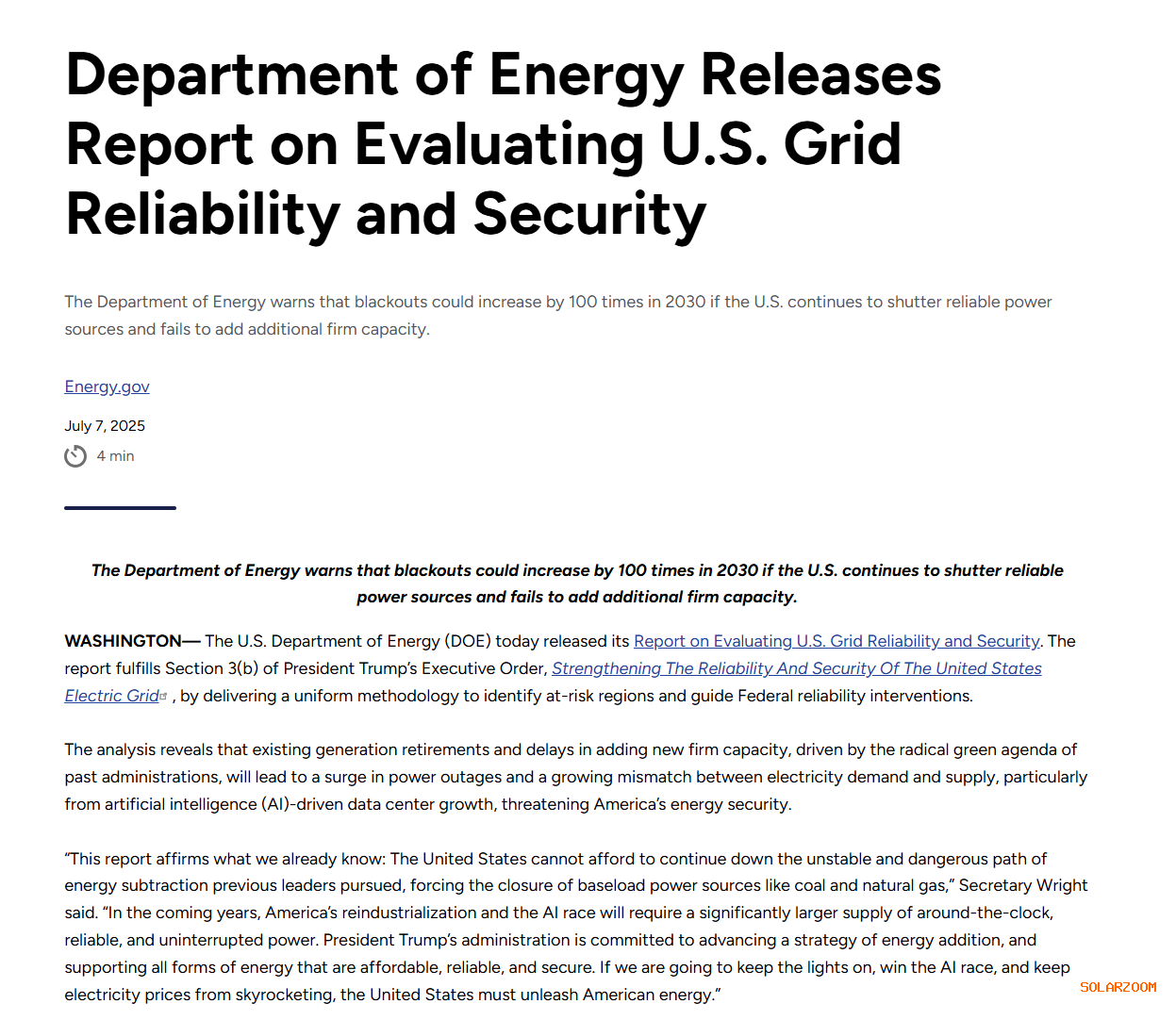 當地時間周一,美國能源部發布報告稱,由于人工智能(AI)導致電力需求激增,到2030年,美國的停電次數可能會增加100%。這份報告被視為一項更廣泛干預措施的前兆,旨在幫助特朗普總統重振煤炭業。 這份報告將預期的能源短缺歸咎于煤炭和天然氣發電廠的關閉以及對可再生能源的過度依賴。該分析是對白宮關于加強電網可靠性和安全性的行政命令的回應,提供了一種方法來確定易受停電影響的區域,從而允許“聯邦可靠性干預”。 美國能源部在報告中說,如果按計劃關閉電廠,而沒有新電廠取代它們,停電次數可能在五年內增加100%。 “繼續目前的路線將損害美國的經濟增長、國家安全和在新興技術領域的領導地位,”報告寫道。 該報告支持特朗普總統的觀點,即支持煤炭發電并反對可再生能源發電。美國能源部還將風能和太陽能(4.510, -0.02, -0.44%)描述為不可靠的,是“過去政府激進的綠色議程”的一部分。 與此同時,美國能源部一直在利用緊急權力延長燃煤電廠和其他電廠的壽命,理由是擔心電力短缺,因為給人工智能模型提供動力的數據中心需要更多的電力供應。 美國能源部部長克里斯·賴特在一份聲明中說:“如果我們想要保持照明,贏得人工智能競賽,并防止電價飆升,美國必須釋放美國的能源。” 能源部指出,該分析可以為使用《聯邦電力法》(Federal Power Act)中的緊急權力命令煤炭和天然氣電廠繼續運營提供依據,政府已經利用該權力挽救了兩座計劃退役的電廠。 而就在上述報告發布前不久,特朗普的“大而美”法案剛剛上線,該法案計劃逐步取消風力渦輪機和太陽能電池板的稅收抵免,標志著美國向清潔能源的轉變遭遇嚴重挫折。 美國能源情報署(EIA)此前估計,可再生能源將在未來幾年成為能源供應的主要提供者。但據美國能源部稱,到2030年,大約相當于100個核反應堆的電廠將退役,這可能導致“當天氣條件不適合風能和太陽能發電時,發生嚴重停電情形”。 不出所料,這份報告引來了諸多批判聲。自然資源保護委員會(Natural Resources Defense Council)負責電力事務的董事總經理Kit Kennedy說:“更多的清潔能源將使美國電網更強大、更可靠、更有彈性,同時為消費者節省電費。救助老舊骯臟的化石燃料發電廠意味著更高的成本和更不可靠的電網。” 另一個環境保護組織Earth Justice則表示,能源部的報告“系統性地低估了清潔能源的貢獻”。 “以煤、天然氣和石油為燃料的發電廠每年向空氣中排放數百萬磅有害健康和導致氣候變暖的污染物,與清潔能源相比,消費者要多花數百萬美元。延長老化的化石燃料發電廠的壽命,違背了州監管機構、公用事業公司、州檢察長和許多其他各方的判斷,”該組織在一份聲明中說。 上一篇: 印度風光發電勁增 綠色轉型仍承壓