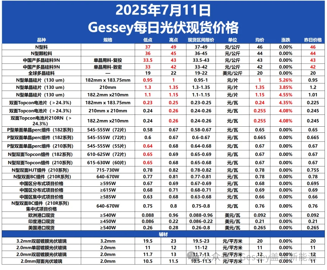 現貨市場價格變動: 多晶硅: 今日硅(gui)料價(jia)(jia)(jia)(jia)格(ge)(ge)(ge)整體維穩(wen),N型料主流價(jia)(jia)(jia)(jia)格(ge)(ge)(ge)在37-49元(yuan)(yuan)(yuan)/公(gong)(gong)斤(jin)(jin),均(jun)(jun)價(jia)(jia)(jia)(jia)46元(yuan)(yuan)(yuan)/公(gong)(gong)斤(jin)(jin)。N型顆(ke)粒硅(gui)主流價(jia)(jia)(jia)(jia)格(ge)(ge)(ge)在36-45元(yuan)(yuan)(yuan)/公(gong)(gong)斤(jin)(jin),均(jun)(jun)價(jia)(jia)(jia)(jia)44元(yuan)(yuan)(yuan)/公(gong)(gong)斤(jin)(jin)。國(guo)產復(fu)投特級硅(gui)料主流價(jia)(jia)(jia)(jia)格(ge)(ge)(ge)在33.5-43元(yuan)(yuan)(yuan)/公(gong)(gong)斤(jin)(jin),均(jun)(jun)價(jia)(jia)(jia)(jia)43元(yuan)(yuan)(yuan)/公(gong)(gong)斤(jin)(jin),國(guo)產致密特級硅(gui)料主流價(jia)(jia)(jia)(jia)格(ge)(ge)(ge)在33-42元(yuan)(yuan)(yuan)/公(gong)(gong)斤(jin)(jin),均(jun)(jun)價(jia)(jia)(jia)(jia)42元(yuan)(yuan)(yuan)/公(gong)(gong)斤(jin)(jin)。全(quan)球(qiu)多晶硅(gui)料主流價(jia)(jia)(jia)(jia)格(ge)(ge)(ge)在19-22元(yuan)(yuan)(yuan)/公(gong)(gong)斤(jin)(jin),均(jun)(jun)價(jia)(jia)(jia)(jia)20元(yuan)(yuan)(yuan)/公(gong)(gong)斤(jin)(jin)。 硅片: 今日硅(gui)片價格小(xiao)幅上漲,N型-183.75mm單晶硅(gui)片主流現貨價格維(wei)持0.95-1元/片,均價1元/片,上漲(zhang)5.26%。N型-210mm單晶硅片主流現貨價格維持(chi)1.3-1.35元/片,均價1.35元/片,上漲3.85%。N型-210Rmm單晶硅片主流(liu)現貨(huo)價格1.1-1.15元/片,均價1.15元/片,上漲4.55%。 電池片: 今日電池片(pian)價格小幅(fu)上(shang)漲,24.3%以(yi)上(shang)183.75mm雙面Topcon電池片(pian)主流價格在0.23-0.25元(yuan)/瓦,均價0.24元(yuan)/瓦,上(shang)漲4.35%。24.3%以(yi)上210mm雙面Topcon電池片主流價格(ge)在0.24-0.26元/瓦,均價0.255元/瓦,上漲(zhang)4.08%。24.3%以上210Rmm雙面Topcon電池片主流價(jia)格(ge)在0.24-0.26元/瓦,均價(jia)0.255元/瓦,上漲(zhang)4.08%。 組件: 今日組(zu)(zu)(zu)件(jian)(jian)價(jia)(jia)(jia)(jia)格(ge)(ge)整(zheng)體維(wei)穩,雙(shuang)面(mian)單晶(jing)perc組(zu)(zu)(zu)件(jian)(jian)(182系列(lie))價(jia)(jia)(jia)(jia)格(ge)(ge)在(zai)(zai)0.6-0.67元(yuan)(yuan)(yuan)(yuan)(yuan)/ 瓦(wa)(wa)(wa)(wa)(wa)(wa)(wa),均(jun)(jun)(jun)(jun)價(jia)(jia)(jia)(jia)為(wei)(wei)(wei)(wei)(wei)0.665元(yuan)(yuan)(yuan)(yuan)(yuan)/瓦(wa)(wa)(wa)(wa)(wa)(wa)(wa)。雙(shuang)面(mian)單晶(jing)perc組(zu)(zu)(zu)件(jian)(jian)(210系列(lie))價(jia)(jia)(jia)(jia)格(ge)(ge)在(zai)(zai)0.64-0.68元(yuan)(yuan)(yuan)(yuan)(yuan)/ 瓦(wa)(wa)(wa)(wa)(wa)(wa)(wa),均(jun)(jun)(jun)(jun)價(jia)(jia)(jia)(jia)為(wei)(wei)(wei)(wei)(wei)0.67元(yuan)(yuan)(yuan)(yuan)(yuan)/瓦(wa)(wa)(wa)(wa)(wa)(wa)(wa)。N型(xing)雙(shuang)面(mian)Topcon 組(zu)(zu)(zu)件(jian)(jian)(182系列(lie))價(jia)(jia)(jia)(jia)格(ge)(ge)在(zai)(zai)0.65-0.69元(yuan)(yuan)(yuan)(yuan)(yuan)/ 瓦(wa)(wa)(wa)(wa)(wa)(wa)(wa),均(jun)(jun)(jun)(jun)價(jia)(jia)(jia)(jia)為(wei)(wei)(wei)(wei)(wei)0.67元(yuan)(yuan)(yuan)(yuan)(yuan)/瓦(wa)(wa)(wa)(wa)(wa)(wa)(wa)。N型(xing)雙(shuang)面(mian)Topcon 組(zu)(zu)(zu)件(jian)(jian)(210系列(lie))價(jia)(jia)(jia)(jia)格(ge)(ge)在(zai)(zai)0.65-0.68元(yuan)(yuan)(yuan)(yuan)(yuan)/ 瓦(wa)(wa)(wa)(wa)(wa)(wa)(wa),均(jun)(jun)(jun)(jun)價(jia)(jia)(jia)(jia)為(wei)(wei)(wei)(wei)(wei)0.67元(yuan)(yuan)(yuan)(yuan)(yuan)/瓦(wa)(wa)(wa)(wa)(wa)(wa)(wa)。N型(xing)雙(shuang)面(mian)HJT組(zu)(zu)(zu)件(jian)(jian)(210系列(lie))價(jia)(jia)(jia)(jia)格(ge)(ge)在(zai)(zai)0.78-0.82元(yuan)(yuan)(yuan)(yuan)(yuan)/ 瓦(wa)(wa)(wa)(wa)(wa)(wa)(wa),均(jun)(jun)(jun)(jun)價(jia)(jia)(jia)(jia)為(wei)(wei)(wei)(wei)(wei)0.78元(yuan)(yuan)(yuan)(yuan)(yuan)/瓦(wa)(wa)(wa)(wa)(wa)(wa)(wa)。N型(xing)雙(shuang)面(mian)BC組(zu)(zu)(zu)件(jian)(jian)(210R系列(lie))價(jia)(jia)(jia)(jia)格(ge)(ge)在(zai)(zai)0.77-0.81元(yuan)(yuan)(yuan)(yuan)(yuan)/ 瓦(wa)(wa)(wa)(wa)(wa)(wa)(wa),均(jun)(jun)(jun)(jun)價(jia)(jia)(jia)(jia)為(wei)(wei)(wei)(wei)(wei)0.78元(yuan)(yuan)(yuan)(yuan)(yuan)/瓦(wa)(wa)(wa)(wa)(wa)(wa)(wa)。中(zhong)國(guo)區分(fen)布(bu)(bu)式(shi)項目(mu)(≥595W)價(jia)(jia)(jia)(jia)格(ge)(ge)在(zai)(zai)0.67-0.69元(yuan)(yuan)(yuan)(yuan)(yuan)/瓦(wa)(wa)(wa)(wa)(wa)(wa)(wa),均(jun)(jun)(jun)(jun)價(jia)(jia)(jia)(jia)為(wei)(wei)(wei)(wei)(wei)0.68元(yuan)(yuan)(yuan)(yuan)(yuan)/瓦(wa)(wa)(wa)(wa)(wa)(wa)(wa),中(zhong)國(guo)區分(fen)布(bu)(bu)式(shi)項目(mu)(≥6155W)價(jia)(jia)(jia)(jia)格(ge)(ge)在(zai)(zai)0.68-0.71元(yuan)(yuan)(yuan)(yuan)(yuan)/瓦(wa)(wa)(wa)(wa)(wa)(wa)(wa),均(jun)(jun)(jun)(jun)價(jia)(jia)(jia)(jia)為(wei)(wei)(wei)(wei)(wei)0.69元(yuan)(yuan)(yuan)(yuan)(yuan)/瓦(wa)(wa)(wa)(wa)(wa)(wa)(wa),中(zhong)國(guo)區集中(zhong)式(shi)項目(mu)(≥585W)價(jia)(jia)(jia)(jia)格(ge)(ge)在(zai)(zai)0.63-0.68元(yuan)(yuan)(yuan)(yuan)(yuan)/ 瓦(wa)(wa)(wa)(wa)(wa)(wa)(wa),均(jun)(jun)(jun)(jun)價(jia)(jia)(jia)(jia)為(wei)(wei)(wei)(wei)(wei)0.66元(yuan)(yuan)(yuan)(yuan)(yuan)/瓦(wa)(wa)(wa)(wa)(wa)(wa)(wa)。N型(xing)雙(shuang)面(mian)BC組(zu)(zu)(zu)件(jian)(jian)(210R系列(lie))集中(zhong)式(shi)項目(mu)價(jia)(jia)(jia)(jia)格(ge)(ge)在(zai)(zai)0.75-0.8元(yuan)(yuan)(yuan)(yuan)(yuan)/ 瓦(wa)(wa)(wa)(wa)(wa)(wa)(wa),均(jun)(jun)(jun)(jun)價(jia)(jia)(jia)(jia)為(wei)(wei)(wei)(wei)(wei)0.76元(yuan)(yuan)(yuan)(yuan)(yuan)/瓦(wa)(wa)(wa)(wa)(wa)(wa)(wa)。歐洲(zhou)港口現(xian)(xian)貨價(jia)(jia)(jia)(jia)格(ge)(ge)在(zai)(zai)0.088-0.96美(mei)元(yuan)(yuan)(yuan)(yuan)(yuan)/ 瓦(wa)(wa)(wa)(wa)(wa)(wa)(wa),均(jun)(jun)(jun)(jun)價(jia)(jia)(jia)(jia)為(wei)(wei)(wei)(wei)(wei)0.092美(mei)元(yuan)(yuan)(yuan)(yuan)(yuan)/瓦(wa)(wa)(wa)(wa)(wa)(wa)(wa)。印(yin)度港口現(xian)(xian)貨價(jia)(jia)(jia)(jia)格(ge)(ge)在(zai)(z