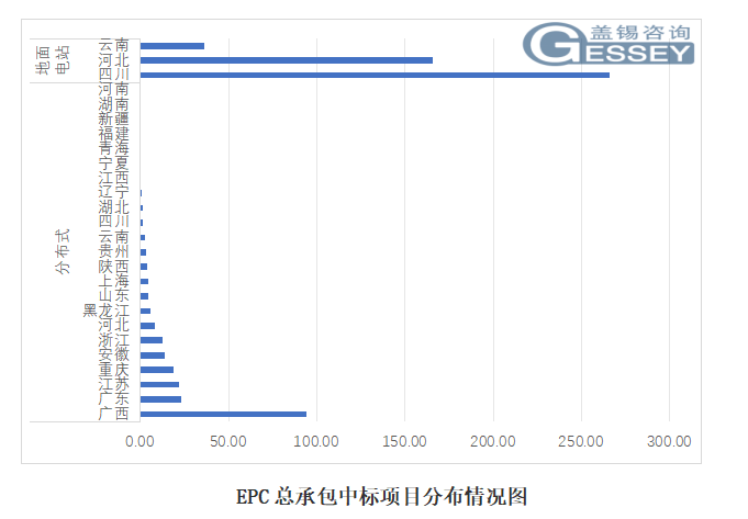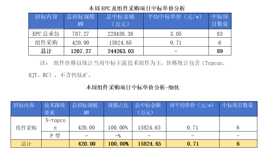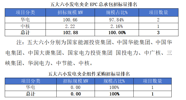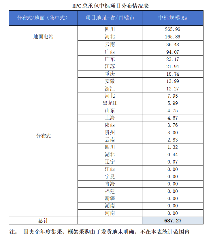 一、光伏項目招標情況匯總: 根據(ju)Gessey蓋錫(xi)咨詢(xun)統計(ji),2025年7月(yue)5日(ri)-7月(yue)11日(ri)累計(ji)光伏招(zhao)標項(xiang)目為(wei)(wei)(wei)110個(ge),項(xiang)目規模(mo)合計(ji)為(wei)(wei)(wei)1218.13MW。光伏組件(jian)采(cai)購招(zhao)標項(xiang)目為(wei)(wei)(wei)10個(ge),招(zhao)標規模(mo)為(wei)(wei)(wei)271.29MW,EPC總承包招(zhao)標項(xiang)目為(wei)(wei)(wei)100個(ge),招(zhao)標規模(mo)為(wei)(wei)(wei)946.84MW。 我們統(tong)計包含(han)大型(xing)央企(qi)(qi)國企(qi)(qi)、地(di)方能源集團(tuan)、地(di)方政(zheng)府機(ji)關、兩大電(dian)網、央企(qi)(qi)總包企(qi)(qi)業(ye)、知(zhi)名(ming)光伏(fu)企(qi)(qi)業(ye)等,其中五大六小發電(dian)央企(qi)(qi)占總招標(biao)規模較高,具體各企(qi)(qi)業(ye)排名(ming)如下表: 二、中標項目分布類型匯總情況 本周(zhou)中(zhong)標項目需求按照招標場景地分布(bu),分布(bu)式光伏主要集(ji)(ji)中(zhong)在(zai)(zai)甘肅、山(shan)(shan)西、貴州、安徽等地區(qu),即主要集(ji)(ji)中(zhong)在(zai)(zai)東北部地區(qu);集(ji)(ji)中(zhong)式光伏主要集(ji)(ji)中(zhong)在(zai)(zai)山(shan)(shan)東等地區(qu),即主要集(ji)(ji)中(zhong)在(zai)(zai)華東地區(qu)。 三、EPC總承包及組件采購情況匯總 本(ben)月光伏EPC總承包中標規模(mo)達787.27 MW,總中標金額228438.38萬(wan)元(yuan)(yuan),平均中標單價(jia)為3.05元(yuan)(yuan)/W,中標數量83個(ge)。 本月光伏組(zu)件采購中(zhong)標規模達420 MW,總中(zhong)標金額15824.65萬(wan)元,平均中(zhong)標單(dan)價為(wei)0.71元/W,中(zhong)標數量6個。