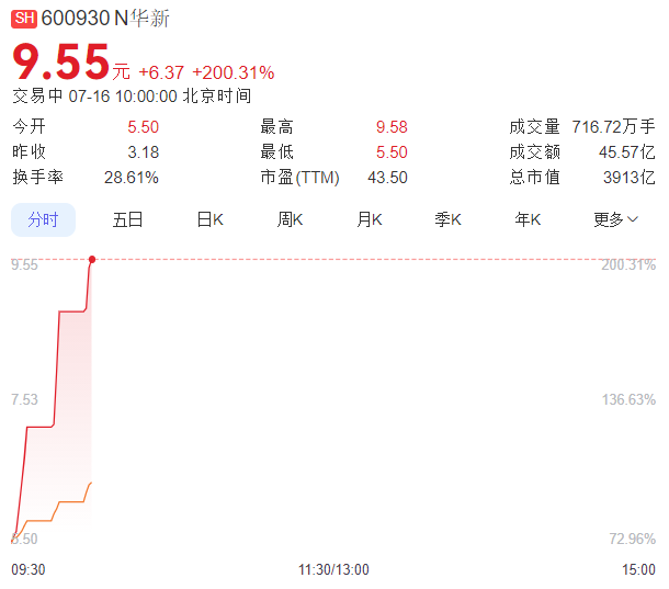 7月16日(ri),華電新能(600930)正式登陸滬市(shi)(shi)主板上市(shi)(shi),公司上市(shi)(shi)首(shou)日(ri)開盤于(yu)5.5元(yuan)/股,盤中上漲176.73%,總市(shi)(shi)值(zhi)3913億元(yuan)。 據了解,2023年3月(yue)(yue)3日(ri),華(hua)(hua)電(dian)新能IPO獲上交所受理,2023年6月(yue)(yue)5日(ri),華(hua)(hua)電(dian)新能IPO獲審核(he)通過。2025年5月(yue)(yue)16日(ri),華(hua)(hua)電(dian)新能IPO注冊正式生效。根(gen)據招股(gu)書,華(hua)(hua)電(dian)新能本次(ci)計劃募集資(zi)金180億元(yuan),募資(zi)將全部用(yong)于(yu)風光大基地項(xiang)目(mu)、負荷中(zhong)心消納項(xiang)目(mu)、新型電(dian)力系統協同(tong)項(xiang)目(mu)和綠色生態文明(ming)協同(tong)發展(zhan)項(xiang)目(mu)建設(she)。 華電新(xin)(xin)(xin)能(neng)是中(zhong)國華電風力、太陽能(neng)發電為主的新(xin)(xin)(xin)能(neng)源業(ye)務最終整合(he)的唯一(yi)平臺,也是我國最早參(can)與新(xin)(xin)(xin)能(neng)源發電業(ye)務開(kai)發與運營(ying)的企業(ye)之(zhi)一(yi)。 上一篇: 7月10日期貨行情走勢