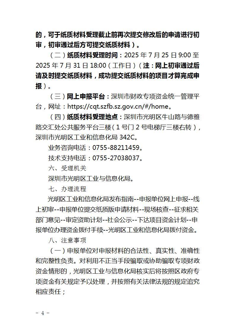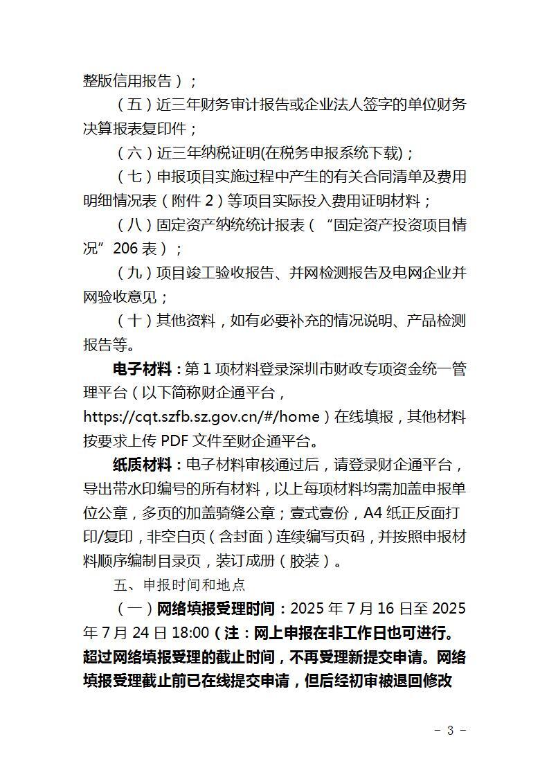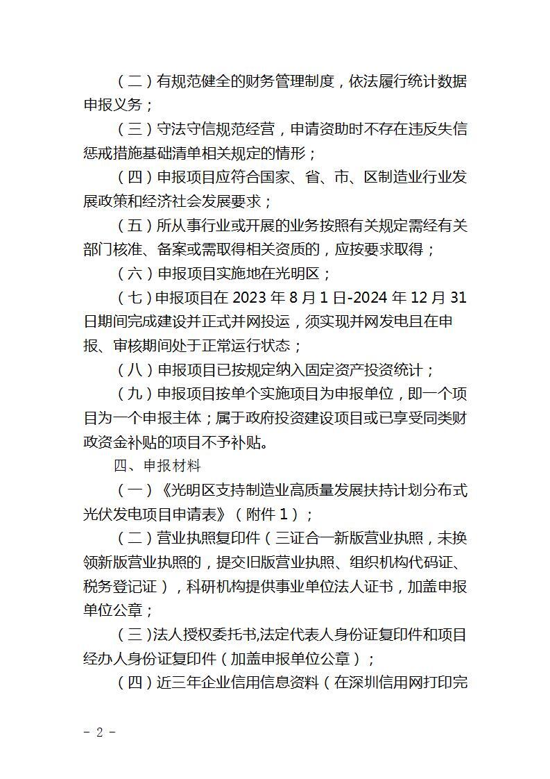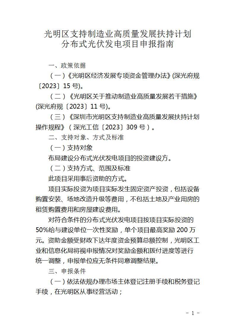 7月16日,深圳(zhen)市光(guang)明區工業(ye)和信息化局(ju)發布關于開(kai)展2023-2024年(nian)光(guang)明區支持制造業(ye)高(gao)質量(liang)發展扶持計劃分布式光(guang)伏(fu)發電項目申(shen)報的(de)通知。 通知(zhi)文件指出(chu),受理(li)項目為分布式光(guang)伏項目,申報時間(jian)為2025年7月(yue)16日至7月(yue)31日。 項目采用事后資助的方式。 項(xiang)目(mu)實(shi)際(ji)投(tou)資為項(xiang)目(mu)實(shi)際(ji)發生(sheng)固定(ding)資產投(tou)資,包括設備購置(zhi)安裝、場地改造升級(ji)等費(fei)用,不包括土(tu)地及產業用房(fang)(fang)的租賃購置(zhi)費(fei)用和房(fang)(fang)屋(wu)建設費(fei)用。 對(dui)符合條(tiao)件的分(fen)布式光(guang)伏發電(dian)項(xiang)目按項(xiang)目實際投資的50%給與建設(she)單(dan)位(wei)一次性獎(jiang)勵,單(dan)個項(xiang)目最(zui)高獎(jiang)勵200萬元(yuan)。資助金(jin)額(e)受財政(zheng)下(xia)達年度資金(jin)預算總(zong)額(e)控制,光(guang)明區工業(ye)和信息(xi)化局(ju)將視(shi)申報情況(kuang)對(dui)獎(jiang)勵金(jin)額(e)和撥付(fu)進度等(deng)進行(xing)統一調整,申報單(dan)位(wei)應無條(tiao)件同(tong)意調整結果。 原文如下: 深圳市光明區工業和信息化局關于開展2023-2024年光明區支持制造業高質量發展扶持計劃分布式光伏發電項目申報的通知 各企(qi)業: 根據《光(guang)明區經濟發展(zhan)專項(xiang)資金管理辦(ban)法》(深光(guang)府規〔2023〕15號(hao)(hao))、《光(guang)明區關于(yu)推動制造(zao)業高質(zhi)量(liang)發展(zhan)的若干措施》(深光(guang)府規〔2023〕11號(hao)(hao))及其配套細則《深圳市光(guang)明區支持制造(zao)業高質(zhi)量(liang)發展(zhan)扶持計劃操作規程》(〔2023〕309號(hao)(hao)),現開展(zhan)2023-2024年光(guang)明區支持制造(zao)業高質(zhi)量(liang)發展(zhan)扶持計劃分布式光(guang)伏發電項(xiang)目申報受理。 一、受理項目 分布式光伏發(fa)電項(xiang)目 二、受理時間及地點 (一)網(wang)絡(luo)填報(bao)受(shou)理(li)(li)時間:2025年7月(yue)16日至(zhi)2025年7月(yue)24日18:00(注(zhu):網(wang)上申(shen)報(bao)在非工作日也(ye)可(ke)進行。超過網(wang)絡(luo)填報(bao)受(shou)理(li)(li)的(de)截止時間,不再受(shou)理(li)(li)新提(ti)交申(shen)請(qing)。網(wang)絡(luo)填報(bao)受(shou)理(li)(li)截止前已(yi)在線提(ti)交申(shen)請(qing),但后經初審被退(tui)回修改的(de),可(ke)于紙質材料(liao)受(shou)理(li)(li)截止前再次提(ti)交修改后的(de)申(shen)請(qing)進行初審,初審通過后方可(ke)提(ti)交紙質材料(liao))。 (二(er))紙(zhi)質(zhi)材料(liao)受理(li)時(shi)間:2025年(nian)7月25日(ri)9:00至2025年(nian)7月31日(ri)18:00(工作日(ri))(注:網上初審通過(guo)后請(qing)及時(shi)提(ti)交(jiao)紙(zhi)質(zhi)材料(liao),成功提(ti)交(jiao)紙(zhi)質(zhi)材料(liao)的(de)項目才算完成申報(bao))。 (三)網上(shang)申報平(ping)臺:深(shen)圳市(shi)財(cai)政專(zhuan)項資金統一管理平(ping)臺,網址://cqt.szfb.sz.gov.cn/#/home。 (四)紙質受理地點:深圳(zhen)市光(guang)明(ming)區牛山路與德雅路交(jiao)匯處(chu)公共(gong)服務平臺三(san)樓(1號門2號電(dian)梯(ti)廳三(san)樓右轉),深圳(zhen)市光(guang)明(ming)區工業和信息化局342C。 業務咨(zi)詢電(dian)話:0755-88211459。 技術支持電(dian)話:0755-27038037。 三、受理機關 深圳市光明(ming)區工業和信息(xi)化(hua)局(ju)。 四、申報流程 光明區(qu)工(gong)業和信(xin)息化(hua)局發布(bu)指南--申(shen)(shen)報單位(wei)網(wang)上申(shen)(shen)報--線上初審--申(shen)(shen)報單位(wei)提交紙質版(ban)申(shen)(shen)請材料--現場(chang)核查--征求(qiu)相關部(bu)門意見--審定(ding)資助計劃--社(she)會(hui)公(gong)示(shi)--下達項目(mu)資金(jin)(jin)計劃--申(shen)(shen)報單位(wei)辦理資金(jin)(jin)撥付手續--光明區(qu)工(gong)業和信(xin)息化(hua)局撥付資金(jin)(jin)。 五、注意事項 (一(yi))申(shen)報(bao)單位對申(shen)報(bao)材料的合法性(xing)(xing)、真實性(xing)(xing)、準確性(xing)(xing)和完(wan)整性(xing)(xing)負責。對利用不正(zheng)當(dang)手段騙取(qu)或(huo)協(xie)助騙取(qu)專項(xiang)財政(zheng)資金(jin)情(qing)形(xing)的,光明(ming)區工業與信(xin)息化(hua)局核實后將按照(zhao)區政(zheng)府專項(xiang)資金(jin)有關規(gui)(gui)定(ding)予以處理,并按照(zhao)有關法律(lv)法規(gui)(gui)的規(gui)(gui)定(ding)追究相應責任(ren); (二(er))光(guang)明(ming)區(qu)工業(ye)與(yu)信息化局從未委托任何機(ji)構或個人(ren)代理本項目(mu)的(de)資金申報(bao)(bao)事宜(yi),請項目(mu)單位自主申報(bao)(bao)項目(mu)。光(guang)明(ming)區(qu)工業(ye)與(yu)信息化局將嚴(yan)格按照有關標準和程序(xu)受理申報(bao)(bao),不收取任何費用。如有任何機(ji)構或個人(ren)假借光(guang)明(ming)區(qu)工業(ye)與(yu)信息化局工作人(ren)員名義向(xiang)企業(ye)收取費用的(de),請知情者向(xiang)光(guang)明(ming)區(qu)工業(ye)與(yu)信息化局舉報(bao)(bao); (三)項(xiang)目(mu)(mu)申報(bao)單位需提交審(shen)計(ji)報(bao)告(gao)的,應當提供(gong)(gong)已通過注冊會計(ji)師行業統一監管平臺報(bao)備(bei)的審(shen)計(ji)報(bao)告(gao),項(xiang)目(mu)(mu)申報(bao)單位提供(gong)(gong)未備(bei)案(an)或虛(xu)假(jia)備(bei)案(an)的審(shen)計(ji)報(bao)告(gao),不予采(cai)用(yong)。相關審(shen)計(ji)報(bao)告(gao)經核(he)查認定(ding)(ding)屬于虛(xu)假(jia)材料的,項(xiang)目(mu)(mu)單位五年內不得申報(bao)區(qu)經濟發(f