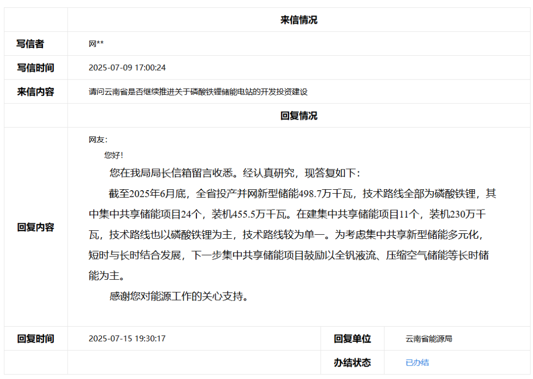 7月15日(ri),云南省(sheng)能(neng)源局(ju)針對“云南省(sheng)是(shi)否繼續推進關于(yu)磷酸鐵鋰(li)儲能(neng)電(dian)站的(de)開發(fa)投資建設”的(de)問(wen)題進行了回復。 回復(fu)如下:截(jie)至2025年6月底,全省投(tou)產并(bing)網新(xin)型儲(chu)能498.7萬千瓦(wa),技術路線全部為(wei)磷酸(suan)(suan)鐵(tie)鋰(li),其中集中共享儲(chu)能項(xiang)目24個(ge),裝(zhuang)機455.5萬千瓦(wa)。在建集中共享儲(chu)能項(xiang)目11個(ge),裝(zhuang)機230萬千瓦(wa),技術路線也以磷酸(suan)(suan)鐵(tie)鋰(li)為(wei)主(zhu),技術路線較為(wei)單一(yi)。 為考慮集中(zhong)共(gong)享(xiang)新(xin)型儲能多元(yuan)化,短時與長(chang)時結合(he)發展(zhan),下(xia)一(yi)步集中(zhong)共(gong)享(xiang)儲能項目(mu)鼓勵以全(quan)釩液流(liu)、壓縮空氣儲能等長(chang)時儲能為主。 以下為回復情況: 上一篇: 云南省首個“橙光互補”示范項目全容量并網