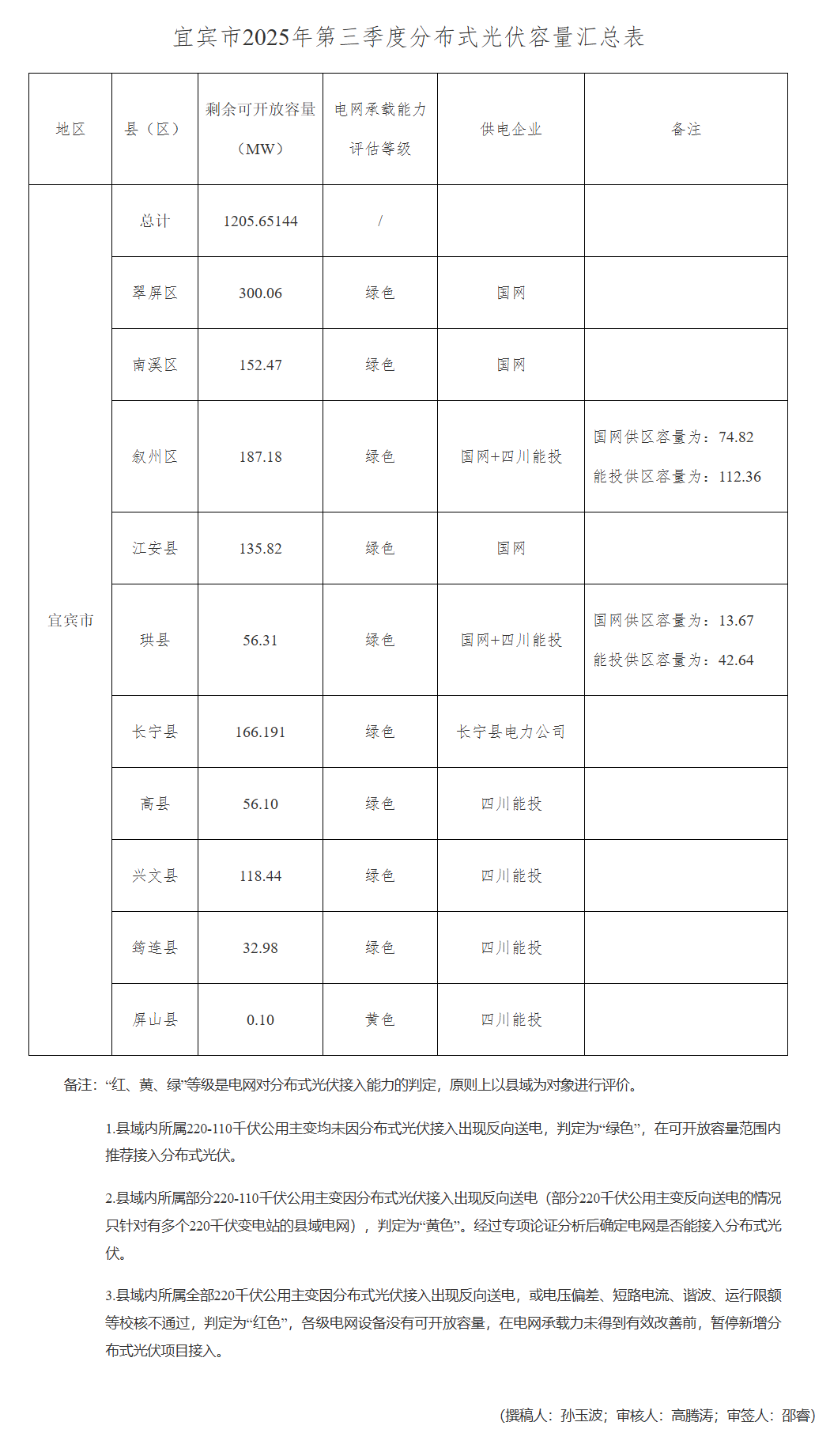近(jin)日,四川宜賓市發展和(he)改(gai)革委員會公布2025年(nian)第三(san)季(ji)(ji)度分(fen)布式光(guang)伏容量,經過評估(gu)和(he)分(fen)析三(san)季(ji)(ji)度剩(sheng)余可開放容量1205.65144MW,10個縣(xian)區中僅屏(ping)山縣(xian)電網承載(zai)能力評估(gu)等級為黃色。