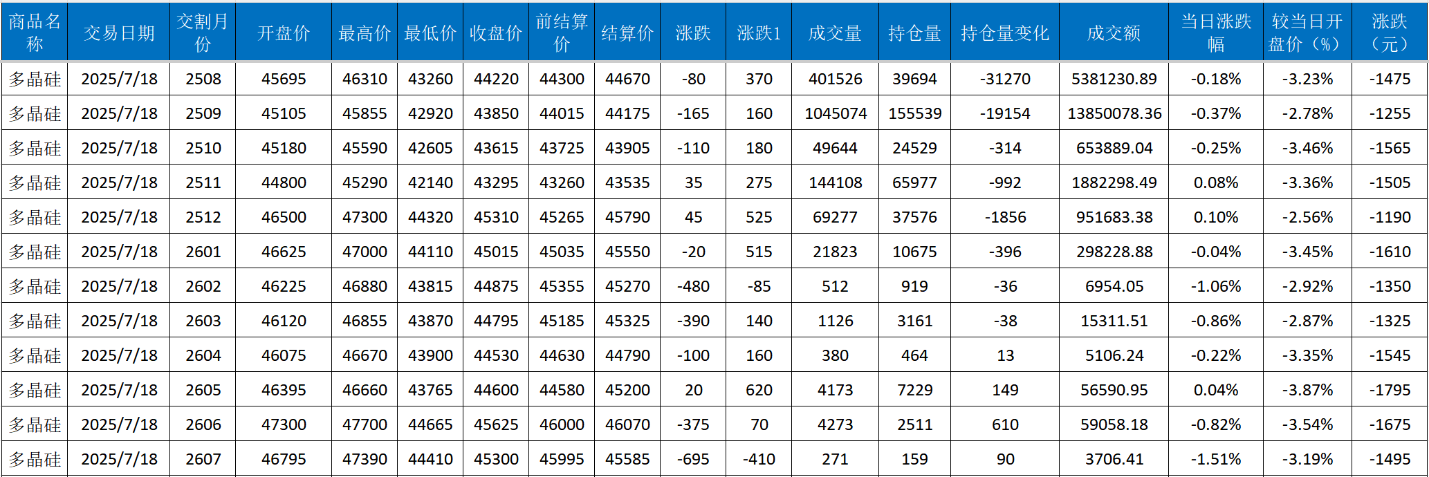 行情走勢:主力(li)合約收(shou)盤(pan)價(jia)為(wei)44220元/噸(dun),前結算價(jia)為(wei)44300元/噸(dun),收(shou)盤(pan)價(jia)較(jiao)前結算價(jia)跌(die)幅(fu)為(wei)0.18%,收(shou)盤(pan)價(jia)較(jiao)開盤(pan)價(jia)跌(die)1475元/噸(dun),跌(die)幅(fu)為(wei)3.23%,成(cheng)交(jiao)量為(wei)401526手(shou),持(chi)倉量為(wei)39694手(shou)。 上一篇: 7月18日多晶硅主力基差表
