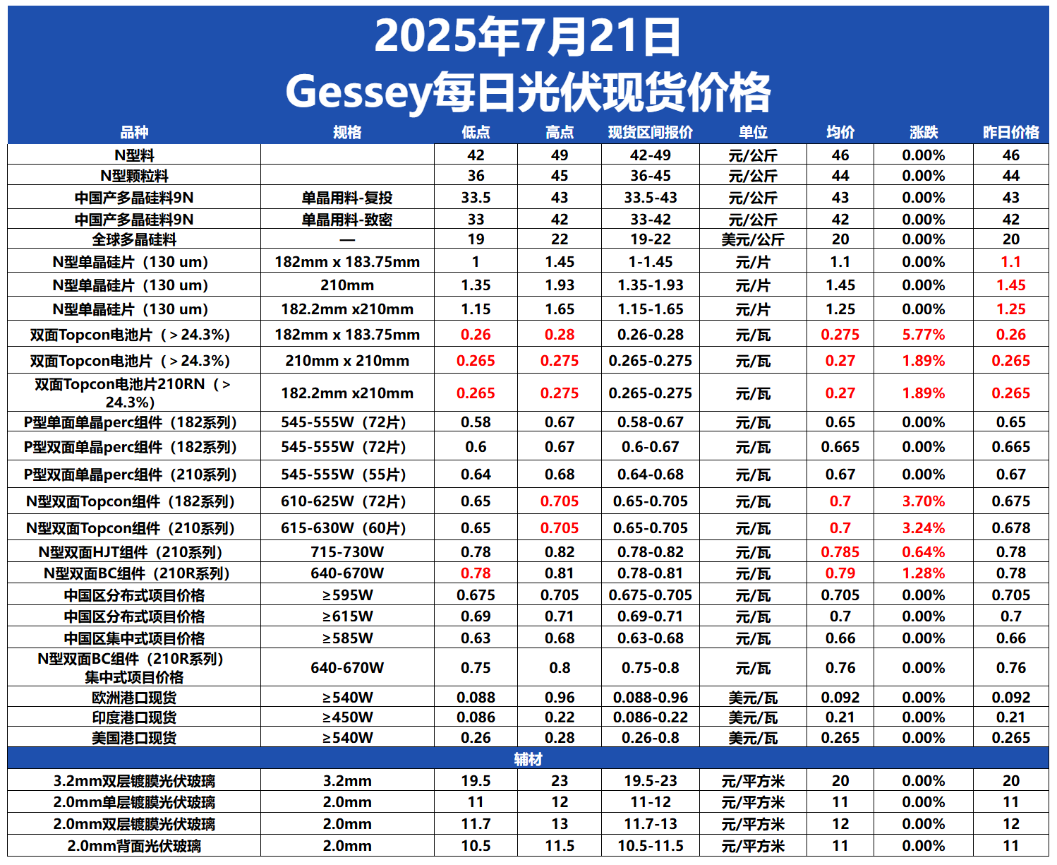 現貨市場價格變動: 多晶硅: 今日硅(gui)(gui)(gui)料(liao)價(jia)(jia)(jia)格(ge)(ge)(ge)整體維(wei)穩,N型料(liao)主(zhu)流(liu)價(jia)(jia)(jia)格(ge)(ge)(ge)在42-49元(yuan)(yuan)(yuan)(yuan)/公(gong)(gong)(gong)斤(jin)(jin),均價(jia)(jia)(jia)46元(yuan)(yuan)(yuan)(yuan)/公(gong)(gong)(gong)斤(jin)(jin)。N型顆粒硅(gui)(gui)(gui)主(zhu)流(liu)價(jia)(jia)(jia)格(ge)(ge)(ge)在36-45元(yuan)(yuan)(yuan)(yuan)/公(gong)(gong)(gong)斤(jin)(jin),均價(jia)(jia)(jia)44元(yuan)(yuan)(yuan)(yuan)/公(gong)(gong)(gong)斤(jin)(jin)。國產復(fu)投特級(ji)硅(gui)(gui)(gui)料(liao)主(zhu)流(liu)價(jia)(jia)(jia)格(ge)(ge)(ge)在33.5-43元(yuan)(yuan)(yuan)(yuan)/公(gong)(gong)(gong)斤(jin)(jin),均價(jia)(jia)(jia)43元(yuan)(yuan)(yuan)(yuan)/公(gong)(gong)(gong)斤(jin)(jin),國產致(zhi)密(mi)特級(ji)硅(gui)(gui)(gui)料(liao)主(zhu)流(liu)價(jia)(jia)(jia)格(ge)(ge)(ge)在33-42元(yuan)(yuan)(yuan)(yuan)/公(gong)(gong)(gong)斤(jin)(jin),均價(jia)(jia)(jia)42元(yuan)(yuan)(yuan)(yuan)/公(gong)(gong)(gong)斤(jin)(jin)。全球多晶硅(gui)(gui)(gui)料(liao)主(zhu)流(liu)價(jia)(jia)(jia)格(ge)(ge)(ge)在19-22元(yuan)(yuan)(yuan)(yuan)/公(gong)(gong)(gong)斤(jin)(jin),均價(jia)(jia)(jia)20元(yuan)(yuan)(yuan)(yuan)/公(gong)(gong)(gong)斤(jin)(jin)。 硅片: 今日硅(gui)(gui)片(pian)價(jia)(jia)格整體維(wei)穩,N型-183.75mm單晶(jing)硅(gui)(gui)片(pian)主流(liu)(liu)現(xian)貨(huo)(huo)價(jia)(jia)格維(wei)持1-1.45元/片(pian),均價(jia)(jia)1.1元/片(pian)。N型-210mm單晶(jing)硅(gui)(gui)片(pian)主流(liu)(liu)現(xian)貨(huo)(huo)價(jia)(jia)格維(wei)持1.35-1.93元/片(pian),均價(jia)(jia)1.45元/片(pian)。N型-210Rmm單晶(jing)硅(gui)(gui)片(pian)主流(liu)(liu)現(xian)貨(huo)(huo)價(jia)(jia)格1.15-1.65元/片(pian),均價(jia)(jia)1.25元/片(pian)。 電池片: 今日(ri)電(dian)池(chi)片(pian)(pian)價(jia)格小幅(fu)上漲(zhang),24.3%以(yi)上183.75mm雙面Topcon電(dian)池(chi)片(pian)(pian)主流(liu)價(jia)格在0.26-0.28元(yuan)/瓦(wa),均價(jia)0.275元(yuan)/瓦(wa),上(shang)漲5.77%。24.3%以上210mm雙面Topcon電池片主流價格(ge)在0.265-0.275元/瓦(wa),均價0.27元/瓦(wa),上漲1.89%。24.3%以(yi)上(shang)210Rmm雙面(mian)Topcon電池片主流價(jia)格在0.265-0.275元(yuan)/瓦,均價(jia)0.27元(yuan)/瓦,上漲1.89%。 組件: 今日組(zu)(zu)件(jian)價(jia)格小幅上漲,雙(shuang)面單晶perc組(zu)(zu)件(jian)(182系(xi)列)價(jia)格在0.6-0.67元(yuan)/ 瓦(wa)(wa)(wa),均價(jia)為(wei)0.665元(yuan)/瓦(wa)(wa)(wa)。雙(shuang)面單晶perc組(zu)(zu)件(jian)(210系(xi)列)價(jia)格在0.64-0.68元(yuan)/ 瓦(wa)(wa)(wa),均價(jia)為(wei)0.67元(yuan)/瓦(wa)(wa)(wa)。N型雙(shuang)面Topcon 組(zu)(zu)件(jian)(182系(xi)列)價(jia)格在0.65-0.705元(yuan)/ 瓦(wa)(wa)(wa),均價(jia)為(wei)0.7元(yuan)/瓦(wa)(wa)(wa),上(shang)漲3.7%。N型雙面(mian)Topcon 組件(210系列(lie))價(jia)格在0.65-0.705元/ 瓦,均價(jia)為0.7元/瓦,上(shang)漲(zhang)3.24%。N型雙面HJT組件(210系列)價格(ge)在0.78-0.82元(yuan)/ 瓦,均(jun)價為(wei)0.785元(yuan)/瓦,上漲0.64%。N型雙面BC組(zu)件(jian)(210R系列)價(jia)(jia)格在0.78-0.81元(yuan)(yuan)/ 瓦,均價(jia)(jia)為(wei)0.79元(yuan)(yuan)/瓦,上漲1.28%。中(zhong)(zhong)國區(qu)分布(bu)式(shi)(shi)(shi)項(xiang)目(mu)(≥595W)價(jia)(jia)(jia)格在(zai)(zai)0.675-0.705元(yuan)/瓦(wa)(wa)(wa)(wa),均價(jia)(jia)(jia)為(wei)0.705元(yuan)/瓦(wa)(wa)(wa)(wa),中(zhong)(zhong)國區(qu)分布(bu)式(shi)(shi)(shi)項(xiang)目(mu)(≥615W)價(jia)(jia)(jia)格在(zai)(zai)0.69-0.71元(yuan)/瓦(wa)(wa)(wa)(wa),均價(jia)(jia)(jia)為(wei)0.7元(yuan)/瓦(wa)(wa)(wa)(wa),中(zhong)(zhong)國區(qu)集(ji)中(zhong)(zhong)式(shi)(shi)(shi)項(xiang)目(mu)(≥585W)價(jia)(jia)(jia)格在(zai)(zai)0.63-0.68元(yuan)/ 瓦(wa)(wa)(wa)(wa),均價(jia)(jia)(jia)為(wei)0.66元(yuan)/瓦(wa)(wa)(wa)(wa)。N型(xing)雙面BC組件(210R系列)集(ji)中(zhong)(zhong)式(shi)(shi)(shi)項(xiang)目(mu)價(jia)(jia)(jia)格在(zai)(zai)0.75-0.8元(yuan)/ 瓦(wa)(wa)(wa)(wa),均價(jia)(jia)(jia)為(wei)0.76元(yuan)/瓦(wa)(wa)(wa)(wa)。歐洲港口(kou)現(xian)貨(huo)價(jia)(jia)(jia)格在(zai)(zai)0.088-0.96美(mei)元(yuan)/ 瓦(wa)(wa)(wa)(wa),均價(jia)(jia)(jia)為(wei)0.092美(mei)元(yuan)/瓦(wa)(wa)(wa)(wa)。印度港口(kou)現(xian)貨(huo)價(jia)(jia)(jia)格在(zai)(zai)0.086-0.22美(mei)元(yuan)/ 瓦(wa)(wa)(wa)(wa),均價(jia)(jia)(jia)為(wei)0.21美(mei)元(yuan)/瓦(wa)(wa)(wa)(wa)。美(mei)國港口(kou)現(xian)貨(huo)價(jia)(jia)(jia)格在(zai)(zai)0.26-0.28美(mei)元(yuan)/ 瓦(wa)(wa)(wa)(wa),均價(jia)(jia)(jia)為(wei)0.265美(mei)元(yuan)/瓦(wa)(wa)(wa)(wa)。 玻璃: 今日(ri)玻(bo)璃(li)價(jia)格(ge)整體維(wei)穩,3.2mm雙層(ceng)鍍(du)(du)膜(mo)光伏玻(bo)璃(li)價(jia)格(ge)在19.5-23元(yuan)(yuan)/平方(fang)(fang)米(mi)(mi)(mi),均(jun)價(jia)為(wei)20元(yuan)(yuan)/平方(fang)(fang)米(mi)(mi)(mi)。2.0mm單(dan)層(ceng)鍍(du)(du)膜(mo)光伏玻(bo)璃(li)價(jia)格(ge)在11-12元(yuan)(yuan)/平方(fang)(fang)米(mi)(mi)(mi),均(jun)價(jia)為(wei)11元(yuan)(yuan)/平方(fang)(fang)米(mi)(mi)(mi)。2.0mm雙層(ceng)鍍(du)(du)膜(mo)光伏玻(bo)璃(li)價(jia)格(ge)在11.7-13元(yuan)(yuan)/平方(fang)(fang)米(mi)(mi)(mi),均(jun)價(jia)為(wei)12元(yuan)(yuan)/平方(fang)(fang)米(mi)(mi)(mi)。2.0mm背面光伏玻(bo)璃(li)價(jia)格(ge)在10.5-11.5元(yuan)(yuan)/平方(fang)(fang)米(mi)(mi)(mi),均(jun)價(jia)為(wei)11元(yuan)(yuan)/平方(fang)(fang)米(mi)(mi)(mi)。 聚焦每日行情波動: 今日(ri)電池片價(jia)格小幅上漲(zhang),24.3%以上183.75mm雙面Topcon電池片主流價(jia)格在0.26-0.28元/瓦,均價(jia)0.275元/瓦,上(shang)漲5.77%。24.3%以上(shang)210mm雙面Topcon電池片主