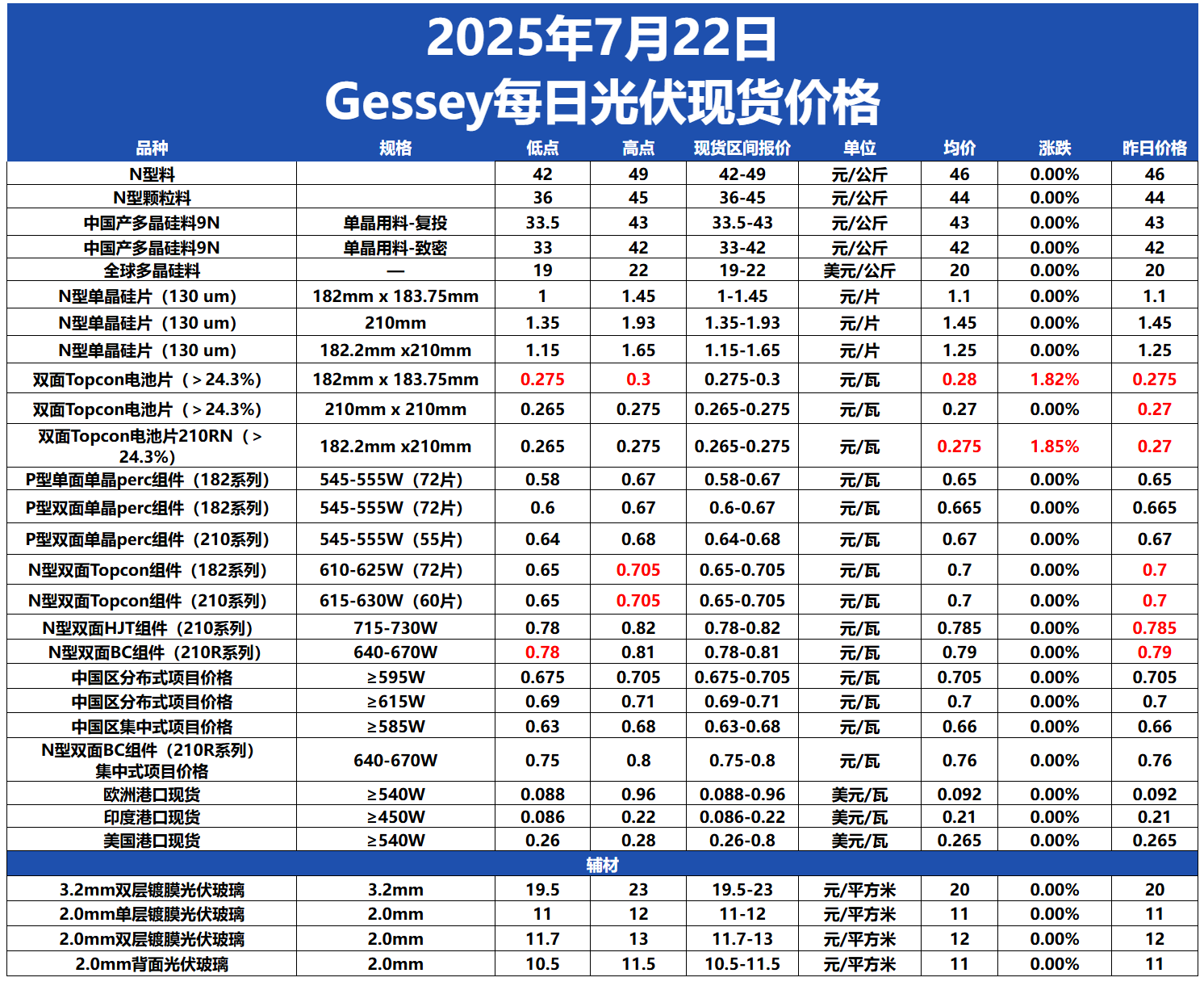 現貨市場價格變動: 多晶硅: 今(jin)日硅(gui)(gui)料(liao)價(jia)格整體維穩,N型料(liao)主流(liu)(liu)價(jia)格在(zai)42-49元(yuan)(yuan)(yuan)(yuan)/公(gong)(gong)斤(jin)(jin)(jin)(jin),均價(jia)46元(yuan)(yuan)(yuan)(yuan)/公(gong)(gong)斤(jin)(jin)(jin)(jin)。N型顆粒(li)硅(gui)(gui)主流(liu)(liu)價(jia)格在(zai)36-45元(yuan)(yuan)(yuan)(yuan)/公(gong)(gong)斤(jin)(jin)(jin)(jin),均價(jia)44元(yuan)(yuan)(yuan)(yuan)/公(gong)(gong)斤(jin)(jin)(jin)(jin)。國(guo)產(chan)復投(tou)特級硅(gui)(gui)料(liao)主流(liu)(liu)價(jia)格在(zai)33.5-43元(yuan)(yuan)(yuan)(yuan)/公(gong)(gong)斤(jin)(jin)(jin)(jin),均價(jia)43元(yuan)(yuan)(yuan)(yuan)/公(gong)(gong)斤(jin)(jin)(jin)(jin),國(guo)產(chan)致(zhi)密特級硅(gui)(gui)料(liao)主流(liu)(liu)價(jia)格在(zai)33-42元(yuan)(yuan)(yuan)(yuan)/公(gong)(gong)斤(jin)(jin)(jin)(jin),均價(jia)42元(yuan)(yuan)(yuan)(yuan)/公(gong)(gong)斤(jin)(jin)(jin)(jin)。全球多(duo)晶硅(gui)(gui)料(liao)主流(liu)(liu)價(jia)格在(zai)19-22元(yuan)(yuan)(yuan)(yuan)/公(gong)(gong)斤(jin)(jin)(jin)(jin),均價(jia)20元(yuan)(yuan)(yuan)(yuan)/公(gong)(gong)斤(jin)(jin)(jin)(jin)。 硅片: 今日硅片價格整體(ti)維(wei)穩,N型-183.75mm單(dan)晶硅片主(zhu)流現(xian)貨價格維(wei)持1-1.45元(yuan)(yuan)/片,均(jun)價1.1元(yuan)(yuan)/片。N型-210mm單(dan)晶硅片主(zhu)流現(xian)貨價格維(wei)持1.35-1.93元(yuan)(yuan)/片,均(jun)價1.45元(yuan)(yuan)/片。N型-210Rmm單(dan)晶硅片主(zhu)流現(xian)貨價格1.15-1.65元(yuan)(yuan)/片,均(jun)價1.25元(yuan)(yuan)/片。 電池片: 今日電池片價(jia)格小幅上(shang)(shang)漲,24.3%以(yi)上(shang)(shang)183.75mm雙面(mian)Topcon電池片主流價(jia)格在(zai)0.275-0.3元(yuan)/瓦,均價(jia)0.28元(yuan)/瓦,上(shang)漲1.82%。24.3%以上(shang)210mm雙面Topcon電池片主流(liu)(liu)價格在0.265-0.275元(yuan)(yuan)/瓦,均(jun)價0.27元(yuan)(yuan)/瓦。24.3%以上(shang)210Rmm雙面Topcon電池片主流(liu)(liu)價格在0.265-0.275元(yuan)(yuan)/瓦,均(jun)價0.275元(yuan)(yuan)/瓦,上漲(zhang)1.85%。 組件: 今日組(zu)件(jian)價(jia)(jia)(jia)(jia)(jia)(jia)(jia)格(ge)(ge)(ge)(ge)整體(ti)維穩,雙面(mian)單晶(jing)perc組(zu)件(jian)(182系(xi)(xi)列(lie))價(jia)(jia)(jia)(jia)(jia)(jia)(jia)格(ge)(ge)(ge)(ge)在(zai)0.6-0.67元(yuan)(yuan)(yuan)/ 瓦(wa)(wa)(wa)(wa)(wa)(wa)(wa),均價(jia)(jia)(jia)(jia)(jia)(jia)(jia)為(wei)(wei)0.665元(yuan)(yuan)(yuan)/瓦(wa)(wa)(wa)(wa)(wa)(wa)(wa)。雙面(mian)單晶(jing)perc組(zu)件(jian)(210系(xi)(xi)列(lie))價(jia)(jia)(jia)(jia)(jia)(jia)(jia)格(ge)(ge)(ge)(ge)在(zai)0.64-0.68元(yuan)(yuan)(yuan)/ 瓦(wa)(wa)(wa)(wa)(wa)(wa)(wa),均價(jia)(jia)(jia)(jia)(jia)(jia)(jia)為(wei)(wei)0.67元(yuan)(yuan)(yuan)/瓦(wa)(wa)(wa)(wa)(wa)(wa)(wa)。N型雙面(mian)Topcon 組(zu)件(jian)(182系(xi)(xi)列(lie))價(jia)(jia)(jia)(jia)(jia)(jia)(jia)格(ge)(ge)(ge)(ge)在(zai)0.65-0.705元(yuan)(yuan)(yuan)/ 瓦(wa)(wa)(wa)(wa)(wa)(wa)(wa),均價(jia)(jia)(jia)(jia)(jia)(jia)(jia)為(wei)(wei)0.7元(yuan)(yuan)(yuan)/瓦(wa)(wa)(wa)(wa)(wa)(wa)(wa)。N型雙面(mian)Topcon 組(zu)件(jian)(210系(xi)(xi)列(lie))價(jia)(jia)(jia)(jia)(jia)(jia)(jia)格(ge)(ge)(ge)(ge)在(zai)0.65-0.705元(yuan)(yuan)(yuan)/ 瓦(wa)(wa)(wa)(wa)(wa)(wa)(wa),均價(jia)(jia)(jia)(jia)(jia)(jia)(jia)為(wei)(wei)0.7元(yuan)(yuan)(yuan)/瓦(wa)(wa)(wa)(wa)(wa)(wa)(wa)。N型雙面(mian)HJT組(zu)件(jian)(210系(xi)(xi)列(lie))價(jia)(jia)(jia)(jia)(jia)(jia)(jia)格(ge)(ge)(ge)(ge)在(zai)0.78-0.82元(yuan)(yuan)(yuan)/ 瓦(wa)(wa)(wa)(wa)(wa)(wa)(wa),均價(jia)(jia)(jia)(jia)(jia)(jia)(jia)為(wei)(wei)0.785元(yuan)(yuan)(yuan)/瓦(wa)(wa)(wa)(wa)(wa)(wa)(wa)。N型雙面(mian)BC組(zu)件(jian)(210R系(xi)(xi)列(lie))價(jia)(jia)(jia)(jia)(jia)(jia)(jia)格(ge)(ge)(ge)(ge)在(zai)0.78-0.81元(yuan)(yuan)(yuan)/ 瓦(wa)(wa)(wa)(wa)(wa)(wa)(wa),均價(jia)(jia)(jia)(jia)(jia)(jia)(jia)為(wei)(wei)0.79元(yuan)(yuan)(yuan)/瓦(wa)(wa)(wa)(wa)(wa)(wa)(wa)。中國(guo)區分(fen)布式(shi)(shi)項(xiang)目(mu)(≥595W)價(jia)(jia)(jia)(jia)(jia)(jia)(jia)格(ge)(ge)(ge)(ge)在(zai)0.675-0.705元(yuan)(yuan)(yuan)/瓦(wa)(wa)(wa)(wa)(wa)(wa)(wa),均價(jia)(jia)(jia)(jia)(jia)(jia)(jia)為(wei)(wei)0.705元(yuan)(yuan)(yuan)/瓦(wa)(wa)(wa)(wa)(wa)(wa)(wa),中國(guo)區分(fen)布式(shi)(shi)項(xiang)目(mu)(≥615W)價(jia)(jia)(jia)(jia)(jia)(jia)(jia)格(ge)(ge)(ge)(ge)在(zai)0.69-0.71元(yuan)(yuan)(yuan)/瓦(wa)(wa)(wa)(wa)(wa)(wa)(wa),均價(jia)(jia)(jia)(jia)(jia)(jia)(jia)為(wei)(wei)0.7元(yuan)(yuan)(yuan)/瓦(wa)(wa)(wa)(wa)(wa)(wa)(wa),中國(guo)區集中式(shi)(shi)項(xiang)目(mu)(≥585W)價(jia)(jia)(jia)(jia)(jia)(jia)(jia)格(ge)(ge)(ge)(ge)在(zai)0.63-0.68元(yuan)(yuan)(yuan)/ 瓦(wa)(wa)(wa)(wa)(wa)(wa)(wa),均價(jia)(jia)(jia)(jia)(jia)(jia)(jia)為(wei)(wei)0.66元(yuan)(yuan)(yuan)/瓦(wa)(wa)(wa)(wa)(wa)(wa)(wa)。N型雙面(mian)BC組(zu)件(jian)(210R系(xi)(xi)列(lie))集中式(shi)(shi)項(xiang)目(mu)價(jia)(jia)(jia)(jia)(jia)(jia)(jia)格(ge)(ge)(ge)(ge)在(zai)0.75-0.8元(yuan)(yuan)(yuan)/ 瓦(wa)(wa)(wa)(wa)(wa)(wa)(wa),均價(jia)(jia)(jia)(jia)(jia)(jia)(jia)為(wei)(wei)0.76元(yuan)(yuan)(yuan)/瓦(wa)(wa)(wa)(wa)(wa)(wa)(wa)。歐洲港(gang)(gang)口(kou)(kou)現貨(huo)價(jia)(jia)(jia)(jia)(jia)(jia)(jia)格(ge)(ge)(ge)(ge)在(zai)0.088-0.96美(mei)(mei)元(yuan)(yuan)(yuan)/ 瓦(wa)(wa)(wa)(wa)(wa)(wa)(wa),均價(jia)(jia)(jia)(jia)(jia)(jia)(jia)為(wei)(wei)0.092美(mei)(mei)元(yuan)(yuan)(yuan)/瓦(wa)(wa)(wa)(wa)(wa)(wa)(wa)。印度港(gang)(gang)口(kou)(kou)現貨(huo)價(jia)(jia)(jia)(jia)(jia)(jia)(jia)格(ge)(ge)(ge)(ge)在(zai)0.086-0.22美(mei)(mei)元(yuan)(yuan)(yuan)/ 瓦(wa)(wa)(wa)(wa)(wa)(wa)(wa),均價(jia)(jia)(jia)(jia)(jia)(jia)(jia)為(wei)(wei)0.21美(mei)(mei)元(yuan)(yuan)(yuan)/瓦(wa)(wa)(wa)(wa)(w