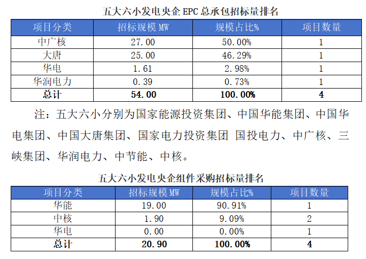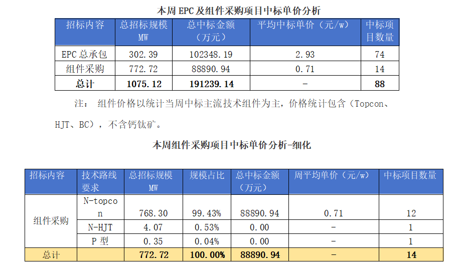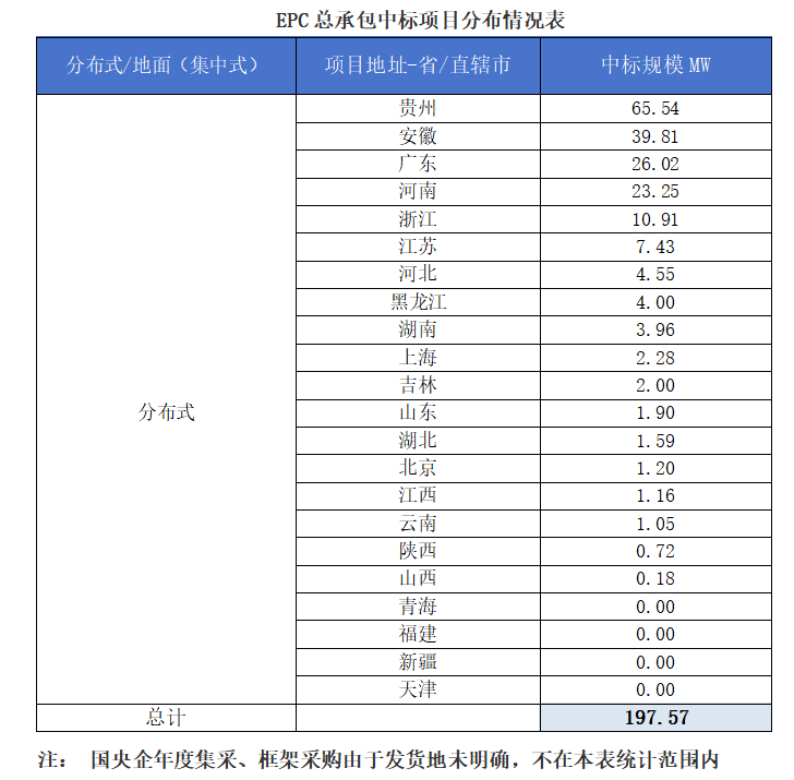 一、光伏項目招標情況匯總: 根(gen)據Gessey蓋錫咨詢統計(ji)(ji),2025年7月19日-7月25日累計(ji)(ji)光(guang)伏招(zhao)標(biao)項目為(wei)119個,項目規模合計(ji)(ji)為(wei)1368.82MW。光(guang)伏組件采購招(zhao)標(biao)項目為(wei)12個,招(zhao)標(biao)規模為(wei)250.4MW,EPC總承包招(zhao)標(biao)項目為(wei)107個,招(zhao)標(biao)規模為(wei)1118.42MW。 我們統(tong)計包(bao)含大型央(yang)(yang)企(qi)(qi)國(guo)企(qi)(qi)、地方能源(yuan)集團、地方政府機(ji)關、兩大電(dian)網、央(yang)(yang)企(qi)(qi)總包(bao)企(qi)(qi)業(ye)、知(zhi)名光伏企(qi)(qi)業(ye)等,其中(zhong)五大六(liu)小發電(dian)央(yang)(yang)企(qi)(qi)占總招標(biao)規模較高,具(ju)體各(ge)企(qi)(qi)業(ye)排(pai)名如(ru)下表: 二、中標項目分布類型匯總情況 本周中(zhong)(zhong)標項目(mu)需求(qiu)按照招(zhao)標場景(jing)地(di)(di)(di)分布,分布式光伏(fu)主(zhu)要集中(zhong)(zhong)在(zai)(zai)甘肅、山(shan)西(xi)、貴州(zhou)、安(an)徽等地(di)(di)(di)區(qu),即主(zhu)要集中(zhong)(zhong)在(zai)(zai)東(dong)北部(bu)地(di)(di)(di)區(qu);集中(zhong)(zhong)式光伏(fu)主(zhu)要集中(zhong)(zhong)在(zai)(zai)山(shan)東(dong)等地(di)(di)(di)區(qu),即主(zhu)要集中(zhong)(zhong)在(zai)(zai)華東(dong)地(di)(di)(di)區(qu)。 三、EPC總承包及組件采購情況匯總 本月光伏EPC總承包(bao)中(zhong)標(biao)(biao)規模達302.39 MW,總中(zhong)標(biao)(biao)金額102348.19萬元,平(ping)均中(zhong)標(biao)(biao)單價為2.93元/W,中(zhong)標(biao)(biao)數量74個。 本月光伏組件采購中(zhong)(zhong)標(biao)規模達772.72 MW,總中(zhong)(zhong)標(biao)金額88890.94萬元(yuan),平均中(zhong)(zhong)標(biao)單價為0.71元(yuan)/W,中(zhong)(zhong)標(biao)數(shu)量14個。