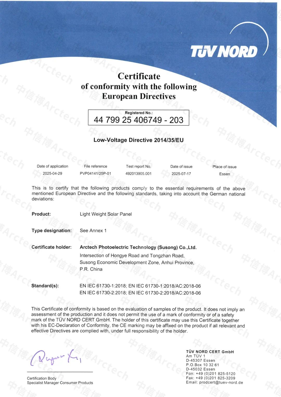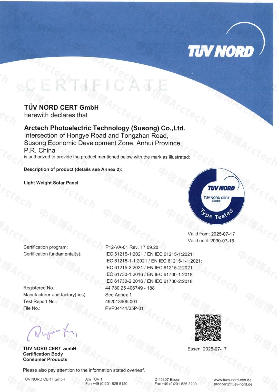 日(ri)前(qian),中(zhong)(zhong)信博“綠電+”輕(qing)質組件、雙(shuang)玻組件、發(fa)電幕墻及地(di)磚等多款產品成(cheng)功通過(guo)IEC 61215、IEC 61730標準(zhun)中(zhong)(zhong)的嚴(yan)苛測試挑(tiao)戰,并正式獲(huo)得全球權(quan)威(wei)第(di)三方檢測認證機構TüV北德集團(tuan)頒發(fa)的認證證書。 頒證儀式現場(chang) 實力認證 國際標準產品領先 IEC 61215/IEC 61730作為國(guo)際電(dian)工(gong)委員會(IEC)制定的關于光伏(fu)產品性(xing)能和安全性(xing)的權威認證標準,已(yi)經成為工(gong)業級(ji)光伏(fu)產品全球范圍(wei)(wei)內認可度最高、應(ying)用范圍(wei)(wei)最廣的國(guo)際標準。 認證證書 此次認證獲(huo)取標(biao)(biao)志著中信博“綠(lv)電+” 輕質組(zu)件、雙玻組(zu)件、發電幕墻(qiang)等(deng)在產品設計標(biao)(biao)準(zhun)、制造(zao)標(biao)(biao)準(zhun)、性(xing)能(neng)標(biao)(biao)準(zhun)、安(an)全(quan)標(biao)(biao)準(zhun)等(deng)全(quan)方面達到全(quan)球領先水平,相關產品可實現高標(biao)(biao)準(zhun)的高效發電、長(chang)期安(an)全(quan)穩定運行、復雜環(huan)境高適應度,可為用戶提供安(an)全(quan)、可靠、穩定、長(chang)期的綠(lv)色能(neng)源解決方案。 中信(xin)博綠(lv)電+ 智驅綠(lv)色零碳未來 近年來,中信博以“跟蹤+”為核(he)心深(shen)度升維構建(jian)了“綠電+” 智慧(hui)能(neng)源一站(zhan)式(shi)(shi)解(jie)決方案及核(he)心產品(pin),包含儲能(neng)、新型光(guang)電建(jian)材(cai)、輕(qing)質高(gao)分子(zi)材(cai)料(liao)(liao)、復合材(cai)料(liao)(liao)邊框等。2024年底(di)光(guang)伏發(fa)(fa)電建(jian)材(cai)及高(gao)分子(zi)新材(cai)料(liao)(liao)產業基地正式(shi)(shi)開幕,保(bao)障產品(pin)高(gao)質量研(yan)發(fa)(fa)、生產與交付(fu)服務。 中信博綠(lv)電+ 此次獲得認(ren)證的(de)(de)中信博輕質(zhi)組件(jian)具備(bei)輕重(zhong)量、強荷載、低隱裂等性能(neng),相比常(chang)規組件(jian)減(jian)輕60%-70%,可(ke)(ke)適(shi)配屋(wu)頂(ding)承重(zhong)能(neng)力較弱的(de)(de)建筑屋(wu)面;同時(shi)輕質(zhi)高分子材料邊框的(de)(de)應(ying)用可(ke)(ke)具備(bei)超(chao)強的(de)(de)耐腐蝕(shi)性,在(zai)潮濕海(hai)邊環(huan)境(jing)、酸雨(yu)頻發的(de)(de)工(gong)業區域(yu)等都能(neng)保(bao)持良好穩定性,有效保(bao)護內(nei)部(bu)的(de)(de)電池片不受侵蝕(shi)。 在“綠電+”布局引(yin)領下,未來中信博將進一(yi)步(bu)打通企(qi)業光伏橫向(xiang)縱(zong)向(xiang)一(yi)體化產(chan)業鏈,持續提升產(chan)品安全(quan)穩(wen)定性(xing)及技(ji)術創新力,讓每一(yi)縷(lv)陽光都(dou)更具價(jia)值。 同(tong)時,在(zai)“碳達峰、碳中和(he)”目(mu)標指引下,不斷提(ti)升企業在(zai)全球光伏及新(xin)能(neng)源領域的領導力, 為(wei)光伏產業的綠色低(di)碳發展持續注入新(xin)動能(neng),為(wei)實現零(ling)碳未來而(er)努力。
