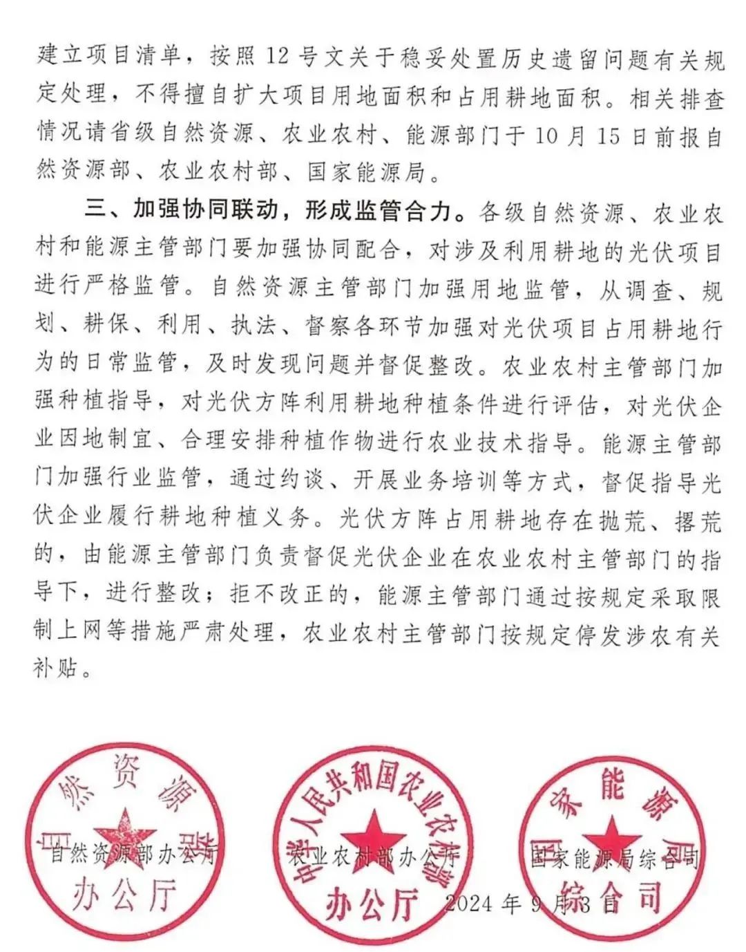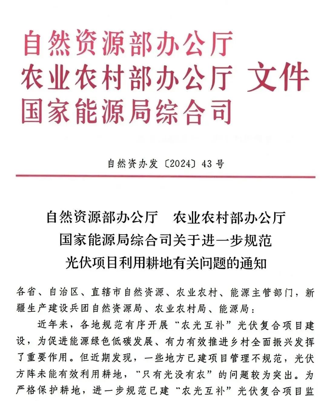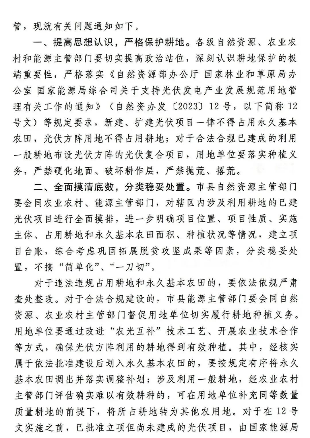 2024年9月(yue),自然資源部、農業(ye)農村部、國家能源局(ju)聯合發布《關于進一步規范光伏項目利用耕地(di)有關問題的通知(zhi)》,該文件于日前獲得公開(kai)。 文件指出(chu)(chu),一些地(di)方已建(jian)項(xiang)目管理不規范,光伏方陣未能有(you)效利(li)用耕地(di),“只(zhi)有(you)光沒(mei)有(you)農”的問題較(jiao)為突出(chu)(chu),將進一步規范已建(jian)“農光互(hu)補”光伏復合項(xiang)目進行監管。 文(wen)件要(yao)(yao)求,對于合法合規已建成(cheng)的利用一般耕(geng)(geng)地布設光(guang)伏(fu)方(fang)陣的光(guang)伏(fu)復合項(xiang)目(mu),用地單(dan)位要(yao)(yao)落實(shi)種植(zhi)義務,嚴禁硬化地面、破壞耕(geng)(geng)作(zuo)層,嚴禁拋荒、撂荒。 市縣(xian)級(ji)主管部(bu)門要對轄(xia)區內涉及利用(yong)耕地(di)的已建光伏項(xiang)目(mu)進行(xing)全面摸排,進一步明確項(xiang)目(mu)位置、項(xiang)目(mu)性質、實施(shi)主體、占(zhan)用(yong)耕地(di)和永(yong)久基本農田面積、種植狀(zhuang)況(kuang)等(deng)情況(kuang);建立項(xiang)目(mu)臺(tai)賬,綜合考慮鞏固拓展脫貧攻堅成(cheng)果(guo)等(deng)因素(su),分類穩(wen)妥(tuo)處(chu)置,不搞“簡單化”、“一刀(dao)切”。 對(dui)(dui)于違(wei)(wei)法違(wei)(wei)規占用(yong)耕(geng)地(di)和永(yong)久基(ji)本(ben)農田的(de),要(yao)依法依規嚴肅查處整(zheng)改。對(dui)(dui)于占用(yong)永(yong)久基(ji)本(ben)農田的(de),有序調(diao)出但(dan)要(yao)落實調(diao)整(zheng)補(bu)劃;涉(she)及一般(ban)耕(geng)地(di)的(de),則(ze)將耕(geng)地(di)轉為(wei)其他(ta)農用(yong)地(di),但(dan)要(yao)落實占補(bu)平衡。 文件(jian)強(qiang)調,對涉(she)及利用耕地(di)的光(guang)伏項目(mu)進(jin)行(xing)嚴格監(jian)管。自然資源主(zhu)管部門加強(qiang)用地(di)監(jian)管,從調查、規(gui)劃、耕保、利用、執法、督察各(ge)環節加強(qiang)對光(guang)伏項目(mu)占用耕地(di)行(xing)為的日常(chang)監(jian)管。 光伏(fu)方陣(zhen)占用耕地存在(zai)(zai)拋荒(huang)、荒(huang)的,由能源主(zhu)管(guan)部門負責督促光伏(fu)企業在(zai)(zai)農(nong)業農(nong)村主(zhu)管(guan)部門的指導下,進行整改;拒不(bu)改正的,能源主(zhu)管(guan)部門通過按(an)規定采(cai)取限制(zhi)上網等措施嚴肅(su)處(chu)理,農(nong)業農(nong)村主(zhu)管(guan)部門按(an)規定停發涉農(nong)有關補(bu)貼。 原文(wen)見(jian)下: