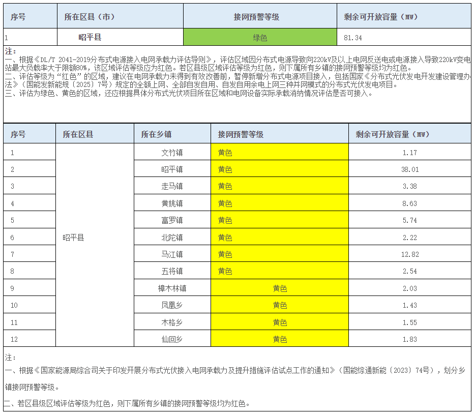 日(ri)前,廣(guang)西昭平縣(xian)(xian)公布2025年第三季度分布式光伏(fu)接(jie)入電網承載(zai)能力(li)評估信息,根據(ju)測算結果,全縣(xian)(xian)剩(sheng)余可開放(fang)容量81.34MW,接(jie)網預警等級為綠色,具體到各(ge)鄉(xiang)鎮(zhen),全縣(xian)(xian)12個鄉(xiang)鎮(zhen)為黃(huang)色。