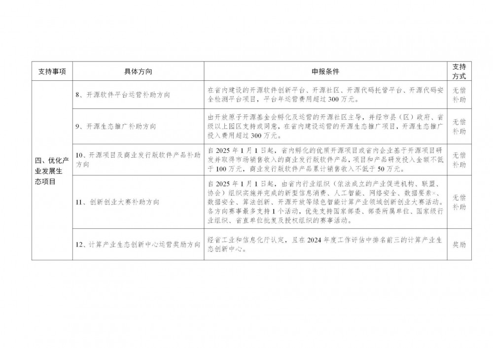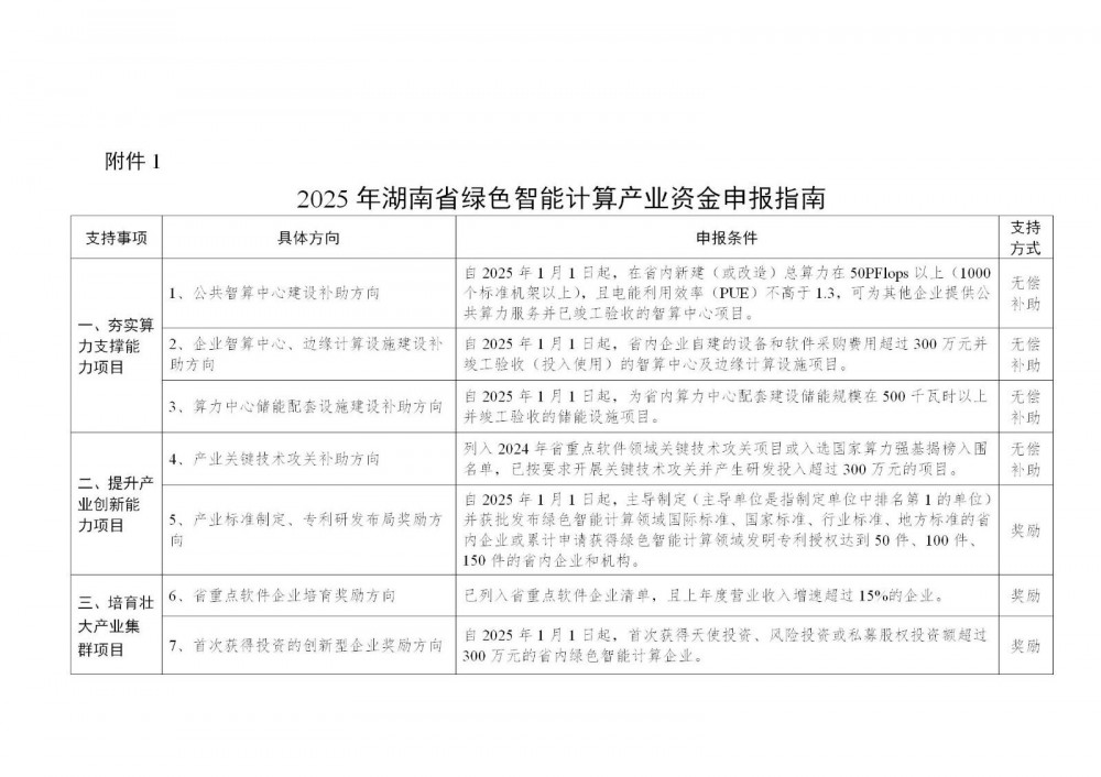 蓋錫(xi)新能(neng)源網獲(huo)悉,近日,湖南省工業和(he)信息化廳發布關于做(zuo)好(hao)2025年綠色(se)智能(neng)計(ji)算(suan)產業資金(jin)項(xiang)目申報(bao)工作的通(tong)知,包括(kuo)智算(suan)中(zhong)心建(jian)設(she)(改(gai)造)及企業邊(bian)緣計(ji)算(suan)設(she)施建(jian)設(she)、算(suan)力中(zhong)心配套儲能(neng)設(she)施建(jian)設(she)。 原文如下: 關于做好2025年綠色智能計算產業資金項目申報工作的通知 湘(xiang)工信信軟〔2025〕260號 各(ge)市州(zhou)、財(cai)政省直管縣市工(gong)業和(he)信息(xi)化部門(men)、財(cai)政部門(men): 為搶抓(zhua)綠(lv)色(se)智能(neng)計算(suan)(suan)(suan)產業(ye)(ye)發(fa)(fa)展戰略機(ji)遇,因(yin)地制宜發(fa)(fa)展新質(zhi)生產力,積(ji)蓄引領構建現代化產業(ye)(ye)體系的強(qiang)勁(jing)動(dong)能(neng),加快打造國(guo)家綠(lv)色(se)智能(neng)計算(suan)(suan)(suan)產業(ye)(ye)先(xian)導區,根據(ju)《湖(hu)南(nan)省促(cu)進綠(lv)色(se)智能(neng)計算(suan)(suan)(suan)產業(ye)(ye)高(gao)(gao)質(zhi)量發(fa)(fa)展若干政策措施》、《湖(hu)南(nan)省先(xian)進制造業(ye)(ye)高(gao)(gao)地建設專項資(zi)金(jin)管理辦法》等規定(ding),現就做好2025年(nian)綠(lv)色(se)智能(neng)計算(suan)(suan)(suan)產業(ye)(ye)資(zi)金(jin)項目(mu)申報工(gong)作有關事項通知如下(xia)。 一、支持方向 (一)夯實算(suan)(suan)力支撐能力。智算(suan)(suan)中心建設(改造)及企業(ye)邊緣計(ji)算(suan)(suan)設施建設、算(suan)(suan)力中心配套(tao)儲(chu)能設施建設。 (二)提升產業(ye)創新(xin)水平。綠色智(zhi)能計算產業(ye)領域關(guan)鍵核心技術攻(gong)關(guan)、相關(guan)標準制定、發明專利研發布局及成果轉化。 (三)培育壯大產(chan)業(ye)集(ji)群。綠色智能計(ji)算產(chan)業(ye)領域創新型(xing)中小微(wei)企(qi)業(ye)培育、省(sheng)重點(dian)軟件企(qi)業(ye)發展。 (四)優化(hua)產業(ye)(ye)(ye)(ye)發展生態(tai)。產業(ye)(ye)(ye)(ye)生態(tai)創新(xin)中心建設、產業(ye)(ye)(ye)(ye)創新(xin)創業(ye)(ye)(ye)(ye)活動(dong)、開(kai)源平(ping)臺建設運營、開(kai)源生態(tai)推(tui)廣(guang)及開(kai)源項目(mu)研發布局(ju)等。 (五)推進重(zhong)大(da)工作事項。優先支持省(sheng)委省(sheng)政府明確的重(zhong)大(da)工作和重(zhong)點事項。 具體申(shen)(shen)報(bao)(bao)方向見《2025年(nian)湖南省綠色智能計算產業資金申(shen)(shen)報(bao)(bao)指南》(附件1)。 二、申報條件 (一)申(shen)報單位(wei)(wei)。申(shen)報單位(wei)(wei)在湖(hu)南省內(nei)依(yi)法注冊,一般應具(ju)有(you)獨(du)立(li)(li)(li)法人資格,或(huo)者在湖(hu)南設立(li)(li)(li)獨(du)立(li)(li)(li)核(he)算并納入最小法人統(tong)計(ji)的(de)(de)分公(gong)司(si)或(huo)子(zi)公(gong)司(si),以及符合申(shen)報條件的(de)(de)機(ji)構(gou)或(huo)事(shi)業單位(wei)(wei)。申(shen)報單位(wei)(wei)具(ju)有(you)健(jian)全的(de)(de)財(cai)務管(guan)理(li)機(ji)構(gou)和制度(du),能夠嚴(yan)格落實資金管(guan)理(li)要求,積極配合做(zuo)好調查、調度(du)、績效評價(jia)等(deng)工作,具(ju)有(you)良好信用。 (二(er))申報項目(mu)。符合(he)國家產業政策和(he)有關法律法規(gui),預期經濟社會效益較好,具有較強(qiang)的示范(fan)帶(dai)動作用。 (三)不(bu)符合申(shen)報條件的主要情況 1.獲得(de)往(wang)年制(zhi)造強省(sheng)(先進(jin)制(zhi)造業高地建設(she))專(zhuan)項(xiang)(xiang)資(zi)(zi)金(jin)支持需要驗收(shou)的項(xiang)(xiang)目,目前尚(shang)未通(tong)過驗收(shou)(未在系統中提交并通(tong)過審核)的單(dan)位;2023年、2024年連續兩年獲得(de)省(sheng)工(gong)業和(he)信息化廳(ting)專(zhuan)項(xiang)(xiang)資(zi)(zi)金(jin)項(xiang)(xiang)目補助(zhu)的單(dan)位;已(yi)經獲得(de)省(sheng)級(ji)專(zhuan)項(xiang)(xiang)資(zi)(zi)金(jin)補助(zhu)的項(xiang)(xiang)目;已(yi)經申報其他省(sheng)級(ji)專(zhuan)項(xiang)(xiang)資(zi)(zi)金(jin)的項(xiang)(xiang)目; 2.違反安全生產、環境(jing)保護等規定,使(shi)用國家明令禁(jin)止(zhi)的設備(bei)進行建(jian)設的項目; 3.項(xiang)目單位在績效(xiao)評價中未獲(huo)得通過,或在項(xiang)目調度(du)、經濟運行調度(du)等工作中不配合,造成不良影響的; 4.存在被(bei)列入信用湖(hu)南網失信名單或發生重(zhong)大數據安(an)全事件等(deng)其他(ta)嚴(yan)重(zhong)問題的(de)單位; 5.國家和省級文件(jian)明(ming)確不(bu)得重復申報財政資(zi)金的各類項目(mu)。 三、申報程序 (一)市(shi)(shi)州(zhou)項(xiang)目(mu)。由市(shi)(shi)州(zhou)工(gong)業(ye)和信息化局(ju)(ju)(ju)牽頭組織相(xiang)應專題方向項(xiang)目(mu)的(de)申報、初(chu)審等工(gong)作,市(shi)(shi)州(zhou)財(cai)政(zheng)局(ju)(ju)(ju)配合開展相(xiang)關(guan)工(gong)作。市(shi)(shi)州(zhou)工(gong)業(ye)和信息化局(ju)(ju)(ju)、財(cai)政(zheng)局(ju)(ju)(ju)聯(lian)合行文上報省工(gong)業(ye)和信息化廳(ting)。 (二)財政省直(zhi)管縣市項(xiang)目。由(you)縣市工(gong)業和信息化部門、財政局參照市州(zhou)項(xiang)目的組織方(fang)式,聯(lian)合行文(wen)上(shang)報(bao)省工(gong)業和信息化廳(ting),同時抄報(bao)所(suo)在市州(zhou)工(gong)業和信息化局、財政局。 (三)中(zhong)央(yang)在(zai)湘單(dan)位和省屬單(dan)位項目(mu)。按照屬地管理(li)原則,通過所在(zai)地進行(xing)申(shen)報(bao)。 四、申報要求 (一)項目資料。 1.項(xiang)目(mu)資料原則上(shang)(shang)(shang)采(cai)取網上(shang