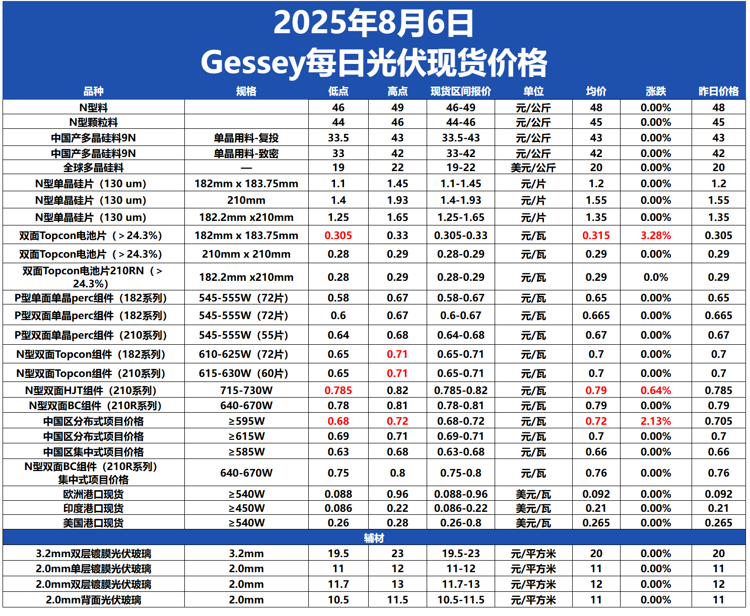 現貨市場價格變動: 多晶硅: 今日硅(gui)料(liao)(liao)(liao)價(jia)(jia)(jia)(jia)格(ge)整體(ti)維穩,N型(xing)(xing)料(liao)(liao)(liao)主流(liu)價(jia)(jia)(jia)(jia)格(ge)在(zai)46-49元(yuan)(yuan)/公(gong)(gong)(gong)斤(jin),均(jun)(jun)價(jia)(jia)(jia)(jia)48元(yuan)(yuan)/公(gong)(gong)(gong)斤(jin)。N型(xing)(xing)顆(ke)粒(li)硅(gui)主流(liu)價(jia)(jia)(jia)(jia)格(ge)在(zai)44-46元(yuan)(yuan)/公(gong)(gong)(gong)斤(jin),均(jun)(jun)價(jia)(jia)(jia)(jia)45元(yuan)(yuan)/公(gong)(gong)(gong)斤(jin)。國產(chan)復(fu)投特(te)級(ji)硅(gui)料(liao)(liao)(liao)主流(liu)價(jia)(jia)(jia)(jia)格(ge)在(zai)33.5-43元(yuan)(yuan)/公(gong)(gong)(gong)斤(jin),均(jun)(jun)價(jia)(jia)(jia)(jia)43元(yuan)(yuan)/公(gong)(gong)(gong)斤(jin),國產(chan)致密特(te)級(ji)硅(gui)料(liao)(liao)(liao)主流(liu)價(jia)(jia)(jia)(jia)格(ge)在(zai)33-42元(yuan)(yuan)/公(gong)(gong)(gong)斤(jin),均(jun)(jun)價(jia)(jia)(jia)(jia)42元(yuan)(yuan)/公(gong)(gong)(gong)斤(jin)。全球多晶硅(gui)料(liao)(liao)(liao)主流(liu)價(jia)(jia)(jia)(jia)格(ge)在(zai)19-22元(yuan)(yuan)/公(gong)(gong)(gong)斤(jin),均(jun)(jun)價(jia)(jia)(jia)(jia)20元(yuan)(yuan)/公(gong)(gong)(gong)斤(jin)。 硅片: 今日硅片(pian)(pian)(pian)價(jia)(jia)格(ge)整體維穩,N型-183.75mm單(dan)晶(jing)硅片(pian)(pian)(pian)主(zhu)流(liu)現(xian)貨(huo)價(jia)(jia)格(ge)維持(chi)1.1-1.45元(yuan)(yuan)/片(pian)(pian)(pian),均(jun)價(jia)(jia)1.2元(yuan)(yuan)/片(pian)(pian)(pian)。N型-210mm單(dan)晶(jing)硅片(pian)(pian)(pian)主(zhu)流(liu)現(xian)貨(huo)價(jia)(jia)格(ge)維持(chi)1.4-1.93元(yuan)(yuan)/片(pian)(pian)(pian),均(jun)價(jia)(jia)1.55元(yuan)(yuan)/片(pian)(pian)(pian)。N型-210Rmm單(dan)晶(jing)硅片(pian)(pian)(pian)主(zhu)流(liu)現(xian)貨(huo)價(jia)(jia)格(ge)1.25-1.65元(yuan)(yuan)/片(pian)(pian)(pian),均(jun)價(jia)(jia)1.35元(yuan)(yuan)/片(pian)(pian)(pian)。 電池片: 今日電池(chi)片價(jia)(jia)格(ge)(ge)小(xiao)幅上(shang)漲,24.3%以上(shang)183.75mm雙面Topcon電池(chi)片主流價(jia)(jia)格(ge)(ge)在0.305-0.33元/瓦,均價(jia)(jia)0.315元/瓦,上漲3.28%。24.3%以上210mm雙(shuang)面Topcon電池(chi)片主流(liu)價(jia)格在(zai)0.28-0.29元(yuan)/瓦,均價(jia)0.29元(yuan)/瓦。24.3%以上210Rmm雙(shuang)面Topcon電池(chi)片主流(liu)價(jia)格在(zai)0.28-0.29元(yuan)/瓦,均價(jia)0.29元(yuan)/瓦。 組件: 今日(ri)組(zu)(zu)(zu)件(jian)價(jia)(jia)格(ge)(ge)小(xiao)幅上漲,雙(shuang)(shuang)面單晶perc組(zu)(zu)(zu)件(jian)(182系(xi)(xi)(xi)列(lie))價(jia)(jia)格(ge)(ge)在0.6-0.67元(yuan)/ 瓦(wa)(wa),均(jun)價(jia)(jia)為(wei)(wei)0.665元(yuan)/瓦(wa)(wa)。雙(shuang)(shuang)面單晶perc組(zu)(zu)(zu)件(jian)(210系(xi)(xi)(xi)列(lie))價(jia)(jia)格(ge)(ge)在0.64-0.68元(yuan)/ 瓦(wa)(wa),均(jun)價(jia)(jia)為(wei)(wei)0.67元(yuan)/瓦(wa)(wa)。N型(xing)(xing)雙(shuang)(shuang)面Topcon 組(zu)(zu)(zu)件(jian)(182系(xi)(xi)(xi)列(lie))價(jia)(jia)格(ge)(ge)在0.65-0.71元(yuan)/ 瓦(wa)(wa),均(jun)價(jia)(jia)為(wei)(wei)0.7元(yuan)/瓦(wa)(wa)。N型(xing)(xing)雙(shuang)(shuang)面Topcon 組(zu)(zu)(zu)件(jian)(210系(xi)(xi)(xi)列(lie))價(jia)(jia)格(ge)(ge)在0.65-0.71元(yuan)/ 瓦(wa)(wa),均(jun)價(jia)(jia)為(wei)(wei)0.7元(yuan)/瓦(wa)(wa)。N型(xing)(xing)雙(shuang)(shuang)面HJT組(zu)(zu)(zu)件(jian)(210系(xi)(xi)(xi)列(lie))價(jia)(jia)格(ge)(ge)在0.785-0.82元(yuan)/ 瓦(wa)(wa),均(jun)價(jia)(jia)為(wei)(wei)0.79元(yuan)/瓦(wa)(wa),上漲0.64%。N型雙面(mian)BC組件(210R系列)價格在0.78-0.81元/ 瓦,均(jun)價為(wei)(wei)0.79元/瓦。中國區分布式項目(≥595W)價格在0.68-0.72元/瓦,均(jun)價為(wei)(wei)0.72元/瓦,上漲2.13%,中國區分布式(shi)(shi)項目(≥615W)價(jia)格(ge)(ge)在(zai)0.69-0.71元(yuan)/瓦,均(jun)(jun)價(jia)為(wei)0.7元(yuan)/瓦,中國區集中式(shi)(shi)項目(≥585W)價(jia)格(ge)(ge)在(zai)0.63-0.68元(yuan)/ 瓦,均(jun)(jun)價(jia)為(wei)0.66元(yuan)/瓦。N型雙(shuang)面BC組(zu)件(210R系列)集中式(shi)(shi)項目價(jia)格(ge)(ge)在(zai)0.75-0.8元(yuan)/ 瓦,均(jun)(jun)價(jia)為(wei)0.76元(yuan)/瓦。歐洲港(gang)口(kou)現貨(huo)(huo)價(jia)格(ge)(ge)在(zai)0.088-0.96美(mei)(mei)元(yuan)/ 瓦,均(jun)(jun)價(jia)為(wei)0.092美(mei)(mei)元(yuan)/瓦。印(yin)度港(gang)口(kou)現貨(huo)(huo)價(jia)格(ge)(ge)在(zai)0.086-0.22美(mei)(mei)元(yuan)/ 瓦,均(jun)(jun)價(jia)為(wei)0.21美(mei)(mei)元(yuan)/瓦。美(mei)(mei)國港(gang)口(kou)現貨(huo)(huo)價(jia)格(ge)(ge)在(zai)0.26-0.28美(mei)(mei)元(yuan)/ 瓦,均(jun)(jun)價(jia)為(wei)0.265美(mei)(mei)元(yuan)/瓦。 玻璃: 今日玻(bo)(bo)璃(li)價(jia)格整體(ti)維(wei)穩,3.2mm雙(shuang)層鍍膜光伏(fu)玻(bo)(bo)璃(li)價(jia)格在(zai)(zai)19.5-23元(yuan)(yuan)(yuan)/平(ping)(ping)方(fang)(fang)米,均價(jia)為(wei)(wei)(wei)20元(yuan)(yuan)(yuan)/平(ping)(ping)方(fang)(fang)米。2.0mm單層鍍膜光伏(fu)玻(bo)(bo)璃(li)價(jia)格在(zai)(zai)11-12元(yuan)(yuan)(yuan)/平(ping)(ping)方(fang)(fang)米,均價(jia)為(wei)(wei)(wei)11元(yuan)(yuan)(yuan)/平(ping)(ping)方(fang)(fang)米。2.0mm雙(shuang)層鍍膜光伏(fu)玻(bo)(bo)璃(li)價(jia)格在(zai)(zai)11.7-13元(yuan)(yuan)(yuan)/平(ping)(ping)方(fang)(fang)米,均價(jia)為(wei)(wei)(wei)12元(yuan)(yuan)(yuan)/平(ping)(ping)方(fang)(fang)米。2.0mm背(bei)面(mian)光伏(fu)玻(bo)(bo)璃(li)價(jia)格在(zai)(zai)10.5-11.5元(yuan)(yuan)(yuan)/平(ping)(ping)方(fang)(fang)米,均價(jia)為(wei)(wei)(wei)11元(yuan)(yuan)(yuan)/平(ping)(ping)方(fang)(fang)米。 聚焦每日行情波動: 今日電(dian)池(chi)片價(jia)格(ge)小幅上(shang)漲,24.3%以上(shang)183.75mm雙面Topcon電(dian)池(chi)片主流(liu)價(jia)格(ge