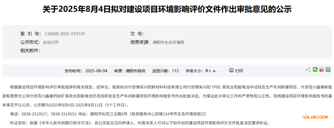 8月4日,四(si)川(chuan)德陽(yang)市生(sheng)(sheng)態環境局發(fa)布關于什邡(fang)博采興陽(yang) TPBC 高(gao)效太陽(yang)能電池中試線及(ji)生(sheng)(sheng)產車間新建(jian)項目(mu)和什邡(fang)百川(chuan)鑫雍鈣(gai)鈦礦高(gao)效太陽(yang)能電池示范線研發(fa)及(ji)生(sheng)(sheng)產車間新建(jian)項目(mu)的環評(ping)審批公示。 公示顯示,什邡博(bo)采興陽(yang)(yang)TPBC高(gao)效太陽(yang)(yang)能(neng)電(dian)池中試線及生(sheng)產車(che)間新建(jian)項目由什邡博(bo)采興陽(yang)(yang)新材料科(ke)技有(you)限(xian)公司負責(ze)建(jian)設(she)。 該項目將(jiang)租用四川(chuan)德陽(yang)什邡市經濟開發區(qu)(北區(qu))燕(yan)山(shan)路23號廠房,依托(tuo)博海新能(neng)(neng)源(德陽(yang))有限公司(si)太陽(yang)能(neng)(neng)電(dian)(dian)池片(pian)生產的公輔設施,新建高(gao)效太陽(yang)能(neng)(neng)電(dian)(dian)池中試研發及(ji)生產線2條(功能(neng)(neng)和用途相(xiang)同(tong))。 其中(zhong),該項目新建高(gao)效(xiao)太陽(yang)能電(dian)(dian)池的中(zhong)試(shi)研(yan)發時間約(yue)2年,中(zhong)試(shi)研(yan)發線將直接轉為(wei)生產線實施量產,設計年產1.4GW的高(gao)效(xiao)硅太陽(yang)能電(dian)(dian)池。 什邡百川(chuan)鑫(xin)雍鈣鈦(tai)礦高效(xiao)太陽能電池示范線研發及生產車(che)間新(xin)建項(xiang)目則由(you)什邡百川(chuan)鑫(xin)雍新(xin)能源(yuan)有限責任公司負責建設。 該項目將租用(yong)四川德陽什邡經(jing)濟(ji)開(kai)發(fa)區藍(lan)天大道與燕山路(lu)交(jiao)界處(chu)廠房,依(yi)托(tuo)博(bo)海新(xin)能源(yuan)(德陽)有(you)限公司太陽能電(dian)池(chi)片生產的公輔(fu)設(she)施,新(xin)建(jian)高效太陽能電(dian)池(chi)中(zhong)試研發(fa)及生產線2條(功能和(he)用(yong)途相同)。 該項目新建的高(gao)效太陽能電池中試研(yan)(yan)發期約5年,研(yan)(yan)發完成后實施量產,量產能力(li)為(wei)200MWp/a鈣鈦礦疊層(ceng)太陽能電池。