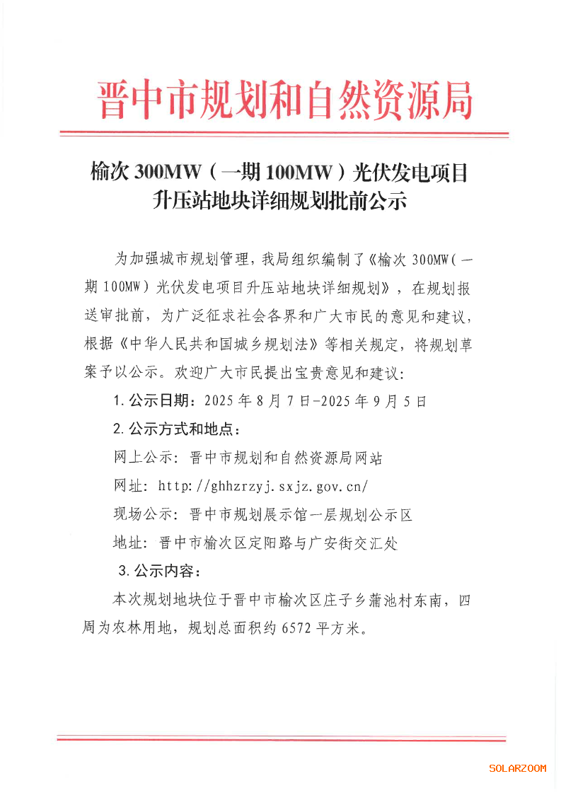 山西榆次300MW(一期100MW)光伏發電項目詳細規劃批前公示