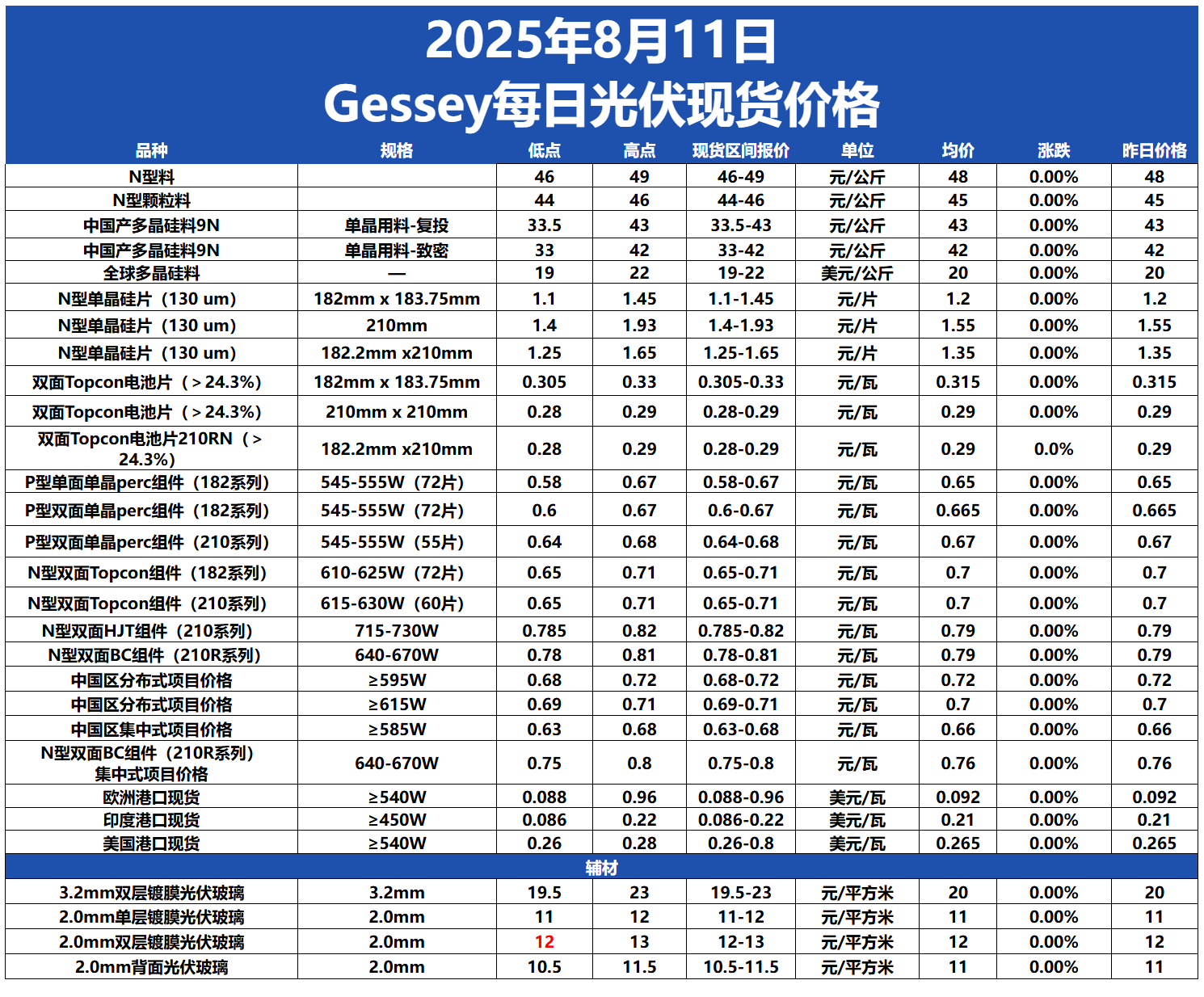 Gessey:8月11日每日光伏市場行情2025-08-11 18:51來源(yuan):gessey瀏覽數:260次