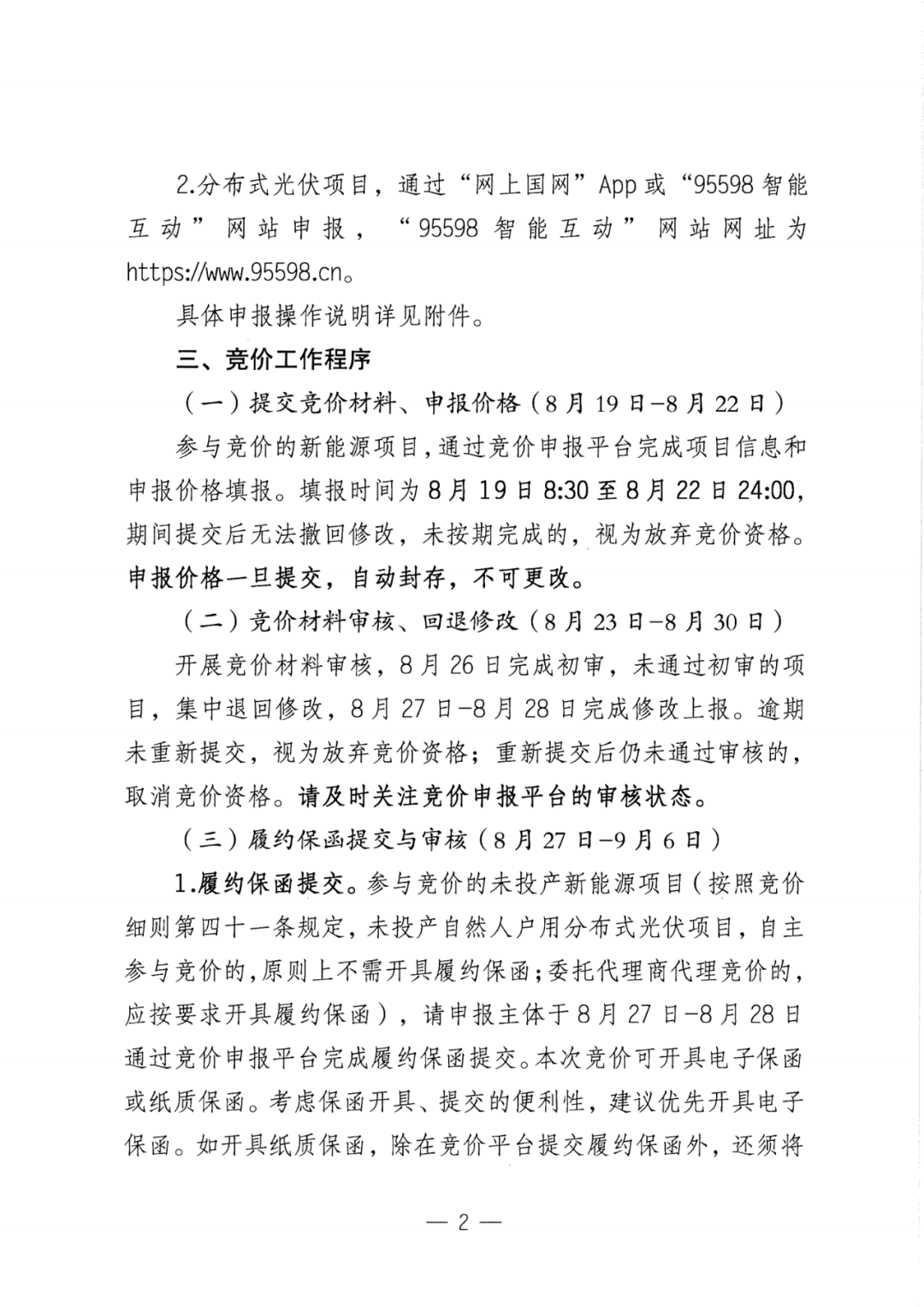 8月11日(ri),山(shan)(shan)東電網公(gong)司印(yin)發《2025年山(shan)(shan)東省新(xin)能源機制(zhi)電價競(jing)價組(zu)織公(gong)告(gao)》,具體日(ri)程如下: 提交競價材料、申報價格(8月19日-8月22日) 參與(yu)競價(jia)的(de)新能源項目,通過競價(jia)申(shen)報(bao)平臺完成(cheng)(cheng)項目信(xin)息和申(shen)報(bao)價(jia)格填報(bao)。填報(bao)時間為8月(yue)19日8:30至8月(yue)22日24:00,期間提(ti)交(jiao)后(hou)無(wu)法撤(che)回修改,未按期完成(cheng)(cheng)的(de),視(shi)為放棄競價(jia)資格。申(shen)報(bao)價(jia)格一旦提(ti)交(jiao),自動封存,不可更改。 競價材料審核、回退修改(8月23日-8月30日) 開展競價材料(liao)審核,8月(yue)(yue)26日(ri)完成(cheng)初審,未(wei)通(tong)過初審的(de)項目,集中退回修改(gai),8月(yue)(yue)27日(ri)-8月(yue)(yue)28日(ri)完成(cheng)修改(gai)上(shang)報(bao)。逾期未(wei)重新提交,視為放棄競價資格;重新提交后(hou)仍未(wei)通(tong)過審核的(de),取消競價資格。請及時關(guan)注競價申(shen)報(bao)平臺的(de)審核狀態。 履約保函提交與審核(8月27日-9月6日) 1.履(lv)(lv)約保(bao)(bao)(bao)(bao)函(han)(han)(han)提(ti)(ti)交(jiao)。參與競(jing)(jing)價(jia)(jia)(jia)(jia)的(de)(de)未(wei)投產新能源項目(按照競(jing)(jing)價(jia)(jia)(jia)(jia)細則(ze)第四十一條規定,未(wei)投產自(zi)然人(ren)戶用分(fen)布式光(guang)伏項目,自(zi)主參與競(jing)(jing)價(jia)(jia)(jia)(jia)的(de)(de),原則(ze)上(shang)不需(xu)開(kai)具履(lv)(lv)約保(bao)(bao)(bao)(bao)函(han)(han)(han);委(wei)托代理商代理競(jing)(jing)價(jia)(jia)(jia)(jia)的(de)(de),應按要求(qiu)開(kai)具履(lv)(lv)約保(bao)(bao)(bao)(bao)函(han)(han)(han)),請申(shen)報主體于8月(yue)(yue)27日-8月(yue)(yue)28日通過競(jing)(jing)價(jia)(jia)(jia)(jia)申(shen)報平臺(tai)完(wan)(wan)成履(lv)(lv)約保(bao)(bao)(bao)(bao)函(han)(han)(han)提(ti)(ti)交(jiao)。本次競(jing)(jing)價(jia)(jia)(jia)(jia)可開(kai)具電子(zi)保(bao)(bao)(bao)(bao)函(han)(han)(han)或紙(zhi)質(zhi)保(bao)(bao)(bao)(bao)函(han)(han)(han)。考慮(lv)保(bao)(bao)(bao)(bao)函(han)(han)(han)開(kai)具、提(ti)(ti)交(jiao)的(de)(de)便(bian)利性,建議優先開(kai)具電子(zi)保(bao)(bao)(bao)(bao)函(han)(han)(han)。如開(kai)具紙(zhi)質(zhi)保(bao)(bao)(bao)(bao)函(han)(han)(han),除(chu)在競(jing)(jing)價(jia)(jia)(jia)(jia)平臺(tai)提(ti)(ti)交(jiao)履(lv)(lv)約保(bao)(bao)(bao)(bao)函(han)(han)(han)外,還須(xu)將(jiang)原件于8月(yue)(yue)27日-8月(yue)(yue)28日現場交(jiao)至競(jing)(jing)價(jia)(jia)(jia)(jia)工作組。期間提(ti)(ti)交(jiao)后無法撤回修改,未(wei)按期完(wan)(wan)成的(de)(de),視為放棄競(jing)(jing)價(jia)(jia)(jia)(jia)資(zi)格。 2.履約保(bao)(bao)函(han)審(shen)核、回(hui)(hui)退(tui)修改(gai)(gai)(gai)。9月(yue)1日完(wan)成履約保(bao)(bao)函(han)初審(shen),未(wei)通過(guo)初審(shen)的(de)(de)項目,集中退(tui)回(hui)(hui)修改(gai)(gai)(gai),9月(yue)2日-9月(yue)3日完(wan)成修改(gai)(gai)(gai)上報(bao)。如需(xu)修改(gai)(gai)(gai)紙質保(bao)(bao)函(han),請(qing)申報(bao)主體攜帶(dai)簽字蓋(gai)章(zhang)后(hou)的(de)(de)保(bao)(bao)函(han)退(tui)回(hui)(hui)申請(qing)(模(mo)板詳見附件6),現(xian)(xian)場取回(hui)(hui)保(bao)(bao)函(han)原件,并于9月(yue)2日-9月(yue)3日工作時間內現(xian)(xian)場重(zhong)新(xin)提(ti)交(jiao)。逾期未(wei)重(zhong)新(xin)提(ti)交(jiao),視為放棄競價(jia)(jia)資格;重(zhong)新(xin)提(ti)交(jiao)后(hou)仍(reng)未(wei)通過(guo)審(shen)核的(de)(de),取消(xiao)競價(jia)(jia)資格。請(qing)及時關注競價(jia)(jia)申報(bao)平臺(tai)的(de)(de)審(shen)核狀態。 公示競價結果 價(jia)格出清結束后,在“新能(neng)源(yuan)云”網站、“95598智能(neng)互動”網站對出清的(de)項目(mu)名(ming)稱、項目(mu)類型、機(ji)制(zhi)電量比例、機(ji)制(zhi)電價(jia)標準等信息進(jin)行公示,公示期3個工作日。 原文如下: