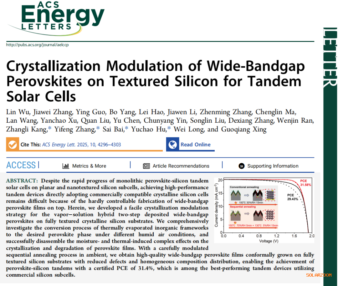 8月11日(ri),通(tong)威股份光伏技術中心鈣(gai)鈦礦(kuang)研發(fa)團隊在能(neng)(neng)源領域頂尖學術期刊《ACS Energy Letters》上(shang)發(fa)表了(le)最(zui)新(xin)研究(jiu)(jiu)成果。該研究(jiu)(jiu)以《Crystallization Modulation of Wide-Bandgap Perovskites on Textured Silicon for Tandem Solar Cells》為題,系統(tong)闡述了(le)寬帶隙鈣(gai)鈦礦(kuang)在制絨硅基底上(shang)的結(jie)晶調(diao)控(kong)機(ji)制,為提升疊(die)層太陽能(neng)(neng)電池(chi)性能(neng)(neng)提供了(le)創新(xin)解決方案(an)。 研究(jiu)團(tuan)隊完善了蒸鍍—溶液(ye)兩步法(fa)鈣鈦礦結晶成膜(mo)理論體系,為全制絨疊(die)層電池的均(jun)質化成膜(mo)難(nan)題(ti)提出了簡便有效的解決(jue)策略。通(tong)威為論文第(di)一署名單位,第(di)一作(zuo)者(zhe)為電池開發部高級工(gong)程(cheng)(cheng)師吳(wu)林博士(shi)(shi),通(tong)訊作(zuo)者(zhe)為該部門主任工(gong)程(cheng)(cheng)師胡逾超博士(shi)(shi)和張一峰博士(shi)(shi)。論文由通(tong)威與電子科技大學白(bai)賽教授團(tuan)隊合作(zuo)完成。 鈣鈦(tai)礦/硅疊(die)層太(tai)陽能電(dian)池(chi)因其突(tu)破性光電(dian)轉化(hua)效率潛力成(cheng)(cheng)為焦點。而(er)制(zhi)備(bei)(bei)疊(die)層電(dian)池(chi)的(de)核心(xin)挑戰(zhan)在于如何在晶(jing)硅子電(dian)池(chi)表(biao)面(mian)實現(xian)高質(zhi)量(liang)鈣鈦(tai)礦成(cheng)(cheng)膜。為兼(jian)容全制(zhi)絨(rong)商用晶(jing)硅電(dian)池(chi),通威(wei)采用蒸鍍-溶液兩(liang)步法成(cheng)(cheng)膜技術,但該路線在寬(kuan)帶(dai)隙鈣鈦(tai)礦薄膜制(zhi)備(bei)(bei)中面(mian)臨(lin)反應充分性、成(cheng)(cheng)分均勻性、絨(rong)面(mian)保型和高結晶(jing)度難以兼(jian)顧的(de)問(wen)題,制(zhi)約了疊(die)層電(dian)池(chi)效率提(ti)升。 通(tong)威鈣鈦(tai)礦(kuang)(kuang)團隊深入研(yan)究了(le)(le)(le)鈣鈦(tai)礦(kuang)(kuang)相變過程,揭(jie)示了(le)(le)(le)寬(kuan)帶隙鈣鈦(tai)礦(kuang)(kuang)的結晶(jing)動(dong)力學機(ji)理(li),明(ming)確了(le)(le)(le)濕(shi)、熱等外界條件對(dui)薄膜結晶(jing)和降解(jie)的影響機(ji)制(zhi),并創新提(ti)出(chu)順序結晶(jing)調制(zhi)策略。該方案通(tong)過可量產的工(gong)藝和設備,在(zai)全制(zhi)絨商用(yong)硅基底上制(zhi)備出(chu)成分(fen)均(jun)勻(yun)、缺陷減少的鈣鈦(tai)礦(kuang)(kuang)薄膜,最(zui)終實(shi)現(xian)31.58%(認證31.4%)的光(guang)電(dian)轉換效率,創下基于(yu)商用(yong)硅電(dian)池(chi)的疊(die)層電(dian)池(chi)最(zui)高紀錄。通(tong)威目前(qian)實(shi)驗室研(yan)發(fa)效率達到34.69%,210半片全尺(chi)寸(cun)電(dian)池(chi)效率達到27.52%,實(shi)現(xian)首件標(biao)準(zhun)版型疊(die)層組件下線,在(zai)2025年第三季度建成兆瓦級疊(die)層試(shi)驗線。