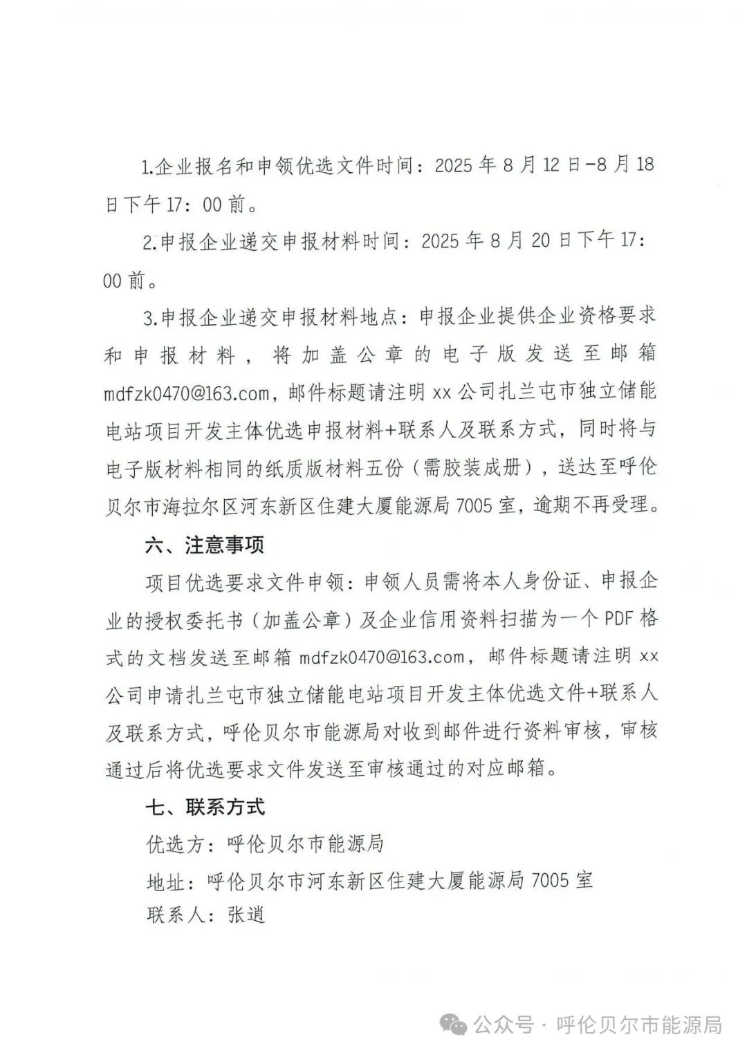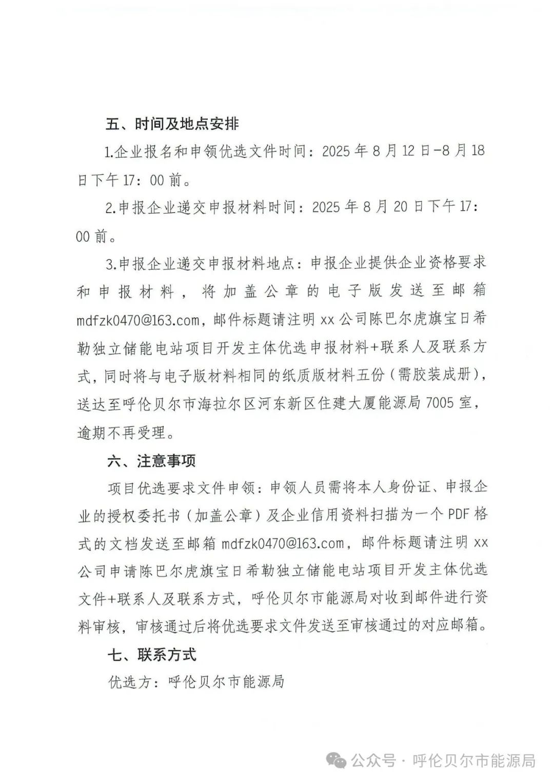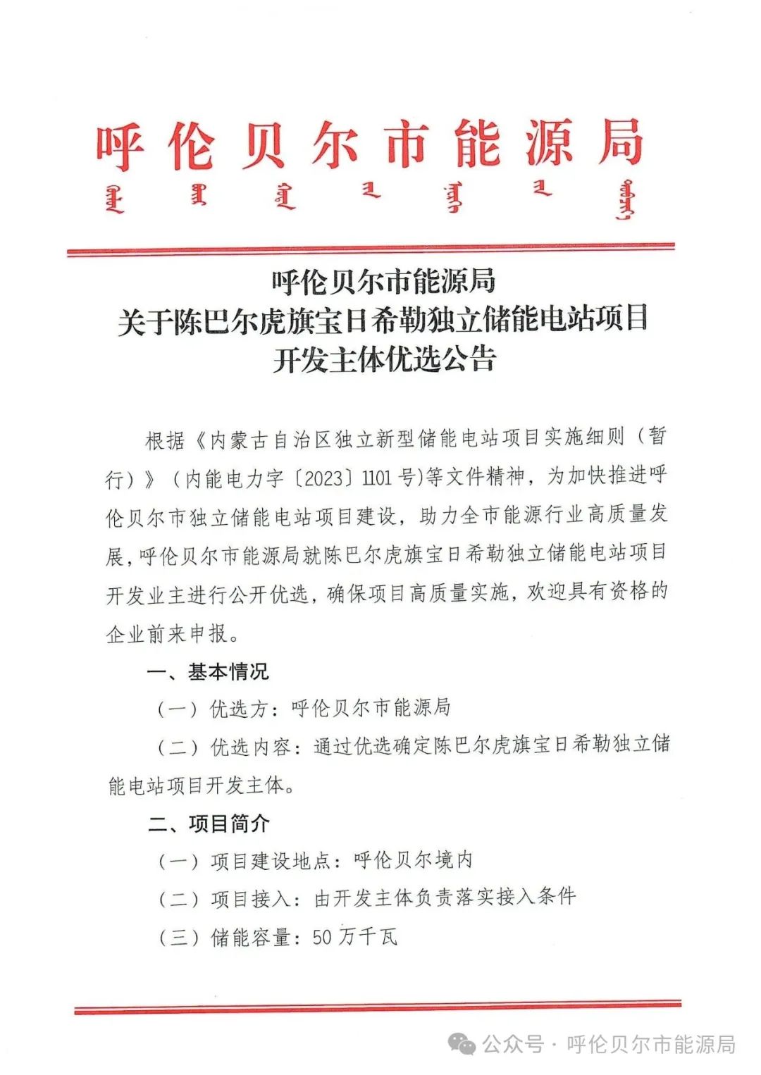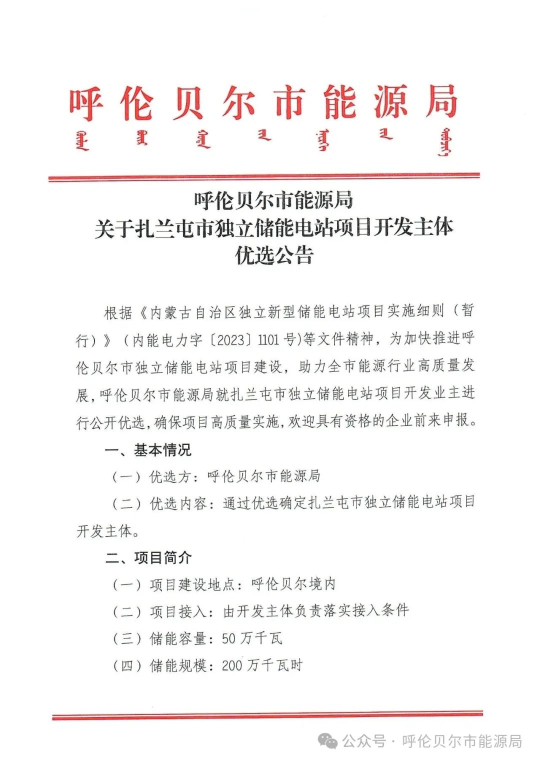 蓋錫新能(neng)源(yuan)(yuan)網獲悉,8月(yue)12日,內蒙古呼倫(lun)貝爾市(shi)能(neng)源(yuan)(yuan)局發(fa)布兩大獨立(li)儲能(neng)電(dian)站項(xiang)目投資開發(fa)主(zhu)體優(you)選,陳(chen)巴爾虎旗寶日希勒獨立(li)儲能(neng)電(dian)站和扎蘭屯市(shi)獨立(li)儲能(neng)電(dian)站,兩個項(xiang)目規模均(jun)為(wei)500MW/2000MWh,應用場景均(jun)為(wei)新能(neng)源(yuan)(yuan)場站調峰、促(cu)進相關新能(neng)源(yuan)(yuan)發(fa)電(dian)主(zhu)體提(ti)高(gao)利用率(lv)。 文(wen)件要求申(shen)報(bao)企業注冊資金(jin)在5億元以上,申(shen)報(bao)企業具(ju)有當地(di)配套產業優先。 原文如下: