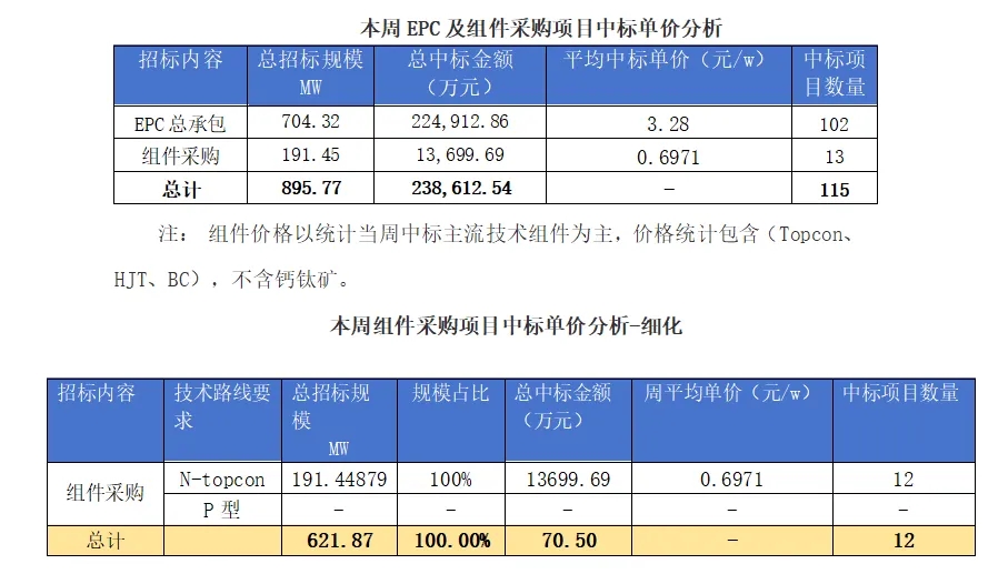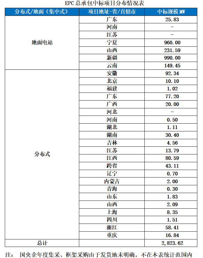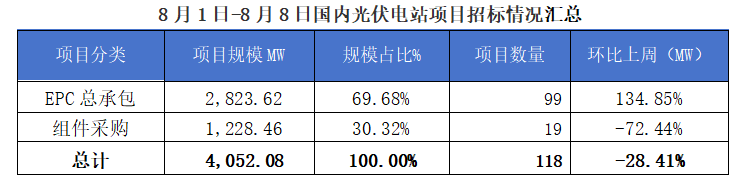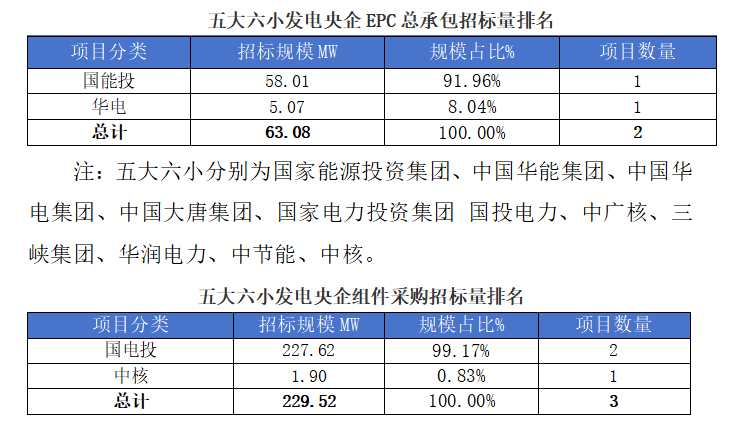 一、光伏項目招標情況匯總: 根據Gessey蓋錫咨詢(xun)統計,2025年(nian)8月1日-8月8日累計光(guang)伏(fu)招(zhao)(zhao)標項(xiang)(xiang)目為(wei)118個(ge),項(xiang)(xiang)目規(gui)模合計為(wei)4052.08253MW。光(guang)伏(fu)組件采(cai)購招(zhao)(zhao)標項(xiang)(xiang)目為(wei)19個(ge),招(zhao)(zhao)標規(gui)模為(wei)4,052.08MW,EPC總承包招(zhao)(zhao)標項(xiang)(xiang)目為(wei)99個(ge),招(zhao)(zhao)標規(gui)模為(wei)2823.61812MW。 我們統計包含大型央(yang)企(qi)國企(qi)、地方能源集(ji)團(tuan)、地方政府機(ji)關、兩大電網、央(yang)企(qi)總包企(qi)業、知名(ming)光伏企(qi)業等(deng),其中(zhong)五大六小(xiao)發電央(yang)企(qi)占總招標(biao)規模較(jiao)高,具體各企(qi)業排(pai)名(ming)如下(xia)表: 二、中標項目分布類型匯總情況 本(ben)周中(zhong)標(biao)項目需求按(an)照招標(biao)場景地(di)(di)(di)(di)分布(bu),分布(bu)式光伏(fu)主要(yao)(yao)集(ji)中(zhong)在甘肅(su)、山西、貴州(zhou)、安徽(hui)等地(di)(di)(di)(di)區,即主要(yao)(yao)集(ji)中(zhong)在東(dong)北部地(di)(di)(di)(di)區;集(ji)中(zhong)式光伏(fu)主要(yao)(yao)集(ji)中(zhong)在山東(dong)等地(di)(di)(di)(di)區,即主要(yao)(yao)集(ji)中(zhong)在華東(dong)地(di)(di)(di)(di)區。 三、EPC總承包及組件采購情況匯總 本月光伏EPC總承(cheng)包中(zhong)標規(gui)模達1194.21 MW,總中(zhong)標金額318736.27萬元,平(ping)均(jun)中(zhong)標單價為3.05元/W,中(zhong)標數量51個。 本月光(guang)伏組件采購(gou)中標(biao)規模達(da)621.87 MW,總中標(biao)金額70.5萬元(yuan),平均中標(biao)單價(jia)為0.71元(yuan)/W,中標(biao)數量12個(ge)。 上一篇: Gessey:8月14日每日光伏市場行情