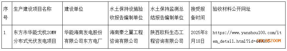 海南東方市水務局關于接受東方市華能戈枕20MW分布式光伏發電項目水土保持設施自主驗收報備的公告2025-08-19 16:22來源:gessey瀏覽數:150次