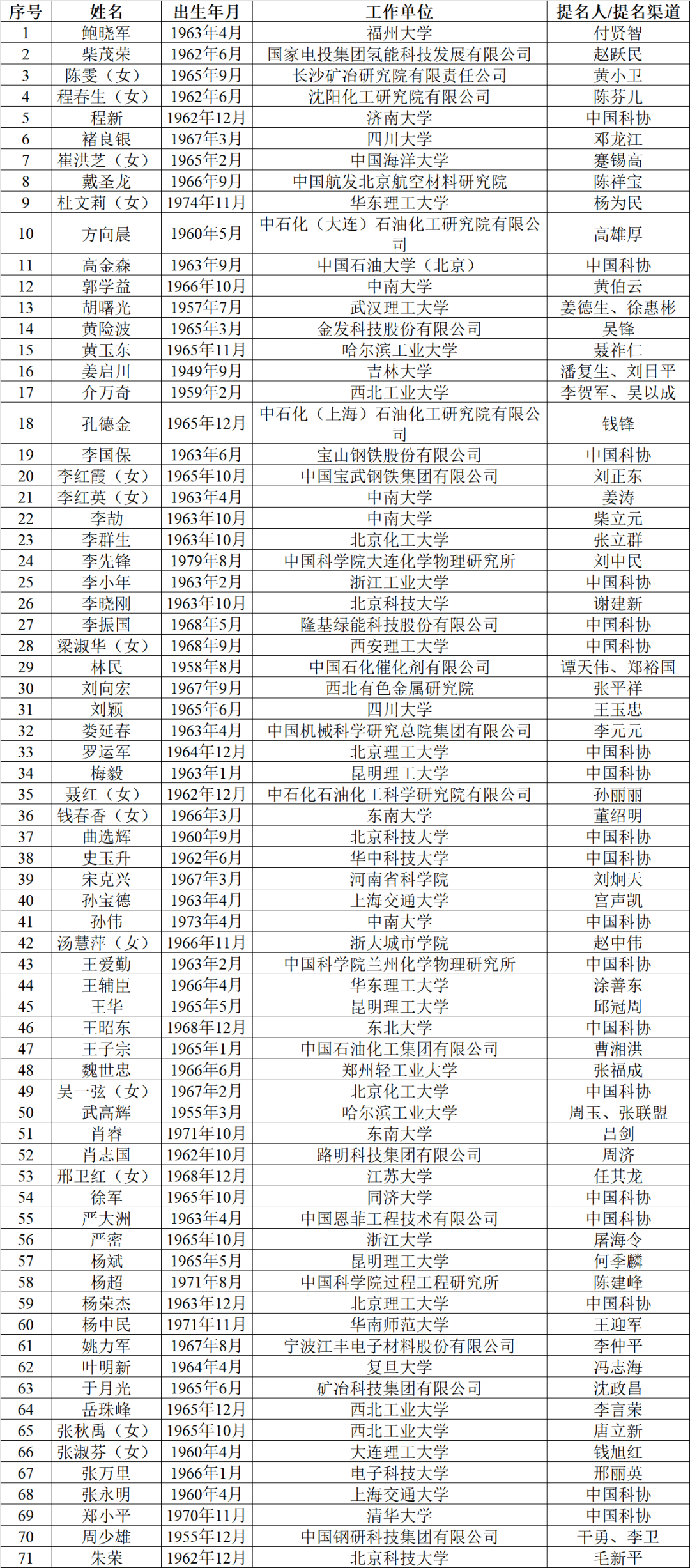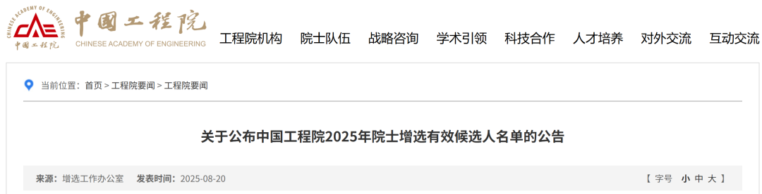 8月20日,中國工(gong)程(cheng)院(yuan)發布《關(guan)于公(gong)布中國工(gong)程(cheng)院(yuan)2025年(nian)院(yuan)士增選(xuan)有(you)效候選(xuan)人名單(dan)(dan)(dan)的公(gong)告》,名單(dan)(dan)(dan)顯示:李(li)振國、嚴大洲均在有(you)效候選(xuan)人名單(dan)(dan)(dan)。 中(zhong)(zhong)(zhong)國(guo)工(gong)程(cheng)院(yuan)(yuan)2025年院(yuan)(yuan)士(shi)(shi)(shi)增選(xuan)(xuan)提名工(gong)作已經結束。經中(zhong)(zhong)(zhong)國(guo)工(gong)程(cheng)院(yuan)(yuan)第八(ba)屆(jie)主席(xi)團第十六次會議(yi)審(shen)議(yi),中(zhong)(zhong)(zhong)國(guo)工(gong)程(cheng)院(yuan)(yuan)黨組(zu)審(shen)定,確認中(zhong)(zhong)(zhong)國(guo)工(gong)程(cheng)院(yuan)(yuan)2025年院(yuan)(yuan)士(shi)(shi)(shi)增選(xuan)(xuan)有效候選(xuan)(xuan)人(ren)660人(ren)。根據(ju)《中(zhong)(zhong)(zhong)國(guo)工(gong)程(cheng)院(yuan)(yuan)院(yuan)(yuan)士(shi)(shi)(shi)增選(xuan)(xuan)工(gong)作實(shi)施辦法》的規定,現將有效候選(xuan)(xuan)人(ren)名單予(yu)以公布(bu)。 中國(guo)工程院 2025年(nian)8月20日 中國工程院2025年院士增選有(you)效候選人名單 (共660人(ren),分學部按姓氏拼(pin)音(yin)排序) 機械與運載工程學(xue)部68人 信息與電子工(gong)程(cheng)學部68人(ren) 化工、冶金與(yu)材料工程學部71人 能源與礦(kuang)業(ye)工程學部(bu)72人 土(tu)木、水利與建筑工(gong)程學(xue)部(bu)91人 環境與輕紡工程學部73人 農業(ye)學(xue)部83人 醫藥(yao)衛生(sheng)學部(bu)91人 另有(you)特(te)別通道有(you)效候選(xuan)人43人。