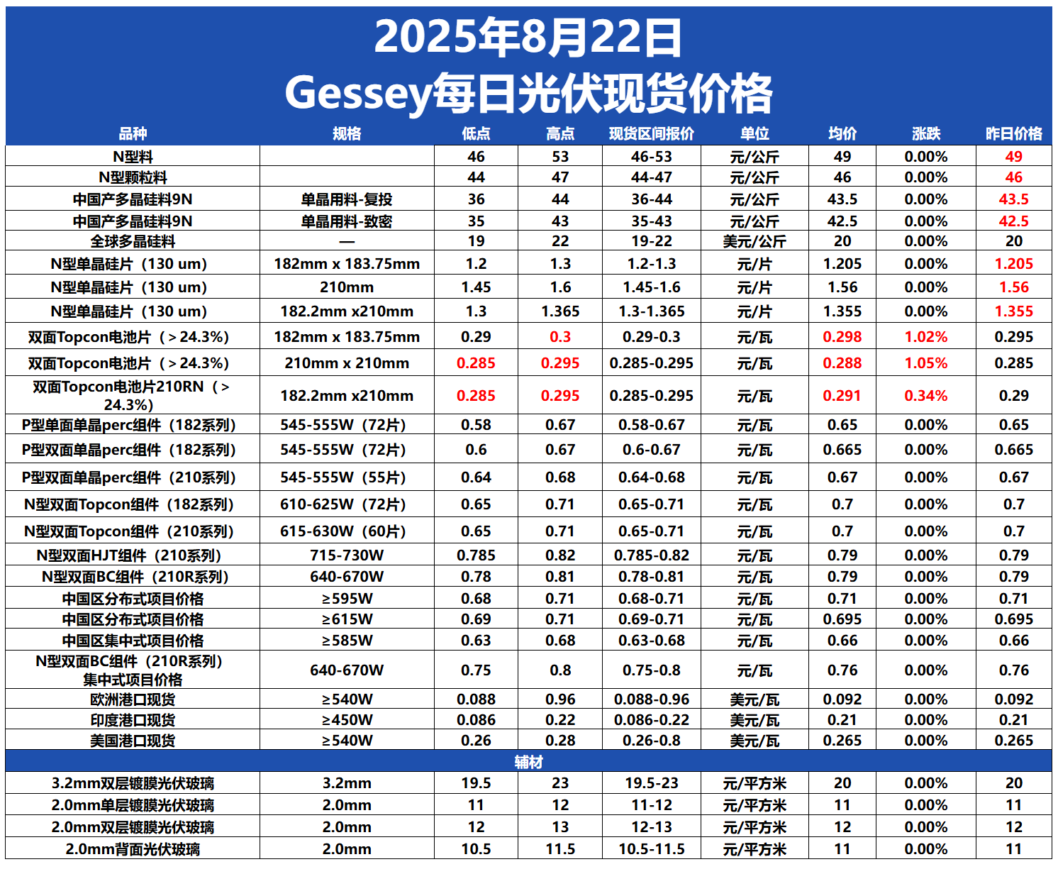 現貨市場價格變動: 多晶硅: 今日硅(gui)(gui)料(liao)價(jia)(jia)(jia)格(ge)整體維穩,N型料(liao)主(zhu)流價(jia)(jia)(jia)格(ge)在46-53元(yuan)(yuan)(yuan)(yuan)/公(gong)斤(jin),均價(jia)(jia)(jia)49元(yuan)(yuan)(yuan)(yuan)/公(gong)斤(jin)。N型顆粒硅(gui)(gui)主(zhu)流價(jia)(jia)(jia)格(ge)在44-47元(yuan)(yuan)(yuan)(yuan)/公(gong)斤(jin),均價(jia)(jia)(jia)46元(yuan)(yuan)(yuan)(yuan)/公(gong)斤(jin)。國(guo)產復投特級硅(gui)(gui)料(liao)主(zhu)流價(jia)(jia)(jia)格(ge)在36-44元(yuan)(yuan)(yuan)(yuan)/公(gong)斤(jin),均價(jia)(jia)(jia)43.5元(yuan)(yuan)(yuan)(yuan)/公(gong)斤(jin),國(guo)產致密特級硅(gui)(gui)料(liao)主(zhu)流價(jia)(jia)(jia)格(ge)在35-43元(yuan)(yuan)(yuan)(yuan)/公(gong)斤(jin),均價(jia)(jia)(jia)42.5元(yuan)(yuan)(yuan)(yuan)/公(gong)斤(jin)。全球多晶(jing)硅(gui)(gui)料(liao)主(zhu)流價(jia)(jia)(jia)格(ge)在19-22元(yuan)(yuan)(yuan)(yuan)/公(gong)斤(jin),均價(jia)(jia)(jia)20元(yuan)(yuan)(yuan)(yuan)/公(gong)斤(jin)。 硅片: 今日硅(gui)片(pian)(pian)(pian)(pian)價(jia)(jia)格(ge)(ge)整體維穩,N型(xing)-183.75mm單(dan)晶硅(gui)片(pian)(pian)(pian)(pian)主(zhu)流(liu)現(xian)貨(huo)價(jia)(jia)格(ge)(ge)維持(chi)1.2-1.3元(yuan)(yuan)/片(pian)(pian)(pian)(pian),均(jun)(jun)價(jia)(jia)1.205元(yuan)(yuan)/片(pian)(pian)(pian)(pian)。N型(xing)-210mm單(dan)晶硅(gui)片(pian)(pian)(pian)(pian)主(zhu)流(liu)現(xian)貨(huo)價(jia)(jia)格(ge)(ge)維持(chi)1.45-1.6元(yuan)(yuan)/片(pian)(pian)(pian)(pian),均(jun)(jun)價(jia)(jia)1.56元(yuan)(yuan)/片(pian)(pian)(pian)(pian)。N型(xing)-210Rmm單(dan)晶硅(gui)片(pian)(pian)(pian)(pian)主(zhu)流(liu)現(xian)貨(huo)價(jia)(jia)格(ge)(ge)1.3-1.365元(yuan)(yuan)/片(pian)(pian)(pian)(pian),均(jun)(jun)價(jia)(jia)1.355元(yuan)(yuan)/片(pian)(pian)(pian)(pian)。 電池片: 今日電池(chi)片(pian)價(jia)格(ge)小(xiao)幅上(shang)漲(zhang),24.3%以上(shang)183.75mm雙面Topcon電池(chi)片(pian)主流價(jia)格(ge)在0.29-0.3元(yuan)/瓦(wa),均價(jia)0.298元(yuan)/瓦(wa),上(shang)漲(zhang)1.02%。24.3%以上210mm雙(shuang)面Topcon電池片主(zhu)流價格在(zai)0.285-0.295元(yuan)/瓦,均價0.288元(yuan)/瓦,上漲1.05%。24.3%以上210Rmm雙面Topcon電池片主(zhu)流(liu)價(jia)(jia)格在0.285-0.295元(yuan)/瓦(wa),均價(jia)(jia)0.291元(yuan)/瓦(wa),上漲0.34%。 組件: 今日(ri)組(zu)(zu)(zu)件價(jia)(jia)(jia)(jia)(jia)(jia)(jia)(jia)(jia)格(ge)(ge)整體維穩,雙(shuang)(shuang)面(mian)(mian)單(dan)晶perc組(zu)(zu)(zu)件(182系(xi)(xi)列)價(jia)(jia)(jia)(jia)(jia)(jia)(jia)(jia)(jia)格(ge)(ge)在(zai)(zai)0.6-0.67元(yuan)(yuan)(yuan)(yuan)(yuan)/ 瓦(wa)(wa)(wa)(wa)(wa)(wa),均(jun)(jun)(jun)價(jia)(jia)(jia)(jia)(jia)(jia)(jia)(jia)(jia)為(wei)(wei)0.665元(yuan)(yuan)(yuan)(yuan)(yuan)/瓦(wa)(wa)(wa)(wa)(wa)(wa)。雙(shuang)(shuang)面(mian)(mian)單(dan)晶perc組(zu)(zu)(zu)件(210系(xi)(xi)列)價(jia)(jia)(jia)(jia)(jia)(jia)(jia)(jia)(jia)格(ge)(ge)在(zai)(zai)0.64-0.68元(yuan)(yuan)(yuan)(yuan)(yuan)/ 瓦(wa)(wa)(wa)(wa)(wa)(wa),均(jun)(jun)(jun)價(jia)(jia)(jia)(jia)(jia)(jia)(jia)(jia)(jia)為(wei)(wei)0.67元(yuan)(yuan)(yuan)(yuan)(yuan)/瓦(wa)(wa)(wa)(wa)(wa)(wa)。N型(xing)雙(shuang)(shuang)面(mian)(mian)Topcon 組(zu)(zu)(zu)件(182系(xi)(xi)列)價(jia)(jia)(jia)(jia)(jia)(jia)(jia)(jia)(jia)格(ge)(ge)在(zai)(zai)0.65-0.71元(yuan)(yuan)(yuan)(yuan)(yuan)/ 瓦(wa)(wa)(wa)(wa)(wa)(wa),均(jun)(jun)(jun)價(jia)(jia)(jia)(jia)(jia)(jia)(jia)(jia)(jia)為(wei)(wei)0.7元(yuan)(yuan)(yuan)(yuan)(yuan)/瓦(wa)(wa)(wa)(wa)(wa)(wa)。N型(xing)雙(shuang)(shuang)面(mian)(mian)Topcon 組(zu)(zu)(zu)件(210系(xi)(xi)列)價(jia)(jia)(jia)(jia)(jia)(jia)(jia)(jia)(jia)格(ge)(ge)在(zai)(zai)0.65-0.71元(yuan)(yuan)(yuan)(yuan)(yuan)/ 瓦(wa)(wa)(wa)(wa)(wa)(wa),均(jun)(jun)(jun)價(jia)(jia)(jia)(jia)(jia)(jia)(jia)(jia)(jia)為(wei)(wei)0.7元(yuan)(yuan)(yuan)(yuan)(yuan)/瓦(wa)(wa)(wa)(wa)(wa)(wa)。N型(xing)雙(shuang)(shuang)面(mian)(mian)HJT組(zu)(zu)(zu)件(210系(xi)(xi)列)價(jia)(jia)(jia)(jia)(jia)(jia)(jia)(jia)(jia)格(ge)(ge)在(zai)(zai)0.785-0.82元(yuan)(yuan)(yuan)(yuan)(yuan)/ 瓦(wa)(wa)(wa)(wa)(wa)(wa),均(jun)(jun)(jun)價(jia)(jia)(jia)(jia)(jia)(jia)(jia)(jia)(jia)為(wei)(wei)0.79元(yuan)(yuan)(yuan)(yuan)(yuan)/瓦(wa)(wa)(wa)(wa)(wa)(wa)。N型(xing)雙(shuang)(shuang)面(mian)(mian)BC組(zu)(zu)(zu)件(210R系(xi)(xi)列)價(jia)(jia)(jia)(jia)(jia)(jia)(jia)(jia)(jia)格(ge)(ge)在(zai)(zai)0.78-0.81元(yuan)(yuan)(yuan)(yuan)(yuan)/ 瓦(wa)(wa)(wa)(wa)(wa)(wa),均(jun)(jun)(jun)價(jia)(jia)(jia)(jia)(jia)(jia)(jia)(jia)(jia)為(wei)(wei)0.79元(yuan)(yuan)(yuan)(yuan)(yuan)/瓦(wa)(wa)(wa)(wa)(wa)(wa)。中(zhong)國區分布(bu)式項(xiang)目(mu)(mu)(≥595W)價(jia)(jia)(jia)(jia)(jia)(jia)(jia)(jia)(jia)格(ge)(ge)在(zai)(zai)0.68-0.71元(yuan)(yuan)(yuan)(yuan)(yuan)/瓦(wa)(wa)(wa)(wa)(wa)(wa),均(jun)(jun)(jun)價(jia)(jia)(jia)(jia)(jia)(jia)(jia)(jia)(jia)為(wei)(wei)0.71元(yuan)(yuan)(yuan)(yuan)(yuan)/瓦(wa)(wa)(wa)(wa)(wa)(wa),中(zhong)國區分布(bu)式項(xiang)目(mu)(mu)(≥615W)價(jia)(jia)(jia)(jia)(jia)(jia)(jia)(jia)(jia)格(ge)(ge)在(zai)(zai)0.69-0.71元(yuan)(yuan)(yuan)(yuan)(yuan)/瓦(wa)(wa)(wa)(wa)(wa)(wa),均(jun)(jun)(jun)價(jia)(jia)(jia)(jia)(jia)(jia)(jia)(jia)(jia)為(wei)(wei)0.695元(yuan)(yuan)(yuan)(yuan)(yuan)/瓦(wa)(wa)(wa)(wa)(wa)(wa),中(zhong)國區集中(zhong)式項(xiang)目(mu)(mu)(≥585W)價(jia)(jia)(jia)(jia)(jia)(jia)(jia)(jia)(jia)格(ge)(ge)在(zai)(zai)0.63-0.68元(yuan)(yuan)(yuan)(yuan)(yuan)/ 瓦(wa)(wa)(wa)(wa)(wa)(wa),均(jun)(jun)(jun)價(jia)(jia)(jia)(jia)(jia)(jia)(jia)(jia)(jia)為(wei)(wei)0.66元(yuan)(yuan)(yuan)(yuan)(yuan)/瓦(wa)(wa)(wa)(wa)(wa)(wa)。N型(xing)雙(shuang)(shuang)面(mian)(mian)BC組(zu)(zu)(zu)件(210R系(xi)(xi)列)集中(zhong)式項(x
