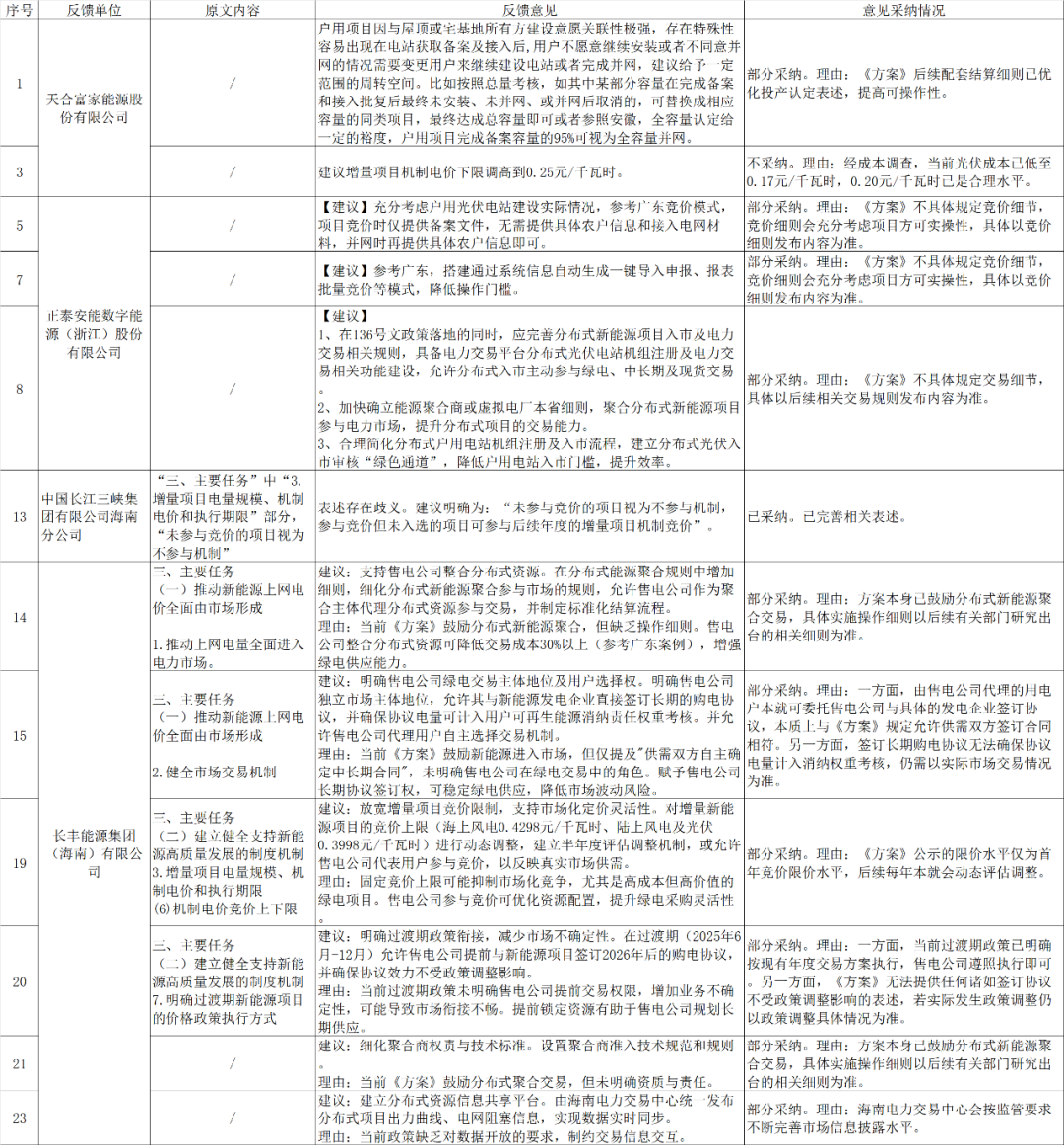 8月25日,海(hai)南省(sheng)發展和改革(ge)委員會關(guan)(guan)于《關(guan)(guan)于海(hai)南省(sheng)深(shen)化新能源上網電價市場化改革(ge)的實施(shi)方案(征求(qiu)意見稿)》公(gong)開征求(qiu)意見情況。 其中,共收到(dao)天(tian)合(he)富家(jia)能(neng)源股(gu)份(fen)有(you)限公(gong)司(si)(si)(si)、正泰安能(neng)數字(zi)能(neng)源(浙江(jiang))股(gu)份(fen)有(you)限公(gong)司(si)(si)(si)、青島海(hai)爾光伏新能(neng)源有(you)限公(gong)司(si)(si)(si)、海(hai)口海(hai)蘊(yun)弘新能(neng)源有(you)限公(gong)司(si)(si)(si)、中國長江(jiang)三峽集(ji)團有(you)限公(gong)司(si)(si)(si)海(hai)南分(fen)公(gong)司(si)(si)(si)、長豐能(neng)源集(ji)團(海(hai)南)有(you)限公(gong)司(si)(si)(si)合(he)計6家(jia)公(gong)司(si)(si)(si)23條(tiao)反饋(kui)意見。經研究,采納(na)(na)(na)和部(bu)分(fen)采納(na)(na)(na)11條(tiao),未采納(na)(na)(na)12條(tiao)。采納(na)(na)(na)意見部(bu)分(fen)包(bao)括: 建議:放(fang)寬增量項目(mu)競價限(xian)制(zhi),支(zhi)持市(shi)場化定價靈(ling)活性。對(dui)增量新能源(yuan)項目(mu)的競價上限(xian)(海上風電0.4298元/千瓦(wa)時(shi)、陸上風電及光伏0.3998元/千瓦(wa)時(shi))進行(xing)動態調(diao)整,建立半年度評估調(diao)整機(ji)制(zhi),或允許(xu)售電公(gong)司(si)代表用戶參與競價,以反映真實(shi)市(shi)場供(gong)需。 理由:固定(ding)競(jing)價(jia)(jia)上限可能抑制市場化競(jing)爭,尤其是高(gao)成本但(dan)高(gao)價(jia)(jia)值的綠電(dian)項目(mu)。售電(dian)公司(si)參與競(jing)價(jia)(jia)可優化資源(yuan)配(pei)置,提升綠電(dian)采購靈活(huo)性(xing)。 部分采納。理由:《方案》公示的限價(jia)水平僅為首年競(jing)價(jia)限價(jia)水平,后(hou)續每年本就會動態評估調(diao)整。 詳見下表(biao) 上一篇: 陽光電源擬赴港上市!