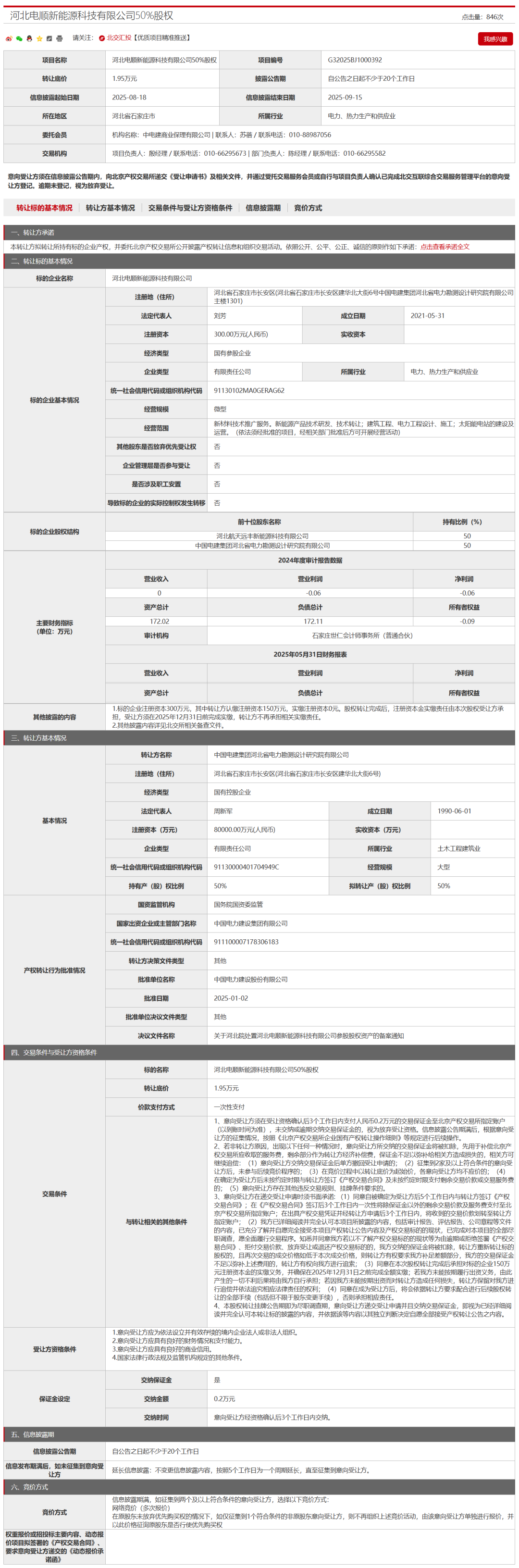 8月18日,中國電建集團河北省電力勘測設計研究院有限公司掛牌轉讓河北電順新能源科技有限公司50%股權,轉讓底價為1.95萬元。 根據信息披露,該標的企業注冊資本300萬元,其中轉讓方認繳注冊資本150萬元,實繳注冊資本0元。股權轉讓完成后,注冊資本金實繳責任由本次股權受讓方承擔,受讓方須在2025年12月31日前完成實繳,轉讓方不再承擔相關實繳責任。 值得關注的是,2024年標的企業的利潤為-0.06萬元,負債總額為172.11萬元。 資料顯示,河北電順新能源科技有限公司成立于2021年5月31日,注冊資本300萬元,經營范圍包括新材料技術推廣服務;新能源產品技術研發、技術轉讓;建筑工程、電力工程設計、施工;太陽能電站的建設及運營。 據天眼查股權結構顯示,河北電順新能源科技有限公司由中國電建集團持股50%,河北國九科技有限公司持股50%。 詳情如下: 上一篇: 大全能源2025H1虧損12.95億元
