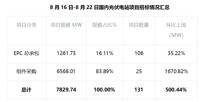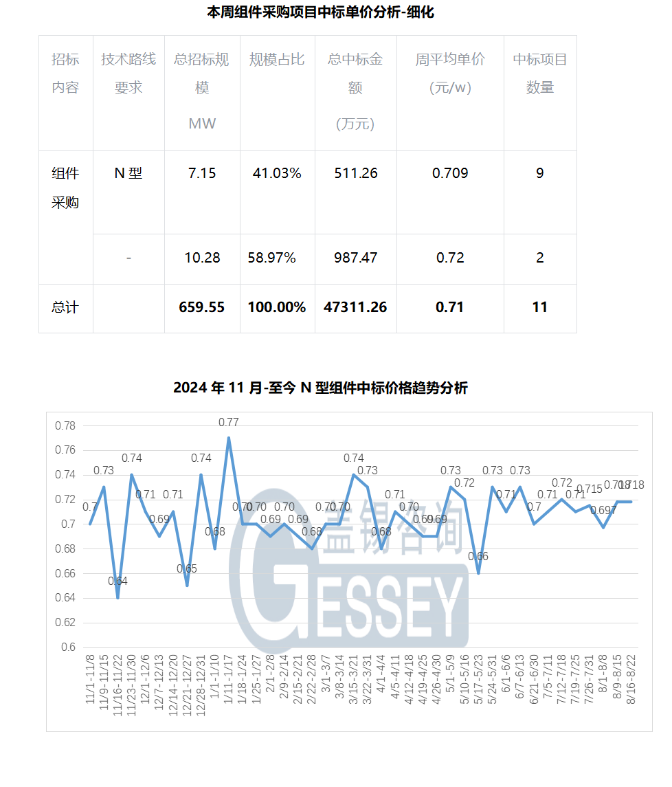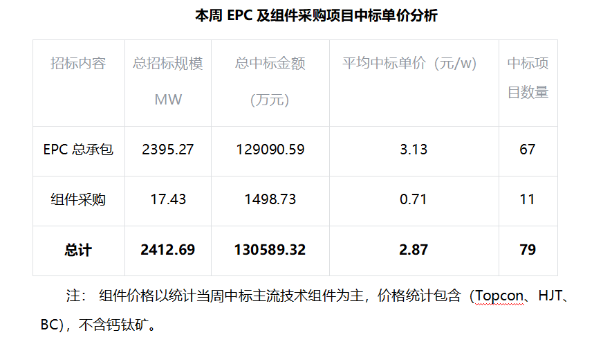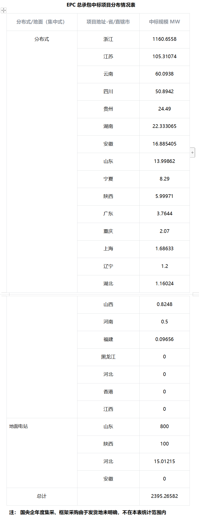 一、光伏項目招標情況匯總: 根據Gessey蓋錫咨詢統計,2025年(nian)8月16日-8月22日累(lei)計光伏招標(biao)項目(mu)為(wei)131個,項目規模合計為(wei)7829.74MW。光(guang)伏組件采購招(zhao)標項目為(wei)25個,招標規(gui)模(mo)為6568.01MW,EPC總承包(bao)招標項目(mu)為106個,招標規模為1261.73MW。 我(wo)們統計包(bao)含大型央企(qi)國(guo)企(qi)、地方(fang)能源集團、地方(fang)政府機(ji)關、兩大電(dian)網、央企(qi)總包(bao)企(qi)業、知(zhi)名光(guang)伏企(qi)業等,其中五大六小(xiao)發電(dian)央企(qi)占總招(zhao)標規模(mo)較(jiao)高(gao),具體各(ge)企(qi)業排名如下表: 二(er)、中標項目(mu)分布類型匯總情況 本(ben)周中(zhong)標項目需求按(an)照招標場景地(di)(di)分(fen)布(bu),分(fen)布(bu)式光伏(fu)主要(yao)集(ji)(ji)(ji)中(zhong)在浙江(jiang)、江(jiang)蘇、云(yun)南、四(si)川等(deng)地(di)(di)區(qu),即主要(yao)集(ji)(ji)(ji)中(zhong)在華東地(di)(di)區(qu);集(ji)(ji)(ji)中(zhong)式光伏(fu)主要(yao)集(ji)(ji)(ji)中(zhong)在山東等(deng)地(di)(di)區(qu),即主要(yao)集(ji)(ji)(ji)中(zhong)在華東地(di)(di)區(qu)。 三(san)、EPC總(zong)承包及組件采(cai)購情況匯總(zong) 本月光伏EPC總承(cheng)包中(zhong)標(biao)(biao)規模達2395.27 MW,總中(zhong)標(biao)(biao)金額129090.59萬元(yuan),平均中(zhong)標(biao)(biao)單價為(wei)3.13元(yuan)/W,中(zhong)標(biao)(biao)數量(liang)67個。 本月(yue)光(guang)伏(fu)組件采購中標(biao)規模達(da)17.43 MW,總中標(biao)金額1498.73萬元(yuan)(yuan),平(ping)均中標(biao)單價為0.71元(yuan)(yuan)/W,中標(biao)數量11個。