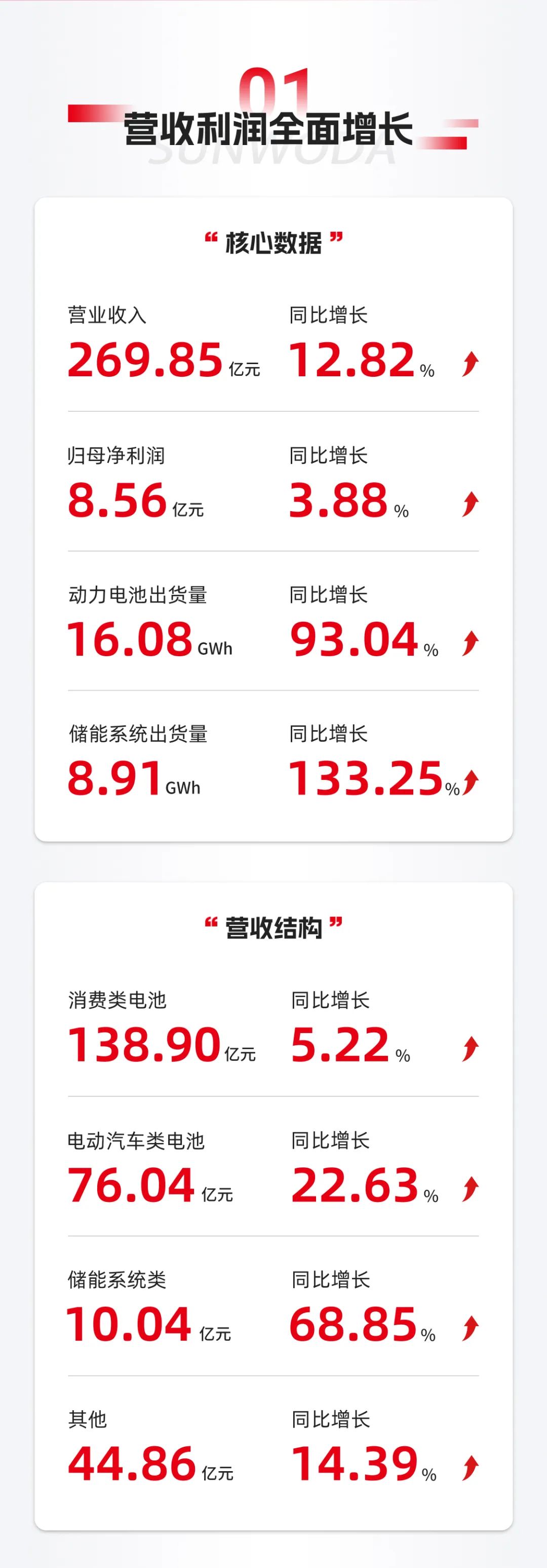 8月27日晚間,欣旺達發布公司2025年半年度業績(ji)報(bao)告。報(bao)告期內,欣旺達實現營業收入(ru)269.85億(yi)元(yuan),同比(bi)(bi)增長12.82%;歸(gui)屬于上市公司股(gu)東(dong)的凈利潤8.56億(yi)元(yuan),同比(bi)(bi)增長3.88%。動力電池出貨量16.08GWh,同比(bi)(bi)增長93.04%;儲能系統出貨量8.91GWh,同比(bi)(bi)增長133.25%。