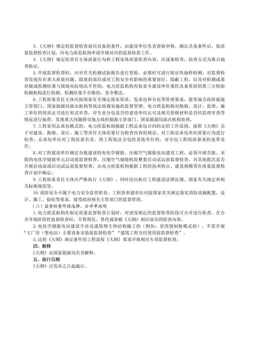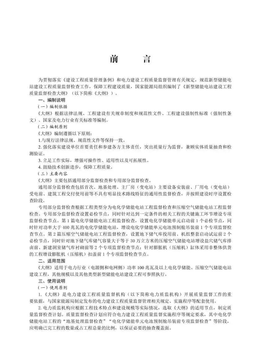 9月2日,國家能源(yuan)局(ju)發布(bu)《新(xin)型儲(chu)能電站(zhan)建設工程(cheng)質量監督檢(jian)查(cha)大綱(征求意見稿)》,《大綱》適(shi)用于電力行業(電源(yuan)側和(he)電網側)功(gong)率100兆瓦及(ji)以(yi)上電化(hua)學儲(chu)能、壓縮空氣儲(chu)能電站(zhan)建設工程(cheng),其(qi)他規模以(yi)及(ji)其(qi)他類型新(xin)型儲(chu)能電站(zhan)建設工程(cheng)可參(can)照執行。 《大綱》主要包括通用部分監督檢查和專(zhuan)用部分監督檢查。 通用部(bu)分監督(du)檢查(cha)(cha)包括(kuo)首次、地基(ji)處理(li)、主(zhu)廠房(變電(dian)站)主(zhu)要設(she)備安裝前(qian)(qian)、廠用電(dian)(變電(dian)站)受電(dian)前(qian)(qian)、建(jian)筑工程交(jiao)付使(shi)用前(qian)(qian)等不具有(you)明顯技(ji)術路線特征的(de)通用性監督(du)檢查(cha)(cha),并按照建(jian)設(she)時序設(she)置(zhi)檢查(cha)(cha)階段。 專(zhuan)(zhuan)用部分(fen)(fen)監(jian)(jian)督(du)(du)(du)檢(jian)(jian)查(cha)根據工(gong)程類(lei)型分(fen)(fen)為電(dian)化學儲能電(dian)站工(gong)程監(jian)(jian)督(du)(du)(du)檢(jian)(jian)查(cha)和(he)壓(ya)縮空氣儲能電(dian)站工(gong)程監(jian)(jian)督(du)(du)(du)檢(jian)(jian)查(cha)。專(zhuan)(zhuan)用部分(fen)(fen)監(jian)(jian)督(du)(du)(du)檢(jian)(jian)查(cha)設(she)置必檢(jian)(jian)節(jie)點,同(tong)時針對(dui)達到(dao)一定條件的(de)相關工(gong)程的(de)關鍵(jian)施工(gong)環節(jie)增設(she)專(zhuan)(zhuan)項監(jian)(jian)督(du)(du)(du)檢(jian)(jian)查(cha)節(jie)點。 電(dian)化(hua)學儲能電(dian)站工(gong)程監督檢(jian)(jian)查,設置電(dian)化(hua)學儲能單(dan)(dan)元啟動(dong)前1個必檢(jian)(jian)節(jie)(jie)點,同時針對(dui)功率(lv)大于400兆瓦的電(dian)化(hua)學儲能電(dian)站,增設電(dian)化(hua)學儲能單(dan)(dan)元電(dian)池預制艙(cang)吊裝前1個專(zhuan)項監督檢(jian)(jian)查節(jie)(jie)點。 原文如下: 國家能源局(ju)綜合司關于公(gong)開征求(qiu)《新(xin)型儲能電(dian)站建設工程質(zhi)量監(jian)督檢查(cha)大綱(征求(qiu)意(yi)見(jian)稿)》意(yi)見(jian)的通知 為進(jin)一步(bu)加強(qiang)和(he)規范新(xin)型(xing)儲能(neng)電站建(jian)設(she)工程(cheng)的(de)質量監督工作,國家能(neng)源局編制了《新(xin)型(xing)儲能(neng)電站建(jian)設(she)工程(cheng)質量監督檢(jian)查(cha)大綱(征求(qiu)(qiu)意見(jian)(jian)稿)》,現向社會公(gong)開征求(qiu)(qiu)意見(jian)(jian)。公(gong)眾可通過以下途(tu)徑和(he)方式反饋意見(jian)(jian): 一、通過(guo)電子郵件方式發送至:gchch@nea.gov.cn。 二(er)、通(tong)過信函方式郵寄(ji)至:北京市(shi)西(xi)城區(qu)三里河路46號國家(jia)能源局(ju)電(dian)力安全監(jian)管司,郵政編碼:100045。 意見(jian)反饋截止日(ri)期為(wei)2025年9月30日(ri)。 感(gan)謝您(nin)的(de)參與和支持! 國家能源局綜合司 2025年8月29日