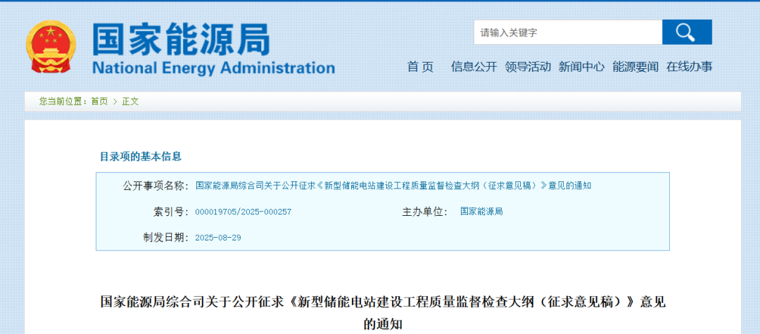 國家能源局發布《新型儲能電站建設工程質量監督檢查大綱(征求意見稿)》2025-09-03 11:31瀏覽數:163次