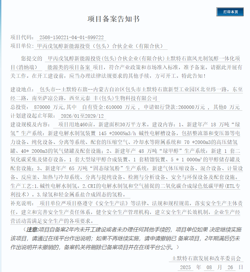 近(jin)日(ri),內蒙古自治區(qu)投(tou)(tou)資(zi)項(xiang)(xiang)目(mu)(mu)在線審批(pi)辦(ban)事(shi)大(da)廳發布信息(xi)顯示:甲丙戊氫(qing)(qing)醇新能源投(tou)(tou)資(zi)(包頭)合伙(huo)企業(ye)(有限(xian)合伙(huo))提交的(de)甲丙戊氫(qing)(qing)醇新能源投(tou)(tou)資(zi)(包頭)合伙(huo)企業(ye)(有限(xian)合伙(huo))土默特右旗風光制氫(qing)(qing)醇一體(ti)化(hua)項(xiang)(xiang)目(mu)(mu)(消(xiao)納(na)端) 能源類的(de)項(xiang)(xiang)目(mu)(mu)備案項(xiang)(xiang)目(mu)(mu),準予備案。 建設(she)地點:包(bao)頭(tou)市--土默(mo)(mo)特(te)(te)右旗(qi)--內蒙古自(zi)治區包(bao)頭(tou)市土默(mo)(mo)特(te)(te)右旗(qi)新型(xing)工業園(yuan)區北(bei)至緯一(yi)路,東至經二路,南至薩涼公路,西至元泰 豐(包(bao)頭(tou))生物科技有限(xian)公司 總投(tou)資(zi)(zi):870000萬(wan)元(yuan),其中 自有資(zi)(zi)金:610000 萬(wan)元(yuan) , 申請銀(yin)行(xing)貸款(kuan):260000萬(wan)元(yuan) , 其他(ta)0 萬(wan)元(yuan) 計劃建(jian)設起止年限:2026/01至(zhi)2029/12 建(jian)(jian)設(she)(she)規模(mo)及(ji)(ji)內(nei)容: 項目用地460畝,新(xin)(xin)建(jian)(jian)面積30萬平(ping)方米。建(jian)(jian)設(she)(she)內(nei)容:1、新(xin)(xin)建(jian)(jian)年產(chan) 18 萬噸(dun)“綠(lv)氫(qing)(qing)(qing)”生(sheng)產(chan)系(xi)(xi)統(tong)(tong)(tong):新(xin)(xin)建(jian)(jian)電(dian)解水制氫(qing)(qing)(qing)裝置(zhi) 145 *2000Nm3/h 堿性(xing)電(dian)解槽設(she)(she)備(bei),包括整流器和(he)變壓(ya)器等電(dian)力(li)設(she)(she)備(bei)、純(chun)化設(she)(she)備(bei)、分離等系(xi)(xi)統(tong)(tong)(tong)、配(pei)(pei)套(tao)的(de)(de)壓(ya)縮空(kong)(kong)氣(qi)、冷(leng)卻水等附(fu)屬系(xi)(xi)統(tong)(tong)(tong)和(he) 70 *2000m3的(de)(de)高壓(ya)儲(chu)氫(qing)(qing)(qing)罐、40* 2000m3的(de)(de)氧氣(qi)儲(chu)罐及(ji)(ji)配(pei)(pei)套(tao)設(she)(she)施;2、新(xin)(xin)建(jian)(jian)年產(chan) 48 萬噸(dun)“綠(lv)甲(jia)醇”生(sheng)產(chan)系(xi)(xi)統(tong)(tong)(tong):新(xin)(xin)建(jian)(jian) 1 套(tao)二氧化碳采集及(ji)(ji)儲(chu)存設(she)(she)備(bei),1 套(tao)大型綠(lv)甲(jia)醇合(he)成裝置(zhi)、1 套(tao)精餾裝置(zhi)、5 * 1 0000m3的(de)(de)甲(jia)醇儲(chu)存罐及(ji)(ji)配(pei)(pei)套(tao)設(she)(she)施;3、新(xin)(xin)建(jian)(jian)年產(chan) 65 萬噸(dun)“固(gu)態綠(lv)氫(qing)(qing)(qing)粉”生(sheng)產(chan)系(xi)(xi)統(tong)(tong)(tong):新(xin)(xin)建(jian)(jian)氣(qi)體壓(ya)縮設(she)(she)備(bei)、混合(he)設(she)(she)備(bei)、計量設(she)(she)備(bei)、反應釜(fu)、加熱與冷(leng)卻系(xi)(xi)統(tong)(tong)(tong)、分離與提純(chun)設(she)(she)備(bei)、檢測(ce)與分析設(she)(she)備(bei)、安(an)全(quan)與環(huan)保設(she)(she)備(bei)及(ji)(ji)配(pei)(pei)套(tao)設(she)(she)施。生(sheng)產(chan)工藝:1.堿性(xing)電(dian)解水制氫(qing)(qing)(qing)。2.CRI的(de)(de)電(dian)解水制氫(qing)(qing)(qing)和(he)空(kong)(kong)氣(qi)捕捉的(de)(de)二氧化碳合(he)成綠(lv)色低碳甲(jia)醇(ETL專利技術(shu))。3.綠(lv)氫(qing)(qing)(qing)和(he)輕金屬系(xi)(xi)鹽合(he)成固(gu)態的(de)(de)氫(qing)(qing)(qing)粉。