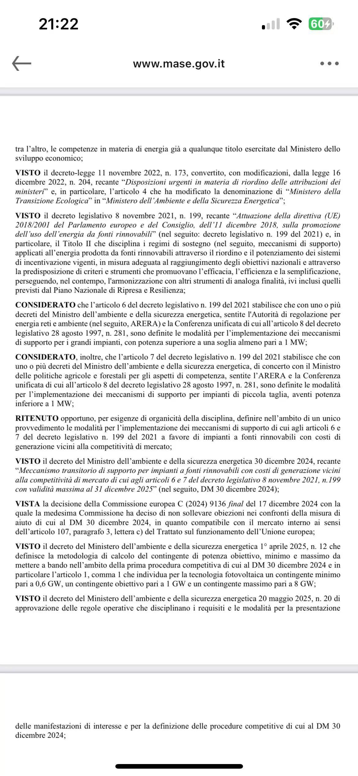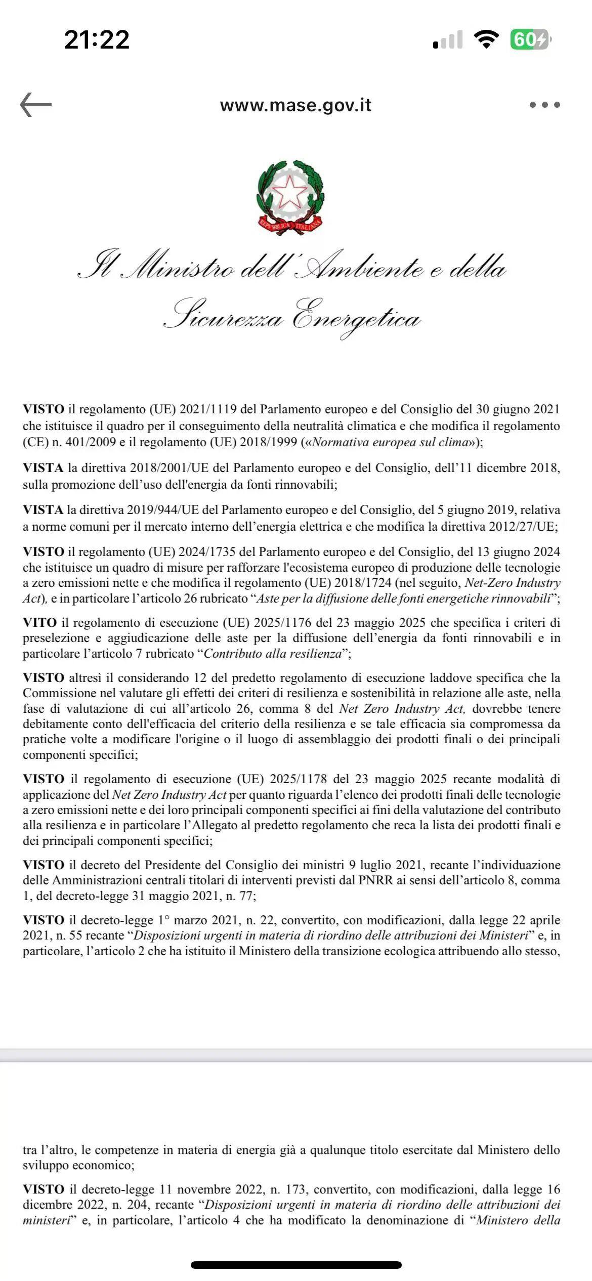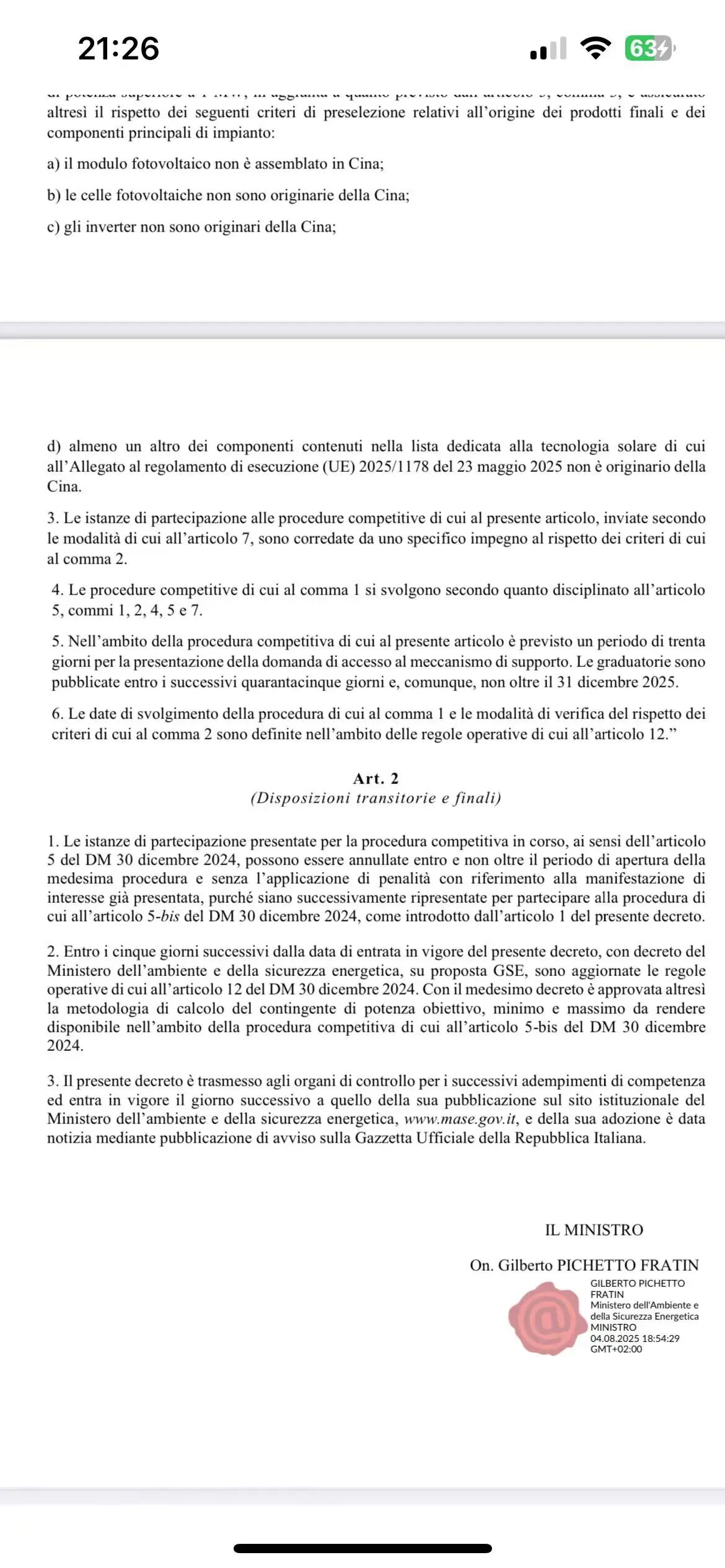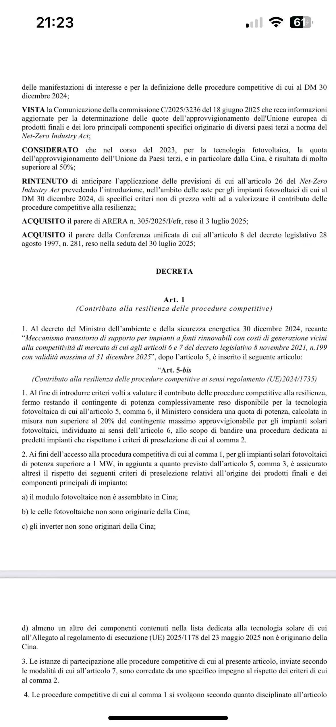 近日,意(yi)大(da)利環境與能源安全部(MASE)發布(bu):其(qi)頒布(bu)的“MASE No. 220/2025”法令(ling)正式(shi)生(sheng)效。該法令(ling)明確規定(ding):使用“非中國(guo)”組件的光伏項目將享受特(te)殊(shu)待遇。這不僅(jin)是(shi)意(yi)大(da)利的單(dan)獨行動,更是(shi)歐盟實(shi)施《凈零工業法案》韌性標準的首次嘗(chang)試(shi)。 意大利正在通過(guo)這項政策重塑其能源安全(quan)邊界。根據新(xin)規,1MW及以上的申請補(bu)貼(tie)的光伏(fu)系統必(bi)須滿足四個關鍵條(tiao)件(jian):太陽能組(zu)件(jian)非(fei)中國(guo)(guo)制造、太陽能電(dian)池(chi)非(fei)中國(guo)(guo)來源、逆變器(qi)非(fei)中國(guo)(guo)生(sheng)產,且(qie)至少一項其他(ta)核心(xin)組(zu)件(jian)也必(bi)須符合“非(fei)中國(guo)(guo)”要求(qiu)。 另外,意大利政(zheng)府為此(ci)次招標設(she)(she)立(li)了明確(que)時(shi)間(jian)表。專門(men)預留20%的光(guang)伏配額給完全滿(man)足(zu)“非中(zhong)國”要(yao)求的項(xiang)目,這些項(xiang)目需要(yao)確(que)保組件(jian)、電池、逆變器和(he)至(zhi)少一個(ge)其(qi)他組件(jian)都不(bu)來自中(zhong)國。招標程(cheng)序設(she)(she)有30天的申請窗口期(qi),中(zhong)標排(pai)名將在(zai)45天內公布。所(suo)有流程(cheng)將在(zai)2025年12月31日前完成,時(shi)間(jian)緊迫感十足(zu)。 這一明顯政策(ce)傾向(xiang)意在響應(ying)(ying)歐盟的(de)本土(tu)制造,此舉將引發項目開發商(shang)重新評(ping)估其供(gong)應(ying)(ying)鏈策(ce)略。 意(yi)大利環境與能源安(an)全(quan)部(MASE)官(guan)方文(wen)件如下: