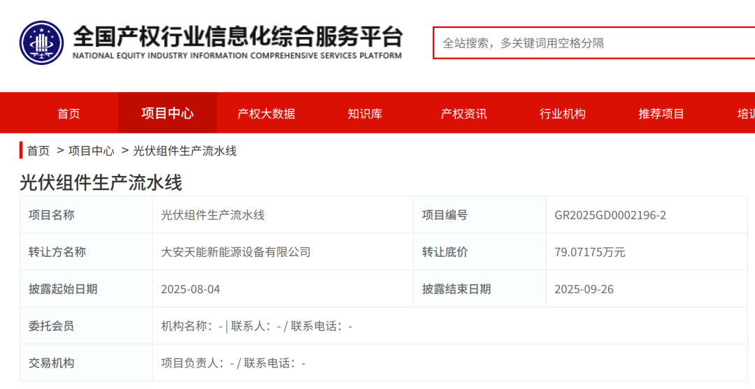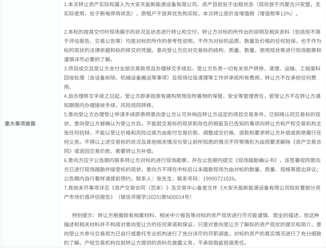 全國產權行業信息化綜合服務平臺披露,大安(an)天能(neng)新能(neng)源設備有限公司的光伏組件生產流水線(xian)轉讓,轉讓底價為79.07175萬元(含稅)。 據(ju)悉,此次處置光伏組件生產(chan)流水線自(zi)2023年6月份起開(kai)始停(ting)產(chan),無(wu)日常維(wei)護工作,目前處于(yu)出租狀態(現存放于(yu)內蒙(meng)古興安盟,無(wu)實(shi)際(ji)使用,處于(yu)斷電停(ting)用狀態),受(shou)讓方須(xu)受(shou)讓后(hou)自(zi)行拆除(chu),并(bing)自(zi)行承擔(dan)相關(guan)費(fei)用(成交后(hou)實(shi)際(ji)交付地點可視(shi)中(zhong)標方所(suo)在地與轉讓方協商確認)。 此外(wai),公告指出原(yuan)租(zu)戶(hu)(hu)不放棄優(you)先購(gou)買權(quan);若(ruo)(ruo)受讓方(fang)為(wei)原(yuan)租(zu)戶(hu)(hu)的,原(yuan)租(zu)賃合同自出具《組織簽約通知(zhi)書》之(zhi)日(ri)(ri)起解除(chu)。若(ruo)(ruo)受讓方(fang)為(wei)非原(yuan)租(zu)戶(hu)(hu)的,給予原(yuan)租(zu)戶(hu)(hu)7個工作日(ri)(ri)歸(gui)還,歸(gui)還期限自轉讓方(fang)向(xiang)原(yuan)租(zu)戶(hu)(hu)出具資(zi)產歸(gui)還通知(zhi)之(zhi)日(ri)(ri)起計算,由(you)轉讓方(fang)負責歸(gui)還事宜。 此(ci)次轉(zhuan)讓(rang)成交(jiao)且受讓(rang)方支付(fu)全部交(jiao)易款項且辦理(li)移交(jiao)手續后,受讓(rang)方負責一(yi)切有關資產轉(zhuan)移、清理(li)、運(yun)輸、工程廢料回收處理(li)(含(han)設備(bei)(bei)拆除、機(ji)械設備(bei)(bei)搬運(yun)等事(shi)項)及現場垃圾(ji)清理(li)等工作(zuo)并承擔所有費用,轉(zhuan)讓(rang)方不在承擔任(ren)何費用。 資料顯(xian)示(shi),大安天能(neng)(neng)新能(neng)(neng)源設備有限(xian)公(gong)司(si)(si)成(cheng)立(li)于2021年(nian)4月,地方國有企業,經營范(fan)圍涵蓋光(guang)伏設備及(ji)元器(qi)件(jian)制造、銷售;光(guang)電子器(qi)件(jian)制造等。該公(gong)司(si)(si)為天能(neng)(neng)重工控(kong)股(gu)孫公(gong)司(si)(si),后者由(you)珠(zhu)海交通控(kong)股(gu)集團有限(xian)公(gong)司(si)(si)和廣(guang)東省財政廳間接持股(gu)。