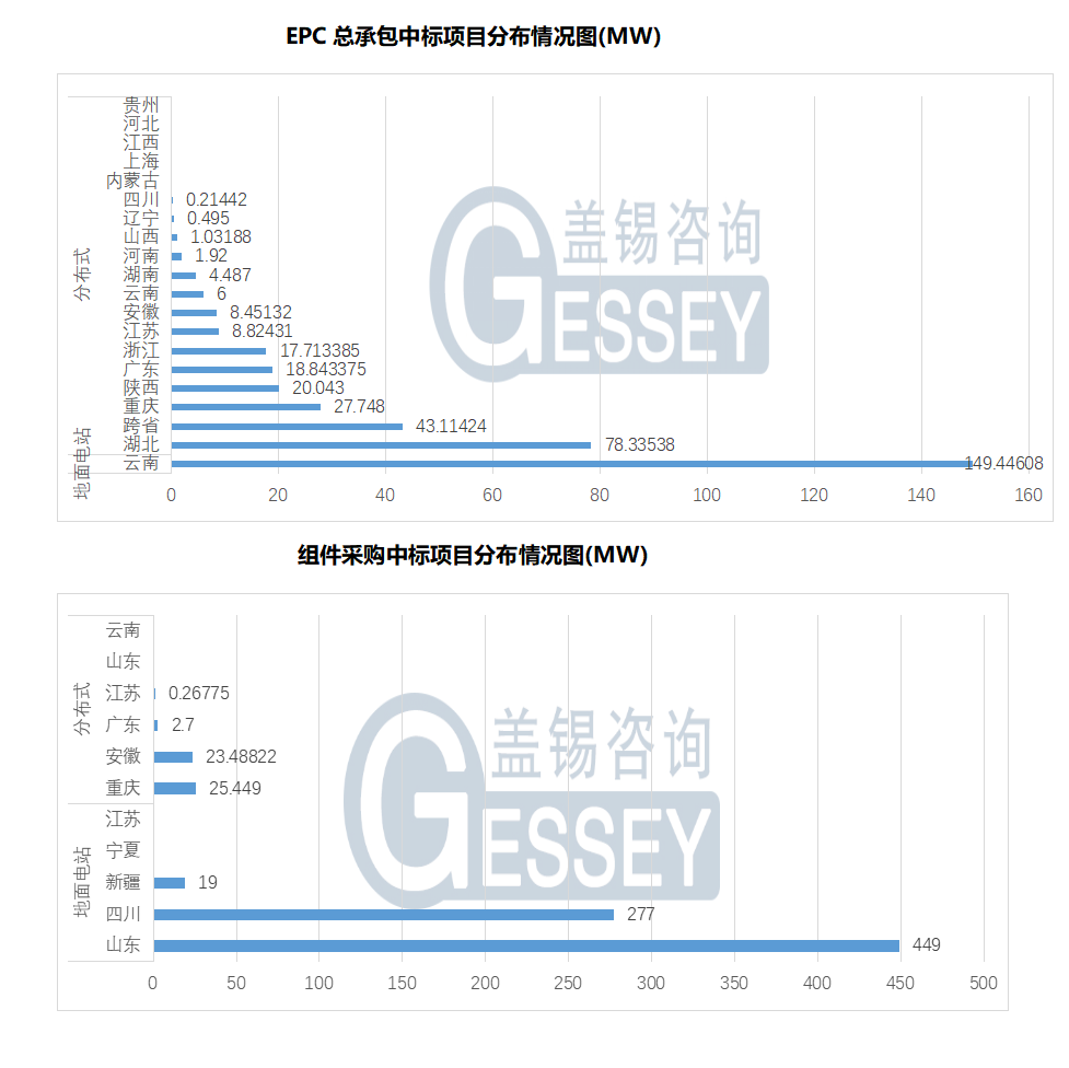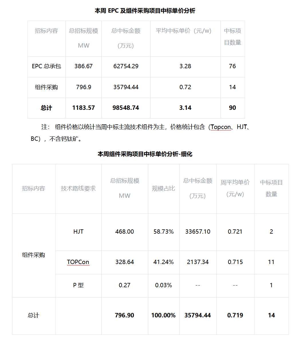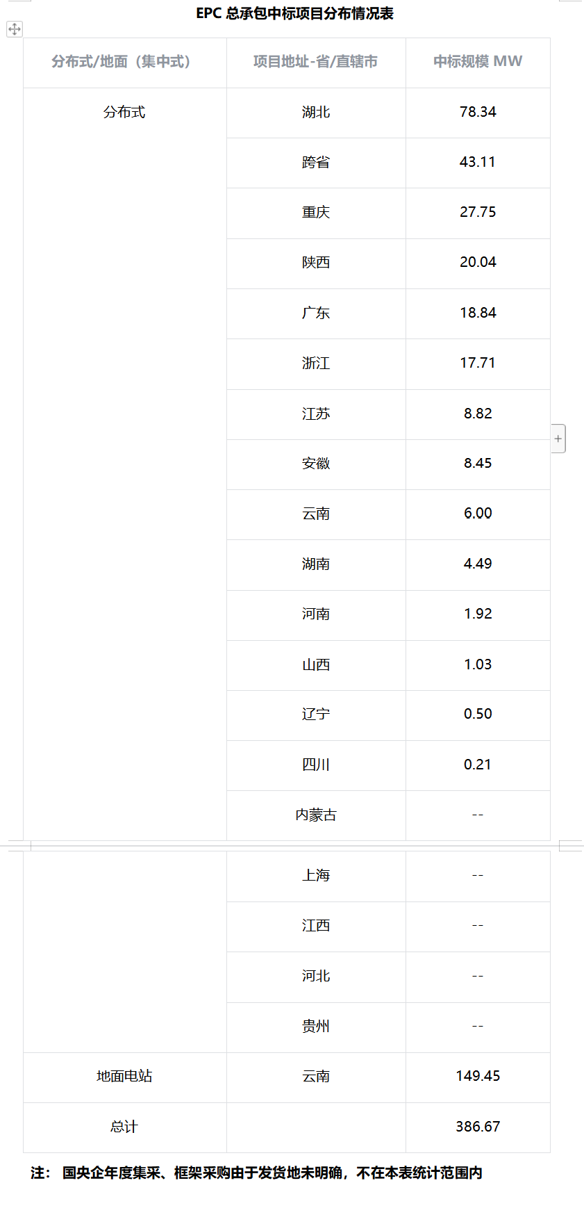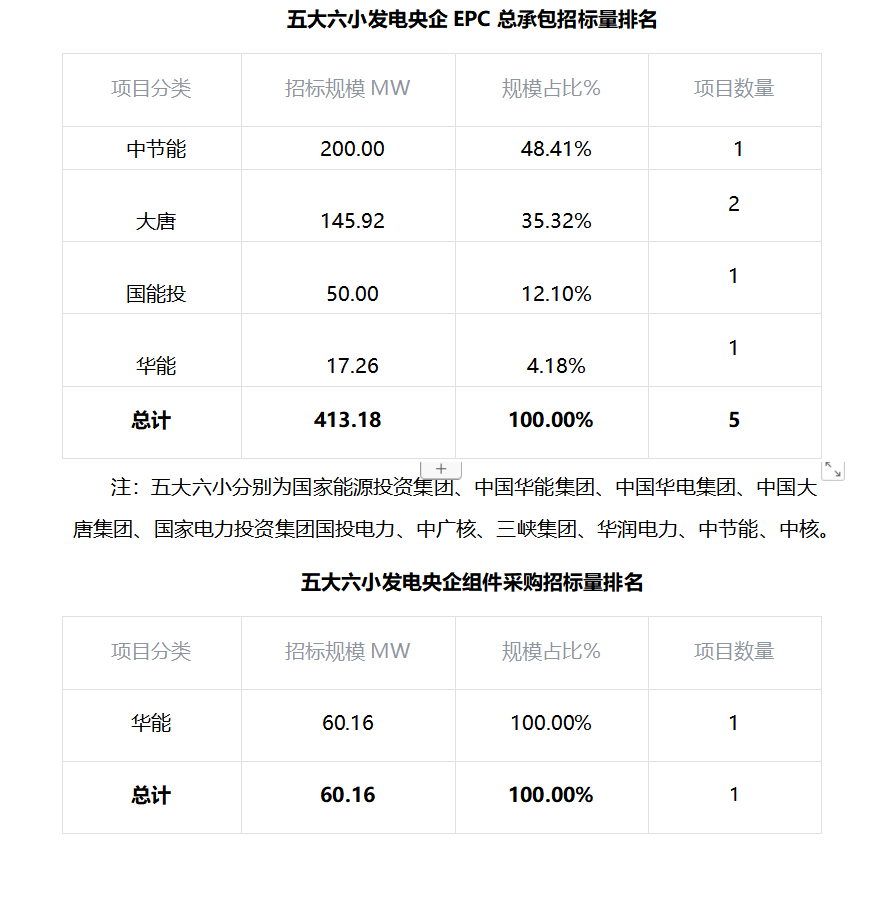 一、光伏項目招標情況匯總: 根據Gessey蓋錫咨詢統計,2025年9月1日(ri)(ri)-9月5日(ri)(ri)累計光伏(fu)(fu)招(zhao)(zhao)標(biao)(biao)(biao)(biao)項(xiang)(xiang)目為(wei)129個,項(xiang)(xiang)目規(gui)(gui)模(mo)(mo)合計為(wei)2828.31MW。光伏(fu)(fu)組件采購招(zhao)(zhao)標(biao)(biao)(biao)(biao)項(xiang)(xiang)目為(wei)14個,招(zhao)(zhao)標(biao)(biao)(biao)(biao)規(gui)(gui)模(mo)(mo)為(wei)497.43MW,EPC總(zong)承包招(zhao)(zhao)標(biao)(biao)(biao)(biao)項(xiang)(xiang)目為(wei)115個,招(zhao)(zhao)標(biao)(biao)(biao)(biao)規(gui)(gui)模(mo)(mo)為(wei)2330.87MW。 我們統(tong)計包含大(da)型央企(qi)(qi)國企(qi)(qi)、地方能源集團、地方政府機關、兩大(da)電網、央企(qi)(qi)總包企(qi)(qi)業(ye)、知(zhi)名光伏企(qi)(qi)業(ye)等(deng),其中五大(da)六小發電央企(qi)(qi)占總招標規模較高,具(ju)體各企(qi)(qi)業(ye)排名如下表: 二、中標項目分布類型匯總情況 本周(zhou)中(zhong)標項目需(xu)求按照招標場(chang)景地(di)分布,分布式光伏(fu)主(zhu)要(yao)集(ji)(ji)中(zhong)在(zai)湖北、重(zhong)慶、陜西(xi)等地(di)區(qu)(qu),即主(zhu)要(yao)集(ji)(ji)中(zhong)在(zai)華中(zhong)和(he)西(xi)南地(di)區(qu)(qu);集(ji)(ji)中(zhong)式光伏(fu)主(zhu)要(yao)集(ji)(ji)中(zhong)在(zai)云南地(di)區(qu)(qu),即主(zhu)要(yao)集(ji)(ji)中(zhong)在(zai)西(xi)南地(di)區(qu)(qu)。 三、EPC總承包及組件采購情況匯總 本月光伏EPC總承包中(zhong)(zhong)標規模達(da)386.67 MW,總中(zhong)(zhong)標金額62754.29萬(wan)元,平均中(zhong)(zhong)標單價為3.28元/W,中(zhong)(zhong)標數量76個。 本月光伏組件采(cai)購中(zhong)(zhong)標(biao)(biao)規(gui)模達796.9 MW,總中(zhong)(zhong)標(biao)(biao)金(jin)額35794.44萬元(yuan),平均中(zhong)(zhong)標(biao)(biao)單價為(wei)0.72元(yuan)/W,中(zhong)(zhong)標(biao)(biao)數量14個。