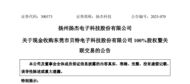 22.18億,揚杰科技擬收購貝特電子100%股權2025-09-12 11:59來源:gessey瀏覽數:227次