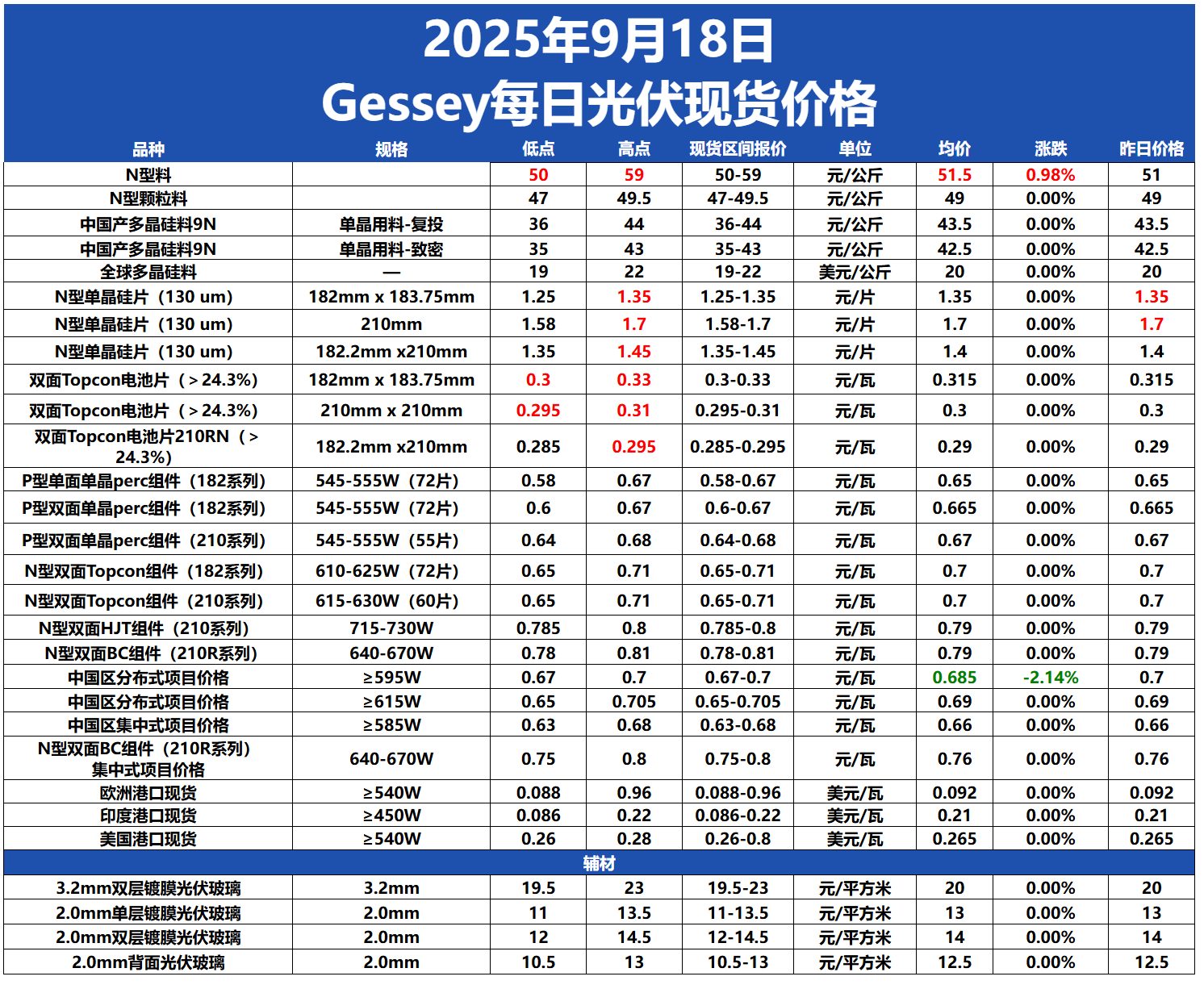 電池片: 今日電(dian)(dian)(dian)池片(pian)價格(ge)(ge)整(zheng)體維穩,24.3%以(yi)上(shang)183.75mm雙(shuang)面Topcon電(dian)(dian)(dian)池片(pian)主流(liu)價格(ge)(ge)在(zai)(zai)(zai)0.3-0.33元(yuan)/瓦(wa)(wa),均(jun)價0.315元(yuan)/瓦(wa)(wa)。24.3%以(yi)上(shang)210mm雙(shuang)面Topcon電(dian)(dian)(dian)池片(pian)主流(liu)價格(ge)(ge)在(zai)(zai)(zai)0.295-0.31元(yuan)/瓦(wa)(wa),均(jun)價0.3元(yuan)/瓦(wa)(wa)。24.3%以(yi)上(shang)210Rmm雙(shuang)面Topcon電(dian)(dian)(dian)池片(pian)主流(liu)價格(ge)(ge)在(zai)(zai)(zai)0.285-0.295元(yuan)/瓦(wa)(wa),均(jun)價0.29元(yuan)/瓦(wa)(wa)。 組件: 今日(ri)組(zu)(zu)件(jian)(jian)價(jia)(jia)(jia)(jia)格小幅下跌(die),雙面(mian)(mian)單晶(jing)perc組(zu)(zu)件(jian)(jian)(182系(xi)(xi)列)價(jia)(jia)(jia)(jia)格在(zai)(zai)(zai)0.6-0.67元(yuan)(yuan)(yuan)(yuan)/瓦(wa)(wa)(wa),均(jun)價(jia)(jia)(jia)(jia)為(wei)0.665元(yuan)(yuan)(yuan)(yuan)/瓦(wa)(wa)(wa)。雙面(mian)(mian)單晶(jing)perc組(zu)(zu)件(jian)(jian)(210系(xi)(xi)列)價(jia)(jia)(jia)(jia)格在(zai)(zai)(zai)0.64-0.68元(yuan)(yuan)(yuan)(yuan)/瓦(wa)(wa)(wa),均(jun)價(jia)(jia)(jia)(jia)為(wei)0.67元(yuan)(yuan)(yuan)(yuan)/瓦(wa)(wa)(wa)。N型雙面(mian)(mian)Topcon組(zu)(zu)件(jian)(jian)(182系(xi)(xi)列)價(jia)(jia)(jia)(jia)格在(zai)(zai)(zai)0.65-0.71元(yuan)(yuan)(yuan)(yuan)/瓦(wa)(wa)(wa),均(jun)價(jia)(jia)(jia)(jia)為(wei)0.7元(yuan)(yuan)(yuan)(yuan)/瓦(wa)(wa)(wa)。N型雙面(mian)(mian)Topcon組(zu)(zu)件(jian)(jian)(210系(xi)(xi)列)價(jia)(jia)(jia)(jia)格在(zai)(zai)(zai)0.65-0.71元(yuan)(yuan)(yuan)(yuan)/瓦(wa)(wa)(wa),均(jun)價(jia)(jia)(jia)(jia)為(wei)0.7元(yuan)(yuan)(yuan)(yuan)/瓦(wa)(wa)(wa)。N型雙面(mian)(mian)HJT組(zu)(zu)件(jian)(jian)(210系(xi)(xi)列)價(jia)(jia)(jia)(jia)格在(zai)(zai)(zai)0.785-0.8元(yuan)(yuan)(yuan)(yuan)/瓦(wa)(wa)(wa),均(jun)價(jia)(jia)(jia)(jia)為(wei)0.79元(yuan)(yuan)(yuan)(yuan)/瓦(wa)(wa)(wa)。N型雙面(mian)(mian)BC組(zu)(zu)件(jian)(jian)(210R系(xi)(xi)列)價(jia)(jia)(jia)(jia)格在(zai)(zai)(zai)0.78-0.81元(yuan)(yuan)(yuan)(yuan)/瓦(wa)(wa)(wa),均(jun)價(jia)(jia)(jia)(jia)為(wei)0.79元(yuan)(yuan)(yuan)(yuan)/瓦(wa)(wa)(wa)。中(zhong)國區分布(bu)式項目(≥595W)價(jia)(jia)(jia)(jia)格在(zai)(zai)(zai)0.67-0.7元(yuan)(yuan)(yuan)(yuan)/瓦(wa)(wa)(wa),均(jun)價(jia)(jia)(jia)(jia)為(wei)0.685元(yuan)(yuan)(yuan)(yuan)/瓦(wa)(wa)(wa),下跌2.14%,中(zhong)國(guo)區分布(bu)式(shi)項目(≥615W)價(jia)(jia)(jia)(jia)格(ge)在(zai)0.65-0.705元(yuan)/瓦(wa)(wa),均(jun)價(jia)(jia)(jia)(jia)為(wei)0.69元(yuan)/瓦(wa)(wa),中(zhong)國(guo)區集(ji)中(zhong)式(shi)項目(≥585W)價(jia)(jia)(jia)(jia)格(ge)在(zai)0.63-0.68元(yuan)/瓦(wa)(wa),均(jun)價(jia)(jia)(jia)(jia)為(wei)0.66元(yuan)/瓦(wa)(wa)。N型雙面(mian)BC組件(jian)(210R系列)集(ji)中(zhong)式(shi)項目價(jia)(jia)(jia)(jia)格(ge)在(zai)0.75-0.8元(yuan)/瓦(wa)(wa),均(jun)價(jia)(jia)(jia)(jia)為(wei)0.76元(yuan)/瓦(wa)(wa)。歐洲港(gang)(gang)口現(xian)貨(huo)(huo)(huo)價(jia)(jia)(jia)(jia)格(ge)在(zai)0.088-0.96美(mei)(mei)(mei)元(yuan)/瓦(wa)(wa),均(jun)價(jia)(jia)(jia)(jia)為(wei)0.092美(mei)(mei)(mei)元(yuan)/瓦(wa)(wa)。印(yin)度港(gang)(gang)口現(xian)貨(huo)(huo)(huo)價(jia)(jia)(jia)(jia)格(ge)在(zai)0.086-0.22美(mei)(mei)(mei)元(yuan)/瓦(wa)(wa),均(jun)價(jia)(jia)(jia)(jia)為(wei)0.21美(mei)(mei)(mei)元(yuan)/瓦(wa)(wa)。美(mei)(mei)(mei)國(guo)港(gang)(gang)口現(xian)貨(huo)(huo)(huo)價(jia)(jia)(jia)(jia)格(ge)在(zai)0.26-0.28美(mei)(mei)(mei)元(yuan)/瓦(wa)(wa),均(jun)價(jia)(jia)(jia)(jia)為(wei)0.265美(mei)(mei)(mei)元(yuan)/瓦(wa)(wa)。 玻璃: 今日(ri)玻(bo)(bo)(bo)璃(li)價(jia)格(ge)整體維穩,3.2mm雙層(ceng)(ceng)鍍膜(mo)光(guang)(guang)伏玻(bo)(bo)(bo)璃(li)價(jia)格(ge)在(zai)(zai)19.5-23元/平方(fang)(fang)(fang)米(mi),均價(jia)為20元/平方(fang)(fang)(fang)米(mi)。2.0mm單層(ceng)(ceng)鍍膜(mo)光(guang)(guang)伏玻(bo)(bo)(bo)璃(li)價(jia)格(ge)在(zai)(zai)11-13.5元/平方(fang)(fang)(fang)米(mi),均價(jia)為13元/平方(fang)(fang)(fang)米(mi)。2.0mm雙層(ceng)(ceng)鍍膜(mo)光(guang)(guang)伏玻(bo)(bo)(bo)璃(li)價(jia)格(ge)在(zai)(zai)12-14.5元/平方(fang)(fang)(fang)米(mi),均價(jia)為14元/平方(fang)(fang)(fang)米(mi)。2.0mm背面光(guang)(guang)伏玻(bo)(bo)(bo)璃(li)價(jia)格(ge)在(zai)(zai)10.5-13元/平方(fang)(fang)(fang)米(mi),均價(jia)為12.5元/平方(fang)(fang)(fang)米(mi)。