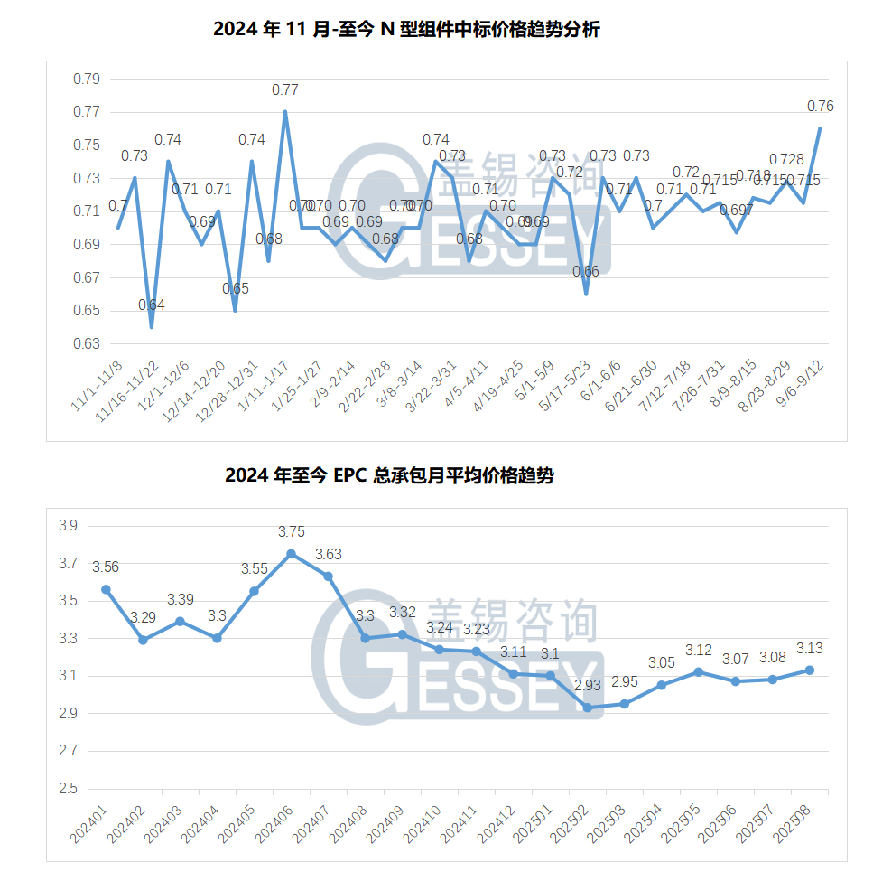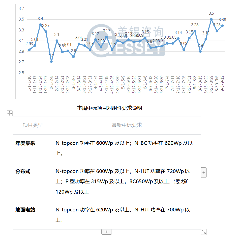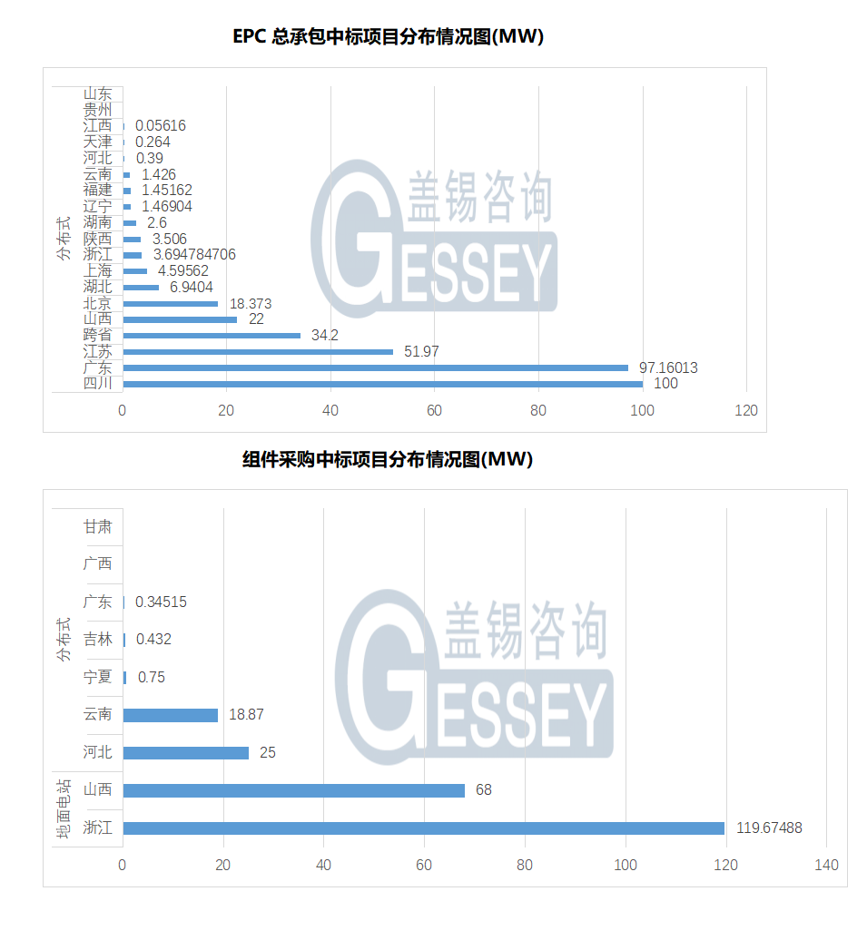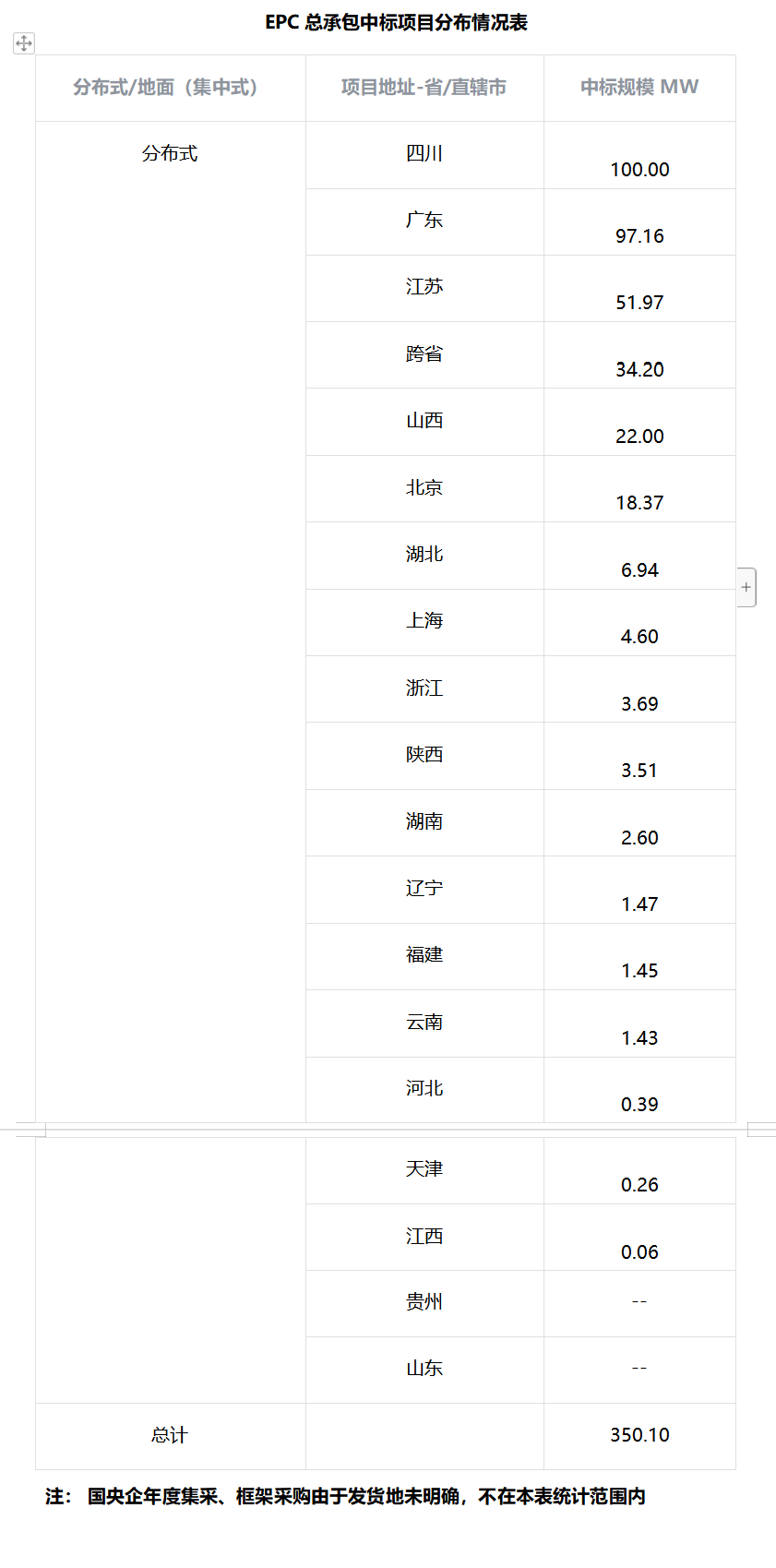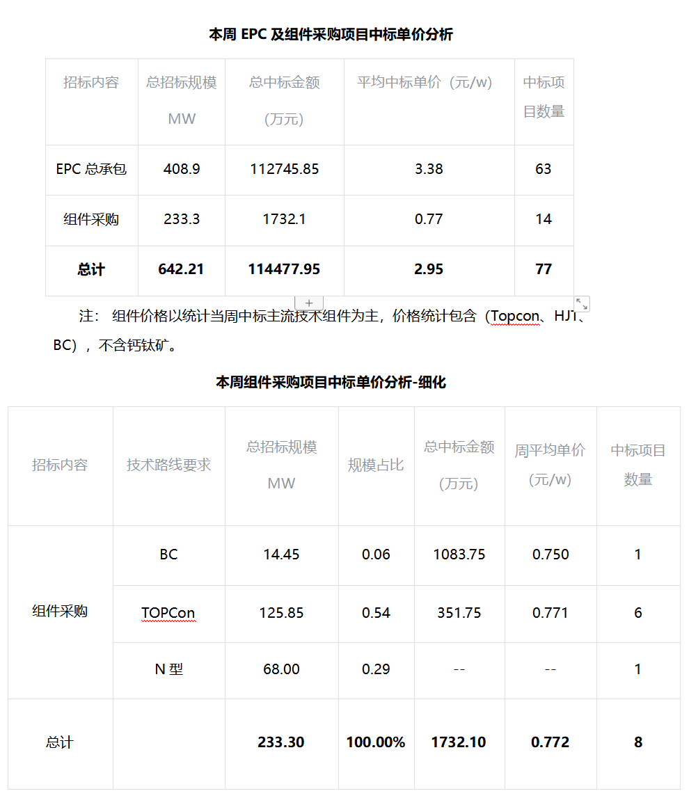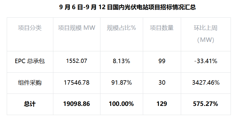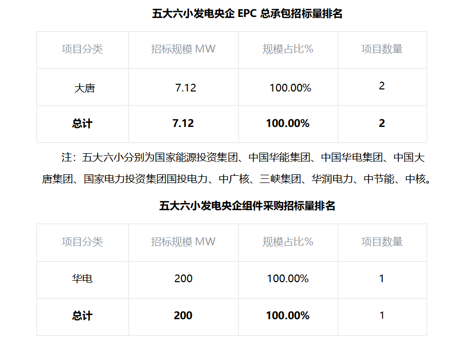 一、光伏項目招標情況匯總: 根據Gessey蓋錫咨詢統(tong)計(ji)(ji),2025年(nian)9月(yue)6日(ri)-9月(yue)12日(ri)累計(ji)(ji)光伏招(zhao)標(biao)(biao)(biao)項(xiang)(xiang)目(mu)(mu)為(wei)(wei)129個(ge),項(xiang)(xiang)目(mu)(mu)規(gui)模(mo)合(he)計(ji)(ji)為(wei)(wei)19098.86MW。光伏組件(jian)采(cai)購招(zhao)標(biao)(biao)(biao)項(xiang)(xiang)目(mu)(mu)為(wei)(wei)30個(ge),招(zhao)標(biao)(biao)(biao)規(gui)模(mo)為(wei)(wei)17546.78 MW,EPC總(zong)承(cheng)包招(zhao)標(biao)(biao)(biao)項(xiang)(xiang)目(mu)(mu)為(wei)(wei)99個(ge),招(zhao)標(biao)(biao)(biao)規(gui)模(mo)為(wei)(wei)1552.07 MW。 我們(men)統計包(bao)含大(da)型(xing)央企(qi)(qi)(qi)國企(qi)(qi)(qi)、地方能源集團、地方政(zheng)府機關、兩大(da)電(dian)網、央企(qi)(qi)(qi)總包(bao)企(qi)(qi)(qi)業(ye)、知(zhi)名光伏企(qi)(qi)(qi)業(ye)等,其(qi)中五大(da)六小發電(dian)央企(qi)(qi)(qi)占總招標規(gui)模較高,具體各企(qi)(qi)(qi)業(ye)排名如(ru)下(xia)表: 二、中標項目分布類型匯總情況 本周中(zhong)標項目(mu)需求按照招標場景(jing)地(di)(di)分布,分布式(shi)光(guang)伏(fu)主要(yao)集(ji)中(zhong)在(zai)四川、廣東、江(jiang)蘇(su)等地(di)(di)區,即主要(yao)集(ji)中(zhong)在(zai)西南和華(hua)南地(di)(di)區;集(ji)中(zhong)式(shi)光(guang)伏(fu)主要(yao)集(ji)中(zhong)在(zai)浙(zhe)江(jiang)地(di)(di)區,即主要(yao)集(ji)中(zhong)在(zai)華(hua)東地(di)(di)區。 三、EPC總承包及組件采購情況匯總 本月光伏EPC總(zong)承包中標(biao)(biao)規模達408.9 MW,總(zong)中標(biao)(biao)金額112745.85萬(wan)元(yuan),平均中標(biao)(biao)單價為3.38元(yuan)/W,中標(biao)(biao)數量63個。 本月光伏組件采購中(zhong)標規模達(da)233.3 MW,總(zong)中(zhong)標金額1732.1萬元,平均中(zhong)標單價為0.77元/W,中(zhong)標數量14個(ge)。