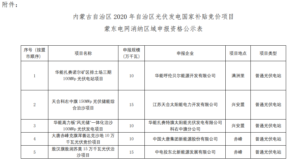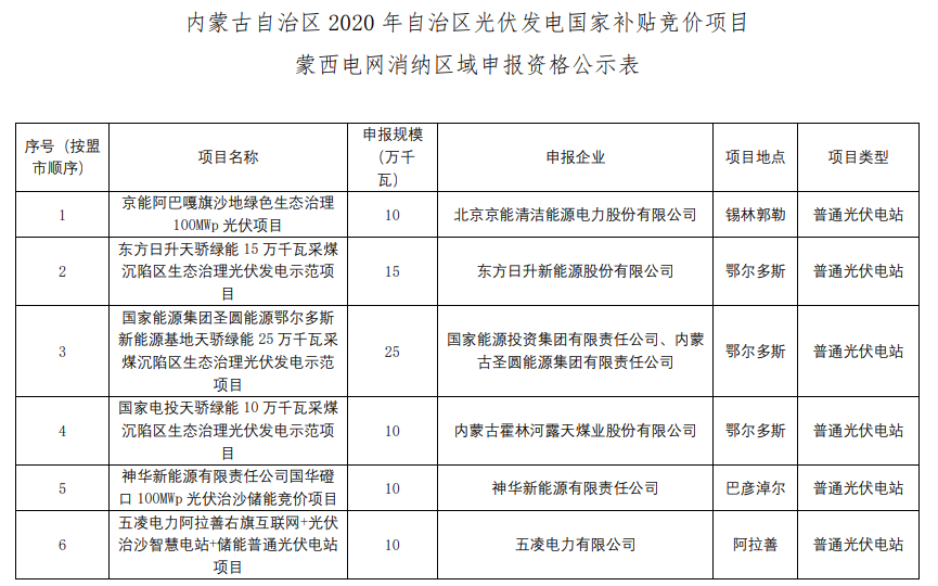 5月29日,內蒙古自治區公示2020年光伏發電國家補貼競價項目名單,11個項目共計1.4GW進入該名單。其中,國電投、國能投各350MW,華能200MW,天合光能、東方日升各150MW,京能、大唐各100MW。 從投資企業來看,大部分均為央企或者國企,此外天合光能、東方日升也取得了不錯的成績。從項目規模來看,單體規模100MW起,最大的項目為國家能投鄂爾多斯的250MW采煤沉陷區生態治理項目。 公示原文如下: 內蒙古自治區能源局關于2020年光伏發電國家補貼競價項目申報資格的公示 根據國家能源局《關于2020年風電、光伏發電項目建設有關事項的通知》(國能發新能〔2020〕17號)和《內蒙古自治區能源局轉發國家能源局關于2020年風電、光伏發電項目建設有關事項的通知》(內能新能字〔2020〕170號)規定及有關要求,按照公平公正、科學客觀的原則,內蒙古自治區能源局委托技術管理機構組織專家對盟市申報項目的申報價格、工程建設條件和并網條件等進行客觀評分,優選出了申報國家補貼項目名單,現予以公示。 公示期為2020年5月29日-6月2日。如對公示內容有異議,請在公示期以書面形式提出意見反饋內蒙古自治區能源局新能源和可再生能源處。書面意見請寫明提出異議的事實依據和理由。單位提出意見應注明單位名稱、地址郵編、聯系人姓名、聯系方式等,并加蓋單位公章;個人提出意見應注明姓名、身份證號碼、工作單位、地址郵編和聯系方式等。提出異議的單位或個人應對異議材料的真實性和可靠性負責,自治區能源局將對提出異議的單位和個人嚴格保密。對匿名或無事實依據的異議以及涉及自身利益的不正當要求,不予受理。自治區能源局將對有效反饋意見進行認真復核,對于影響優選結果的,相應項目不予申報。通過公示的項目,我局將按程序報送至國家能源局。 傳真:0471-6651872; 電話:0471-6604580(工作日工作時間) 內蒙古自治區能源局 2020年5月28日 附件:內蒙古自治區2020年自治區光伏發電國家補貼競價項目申報資格公示表.pdf