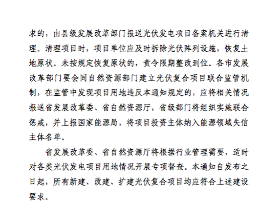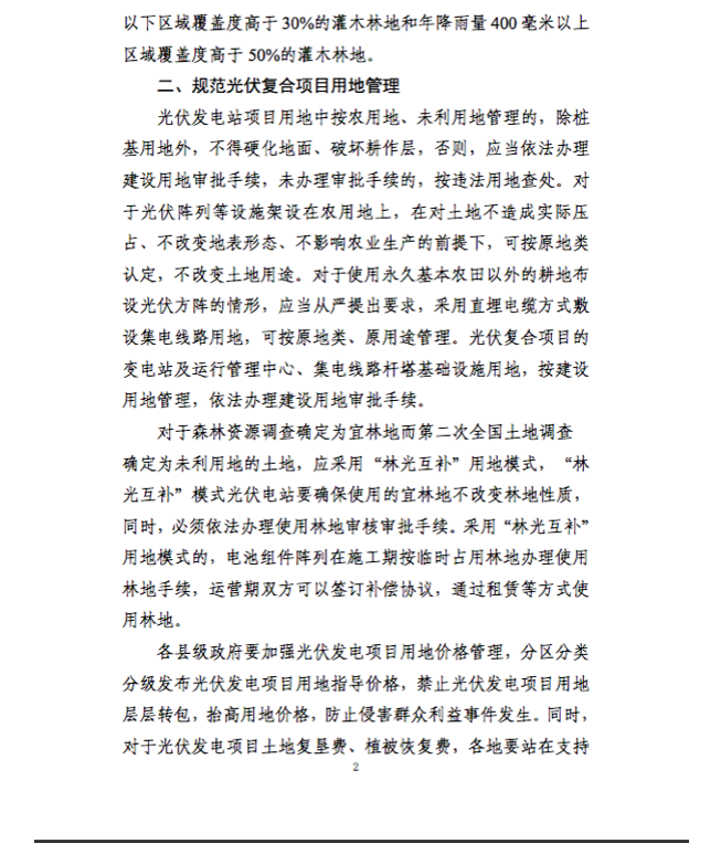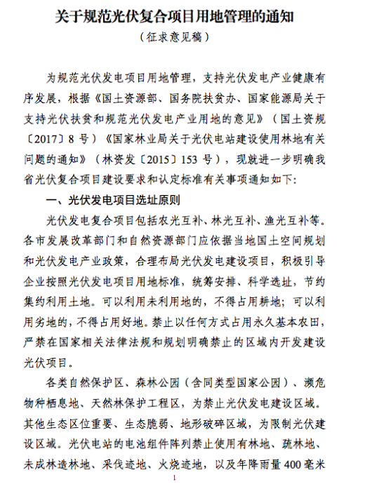 5月27日,陜西省能源局發布《關于規范光伏復合項目用地管理的通知》(征求意見稿),文件指出,禁止以任何方式占用永久基本農田,嚴禁在國家相關法律法規和規劃明確禁止的區域內開發建設光伏項目。 各類自然保護區、森林公園(含同類型國家公園)、瀕危物種棲息地、天然林保護工程區,為禁止光伏發電建設區域。其他生態區位重要、生態脆弱、地形破碎區域,為限制光伏建設區域。光伏電站的電池組件陣列禁止使用有林地、疏林地、未成林造林地、采伐跡地、火燒跡地,以及年降雨量400毫米以下區域覆蓋度高于30%的灌木林地和年降雨量400毫米以上區域覆蓋度高于50%的灌木林地。 原文如下: 關于征求規范光伏復合項目用地管理意見的公告 為促進我省光伏發電產業健康有序發展,規范光伏發電項目用地管理,在充分調研的基礎上,我們草擬了《關于規范光伏復合項目用地管理的通知》(征求意見稿),現向社會公開征求意見,歡迎有關單位和社會各界人士就有關內容提出寶貴意見和建議。 郵箱:sxfgwxnyc@163.com 陜西省能源局 2020年5月20日