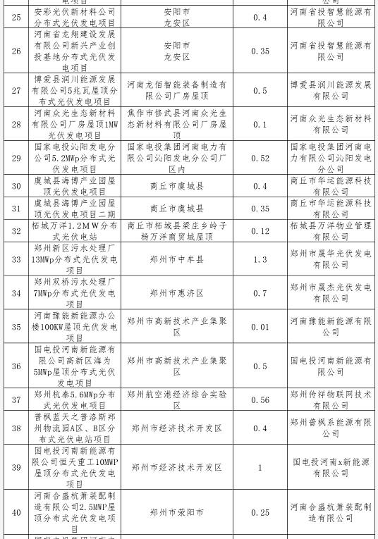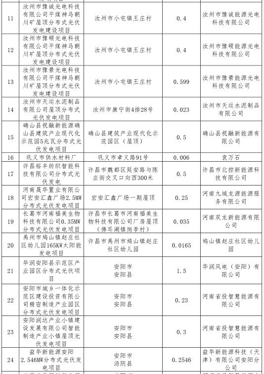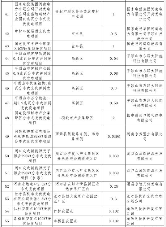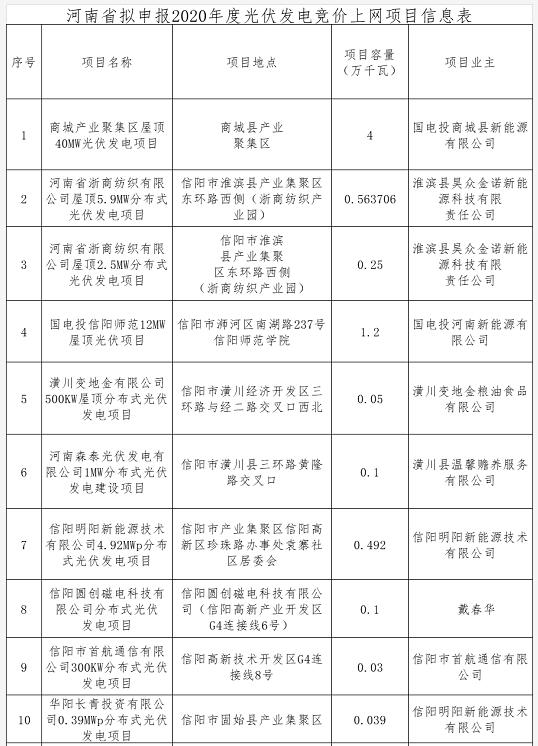 按照《國家能源局關于2020年風電、光伏發電項目建設有關事項的通知》(國能發新能﹝2020﹞17號)和《河南省發展和改革委員會辦公室關于開展2020年光伏發電競價上網項目申報工作的通知》(豫發改辦新能源﹝2020﹞41號)等有關要求,我省各市(縣)組織光伏發電企業申報了2020年光伏發電競價上網項目。經我委會同省電力公司初審,共確定符合條件申報項目96個,總規模45萬千瓦。現將項目名單予以公示。 公示時間從2020年6月12日至6月14日(共3日),如有意見和建議,請以電子郵件方式向我委反映,并具體列舉相關理由及證明材料。單位意見請加蓋單位公章并注明聯系方式;個人意見請注明真實姓名、身份證號碼和聯系方式;對匿名方式提出的異議不予受理。 聯系電話:0371-69691104;15981815593 電子郵箱:hnsxny@163.com 附件:河南省擬申報2020年度光伏發電競價上網項目信息表