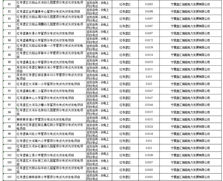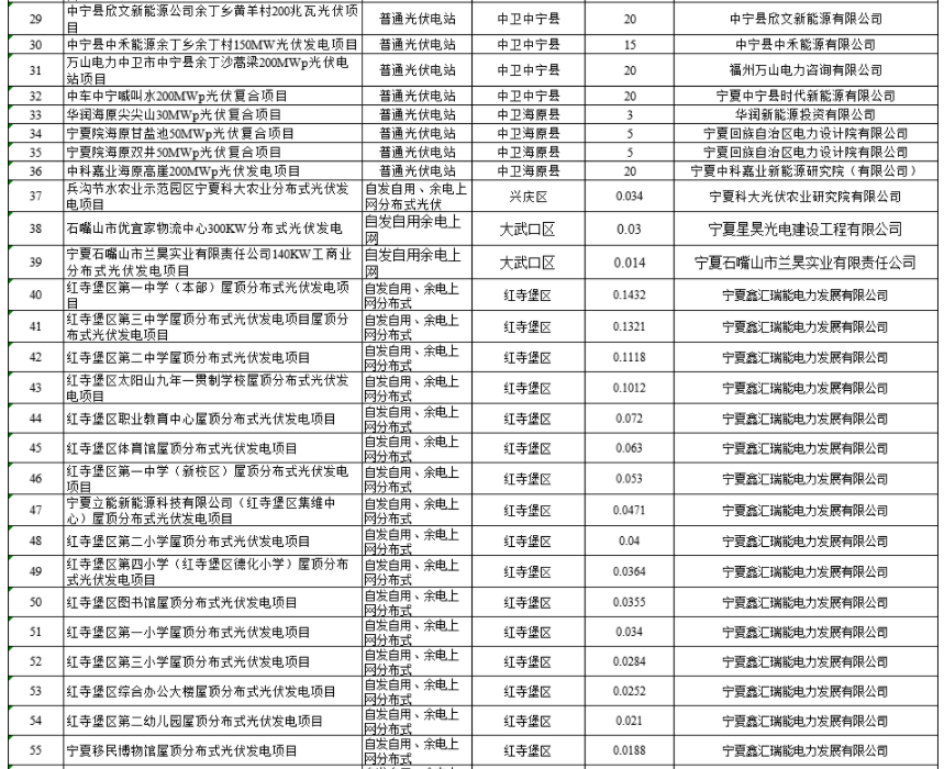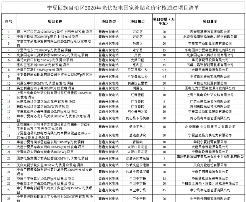 今日,寧夏自治區發(fa)(fa)展改革委發(fa)(fa)布關于全(quan)區2020年(nian)光伏發(fa)(fa)電國(guo)家補貼(tie)競價項(xiang)目審核結果的(de)通告,根(gen)據通告名單,參(can)與2020年(nian)寧夏的(de)競價項(xiang)目共162個,規(gui)模(mo)475.08888萬(wan)千(qian)瓦(wa),其(qi)中(zhong):集(ji)中(zhong)式項(xiang)目36個,規(gui)模(mo)為472萬(wan)千(qian)瓦(wa);分布式項(xiang)目126個,規(gui)模(mo)為3.08888萬(wan)千(qian)瓦(wa)。 據統計,中(zhong)電建獲得的競價規(gui)模最大,為250MW,華(hua)潤、國(guo)開新能源、北京國(guo)電中(zhong)興(xing)科技、中(zhong)核山(shan)東(dong)、京能、隆基、天合、中(zhong)船(chuan)重工各(ge)獲得200MW,大唐155MW、華(hua)電、晶(jing)澳各(ge)150M。部分企業獲得項目規(gui)模如下: 原文如下: 按照《國家能源局關于2020年風電、光伏發電項目建設有關事項的通知》(國能發新能〔2020〕17號)有關要求,經對各地上報申請2020年光伏補(bu)貼競價項目的主體、用(yong)地、電網(wang)接入及稅費政策等條件(jian)進行審核,現(xian)確定參與2020年光伏發電國家補貼競價項目162個,規(gui)模(mo)為475.08888萬千瓦(wa)(其(qi)中(zhong):集(ji)中(zhong)式(shi)項目36個,規(gui)模(mo)為472萬千瓦(wa);分布式(shi)項目126個,規(gui)模(mo)為3.08888萬千瓦(wa)),予以通(tong)告。 寧夏回(hui)族自治區(qu)發(fa)展改革(ge)委 2020年6月12日