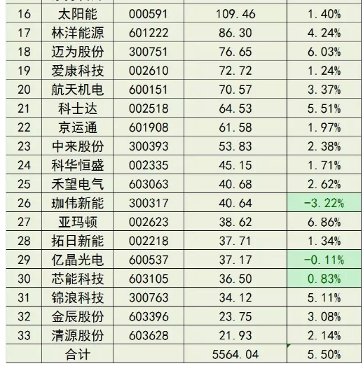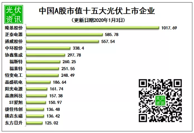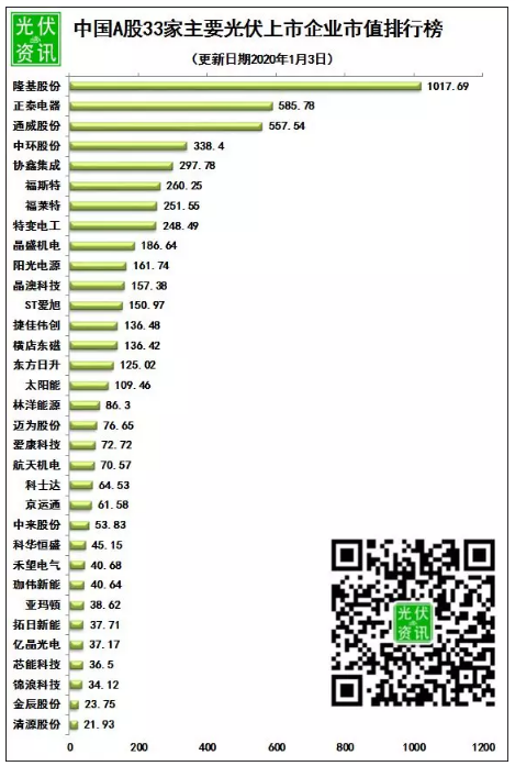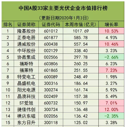 修改后光伏(fu)企業名(ming)單,共包含(han)(han)33家(jia)光(guang)伏企(qi)(qi)(qi)業(ye)(ye),其(qi)中上(shang)海證(zheng)券交易所(suo)15家(jia),深(shen)圳證(zheng)券交易所(suo)10家(jia),深(shen)交所(suo)創業(ye)(ye)板(ban)8家(jia),不包含(han)(han)港 交所(suo)和美股(gu)上(shang)市(shi)的光(guang)伏企(qi)(qi)(qi)業(ye)(ye)。33家(jia)光(guang)伏企(qi)(qi)(qi)業(ye)(ye)中包含(han)(han)電(dian)站投資企(qi)(qi)(qi)業(ye)(ye)、逆變器生(sheng)產(chan)企(qi)(qi)(qi)業(ye)(ye)、組件生(sheng)產(chan)企(qi)(qi)(qi)業(ye)(ye)、硅(gui)片企(qi)(qi)(qi)業(ye)(ye)、硅(gui)料企(qi)(qi)(qi)業(ye)(ye)、設備生(sheng)產(chan)企(qi)(qi)(qi)業(ye)(ye)、玻璃及背(bei)板(ban)生(sheng)產(chan)企(qi)(qi)(qi)業(ye)(ye)等,具有(you)較(jiao)好(hao)的代表性。 (來(lai)源:微信公眾號“光伏資訊”ID:PV-info) 截止2020年1月3日下午收盤,33家光(guang)伏企業市值總計5585.5億元(yuan),比上(shang)周增長290億元(yuan),增加5.5%。其中龍頭(tou)光伏(fu)股-隆(long)基股份(fen)(fen)、通威股份(fen)(fen)等更是上(shang)漲超過10%! 雖然2020年(nian)的(de)(de)(de)光(guang)伏政策尚未下發,通過國家能源局(ju)的(de)(de)(de)征求意見稿(gao),我們(men)明確2020年(nian)競(jing)價項(xiang)目(mu)配置工作總體(ti)思路、項(xiang)目(mu)管理(li)、競(jing)爭配置方法仍按2019年(nian)工作方案執行。預(yu)期明朗的(de)(de)(de)狀況下,加上經濟大環境在改善,多重利好(hao)的(de)(de)(de)助推下,光(guang)伏股票實(shi)現了近期來少見的(de)(de)(de)普漲,且光(guang)伏龍(long)頭(tou)股有大漲。再一(yi)次印證了投資者和行業人士,更加看好(hao)2020年(nian)的(de)(de)(de)光(guang)伏行情,認為會實(shi)現預(yu)期的(de)(de)(de)增(zeng)長。 在(zai)市值(zhi)方面,隆基股(gu)(gu)份(fen)依然遙(yao)遙(yao)領先,總市值(zhi)再(zai)次超越1000億元(yuan),達到(dao)1017.69億元(yuan),金辰股(gu)(gu)份(fen)終于擺脫(tuo)了倒數第(di)一,市值(zhi)為(wei)23.75億元(yuan),清(qing)源(yuan)股(gu)(gu)份(fen)市值(zhi)最低(di)為(wei)21.93億元(yuan)。增(zeng)(zeng)長率方面,捷佳偉創(chuang)本周(zhou)上(shang)(shang)漲12.7%,隆基股(gu)(gu)份(fen)通(tong)威股(gu)(gu)份(fen)本周(zhou)上(shang)(shang)漲10.5%,居(ju)于增(zeng)(zeng)長前三位;本周(zhou)負增(zeng)(zeng)長41家(jia),最低(di)為(wei)珈偉新能,增(zeng)(zeng)長率為(wei)-3.2%。 詳見下表: 本(ben)(ben)周(zhou)光(guang)伏證券指(zhi)數(shu)開始(shi)抬(tai)升,達到102.69%,對(dui)A股指(zhi)數(shu)對(dui)比,下降幅度較(jiao)小,可以(yi)看出資本(ben)(ben)市場對(dui)光(guang)伏行業信心(xin)正在快速提升!