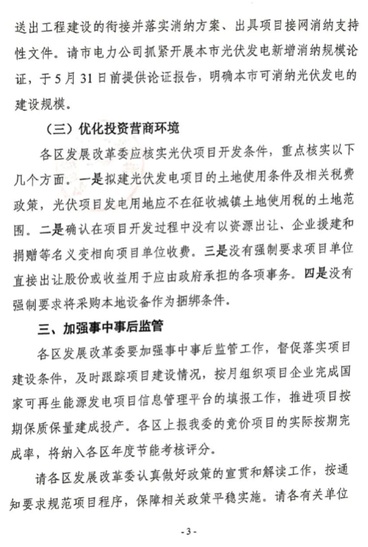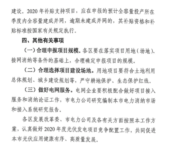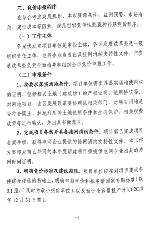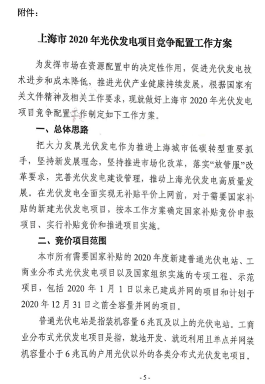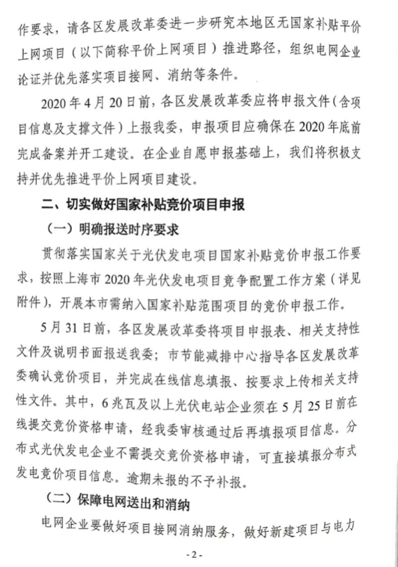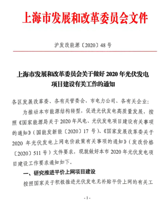 近日,上海市發改委下發《關于做好2020年光伏發電項目建設有關工作的通知》(以下簡稱“《通知》”,要求平價光伏項目4月20日前報送,競價光伏項目5月31日前報送。 《通知》要求,申報平價光伏的項目要確保在2020年底前完成備案并開工建設。申報競價光伏的項目預計全容量投產時間在2020年12月31日前。 上海市所有需要國家補貼的2020年度新建普通光伏電站、工商業分布式光伏發電項目以及國家組織實施的專項工程、示范項目,包括2020年1月1日以來已建成并網的項目和計劃于2020年12月31日之前全容量并網的項目均可以參與競價。 參與競價的光伏項目需按要求落實場地、完成項目備案并具備接網消納條件、明確競價標準及建設期限。 《通知》原文如下: