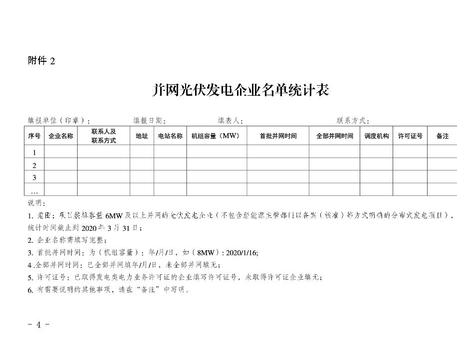 日前,湖南能監辦發布《關于報送并網風電、光伏發(fa)電企(qi)(qi)業名單(dan)(dan)的通知(國(guo)網(wang)湖南(nan)(nan)省電力有(you)限公司)》,要求(qiu)國(guo)網(wang)湖南(nan)(nan)省電力有(you)限公司對調度范(fan)圍內(nei)的風(feng)電、光伏發電企(qi)(qi)業名單(dan)(dan)進行(xing)統(tong)(tong)計(ji)匯總(zong),于5月16日前將(jiang)《并(bing)(bing)網(wang)風(feng)電企(qi)(qi)業名單(dan)(dan)統(tong)(tong)計(ji)表》和《并(bing)(bing)網(wang)光伏發電企(qi)(qi)業名單(dan)(dan)統(tong)(tong)計(ji)表》電子版(ban)和紙(zhi)質版(ban)報送至國(guo)家(jia)能源局湖南(nan)(nan)監管(guan)辦公室。 根據附件表格,并網(wang)光伏發(fa)電(dian)(dian)企業統計范圍(wei):項(xiang)目裝機容量6MW及以上并網(wang)的(de)光伏發(fa)電(dian)(dian)企業(不(bu)包含經能源主管部門以備案(核準)等(deng)方式(shi)明確的(de)分布式(shi)發(fa)電(dian)(dian)項(xiang)目),統計時間截止至2020年3月31日。