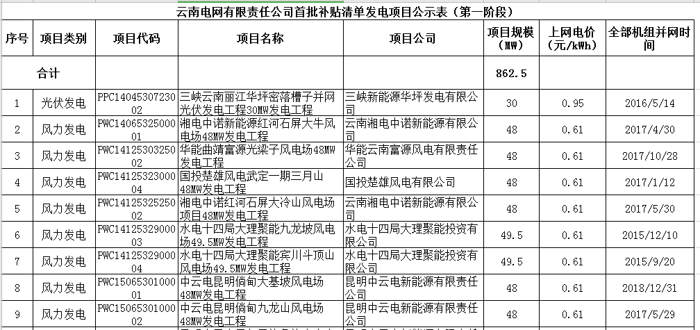 云南電網公司發布《關于云南電網首批可再生能源發電補貼項目清單(第一階段)的公示》,公示17個項目862.5MW;十六個風電項目,僅一個光伏項目30兆瓦納入目錄。 關于云南電網首批可再生能源發電補貼項目清單(第一階段)的公示 根據《財政部辦公廳關于開展可再生能源發電補貼項目清單審核有關工作的通知》(財辦建〔2020〕6號)和《國家可再生能源信息管理中心關于可再生能源發電補貼項目清單申報與審核工作有關要求的公告》等文件要求,相關可再生能源發電企業對滿足條件的可再生能源發電項目進行補貼清單申報,經云南電網初審、云南省能源局審核確認、國家可再生能源信息管理中心復核。現將國家可再生能源信息管理中心復核通過的首批補貼項目清單(第一階段)予以公示。 公示期從2020年5月15日至5月21日,公示期間,若對復核通過的補貼項目存在異議,請通過電話、QQ、書面等方式向云南電網有限責任公司計劃與財務部反映。 聯系人:荀波;聯系電話:0871-63012640; QQ號碼:550507890。 相關附件云南電網有限責任公司首批可再生能源發電補貼項目清單復核項目名單公示表(第一階段).xlsx