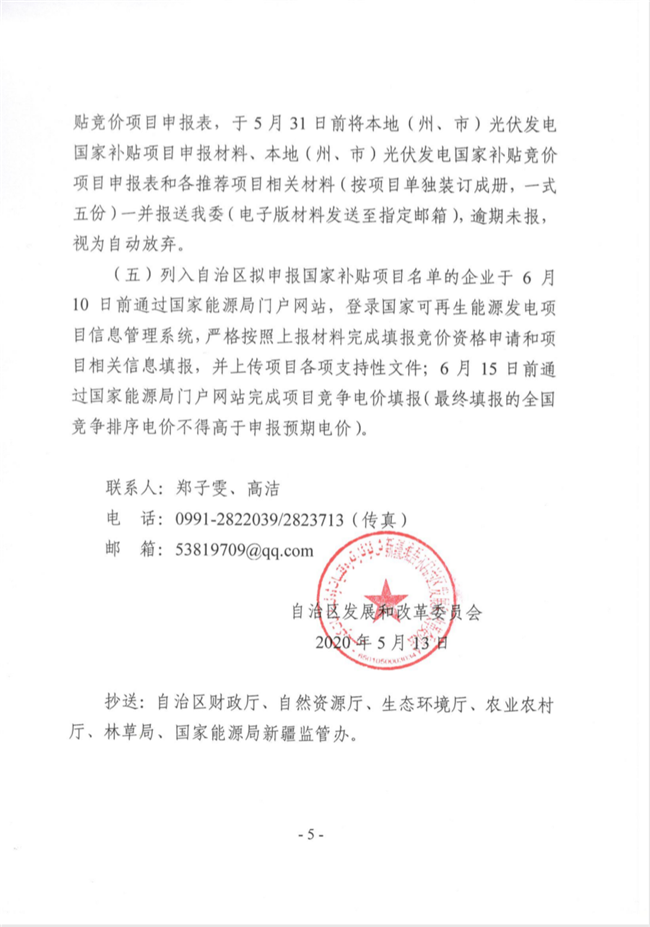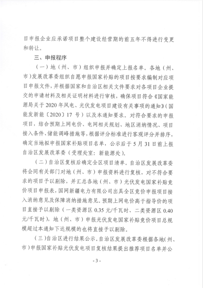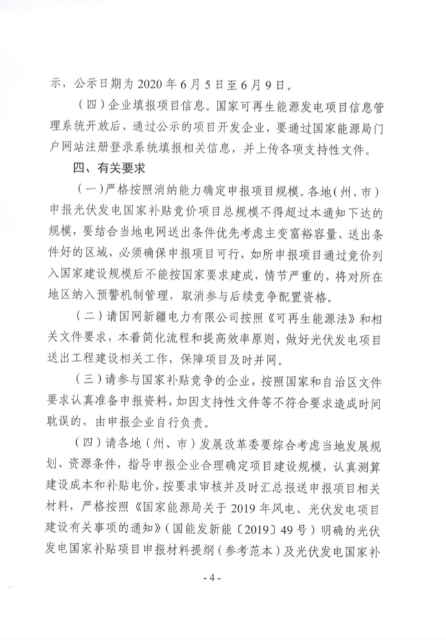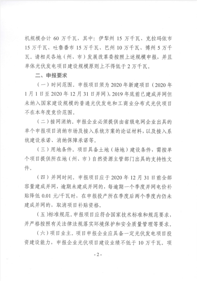 近日(ri),新疆發改委下(xia)(xia)發關于組織(zhi)申(shen)報2020年國(guo)家補貼光伏發電項目(mu)的通知(以下(xia)(xia)簡(jian)稱“通知”),指出新疆具備申(shen)報國(guo)家補貼光伏發電項目(mu)新增裝機規模(mo)合計60萬千(qian)瓦(wa),其(qi)中:伊犁州15萬千(qian)瓦(wa)、拉瑪依(yi)市(shi)15萬千(qian)瓦(wa)、吐魯番(fan)市(shi)15萬千(qian)瓦(wa)、巴州10萬千(qian)瓦(wa)、博州5萬千(qian)瓦(wa),前述各(ge)地(di)(di)(州、市(shi))也是(shi)新疆重點(dian)支(zhi)持申(shen)報地(di)(di)(州、市(shi)),其(qi)他地(di)(di)(州、市(shi))主要解決國(guo)家財政補貼存(cun)量項目(mu)。 通(tong)知明(ming)確(que),申報(bao)項目須為2020年(nian)(nian)新建(jian)項目(2020年(nian)(nian)1月1日至2020年(nian)(nian)12月31日并網),單體光伏發電項目建(jian)設規模原則(ze)上不得低于2萬千瓦。 通知原文如下: