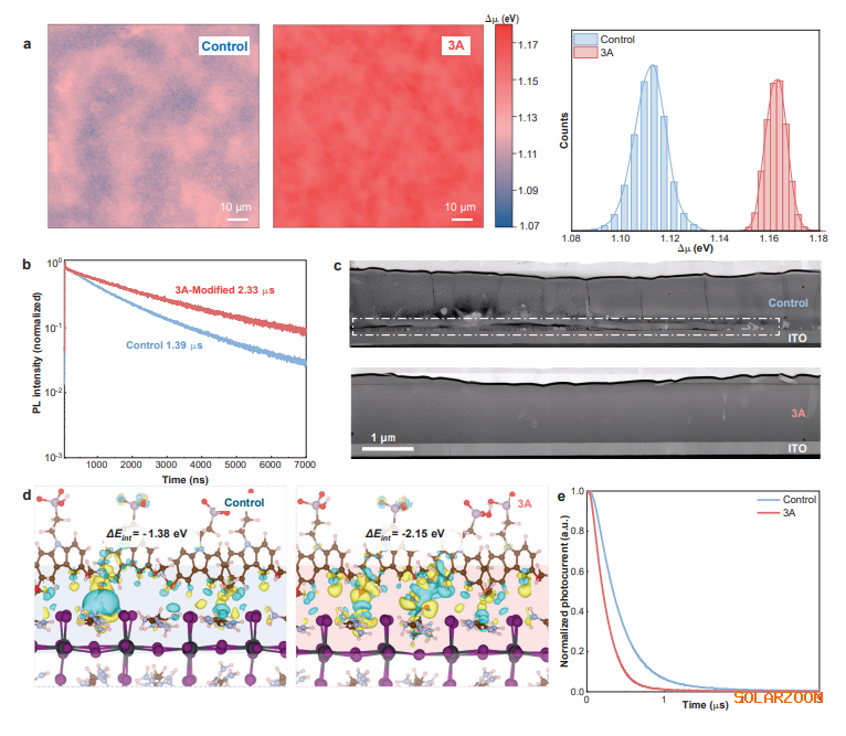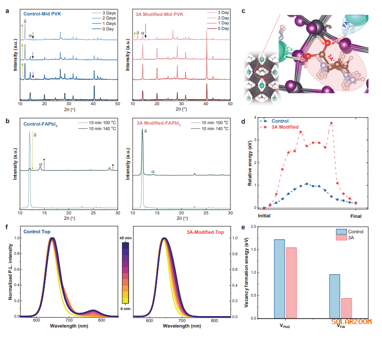 2025年9月23日,沙(sha)特阿卜杜(du)拉國(guo)王科技大(da)學(KAUST)許富宗教授(shou)、Stefaan De Wolf教授(shou)團隊(dui)在(zai)Nature Materials期刊上發表了題為“Stabilized perovskite phases enabling efficient perovskite/perovskite/silicon triple-junction solar cells”的(de)最(zui)新成果(guo)。研究團隊(dui)提出了一種適用(yong)于(yu)不同鈣鈦礦(kuang)(kuang)組分(fen)的(de)通用(yong)穩(wen)定性與效率協(xie)同提升策略。研究團隊(dui)引入 3-氨丙酸陽(yang)離子(zi)(zi)(3A+)修飾鈣鈦礦(kuang)(kuang)結構,其分(fen)子(zi)(zi)中的(de)羧酸基(ji)團可(ke)與鈣鈦礦(kuang)(kuang)陽(yang)離子(zi)(zi)形成多重離子(zi)(zi)鍵(jian)和氫鍵(jian)網絡,從(cong)而顯(xian)著提升材(cai)料(liao)的(de)相穩(wen)定性。 在追求更高能(neng)量(liang)轉(zhuan)換效率的(de)(de)道路上(shang),太陽能(neng)電池(chi)技術不斷(duan)取得(de)突破(po),對于降低(di)度電成(cheng)本和(he)(he)加速全球能(neng)源向可再生體(ti)系(xi)的(de)(de)轉(zhuan)型具有深遠意義。多結(jie)疊層(ceng)(ceng)太陽能(neng)電池(chi)因能(neng)更高效地利用太陽光譜,近(jin)年來受到(dao)廣泛關注。尤其(qi)(qi)是基于鈣(gai)(gai)鈦(tai)礦(kuang)/硅的(de)(de)兩結(jie)串聯結(jie)構,兼具市場成(cheng)熟(shu)的(de)(de)硅電池(chi)與(yu)鈣(gai)(gai)鈦(tai)礦(kuang)材料可調(diao)帶(dai)隙、高吸收(shou)(shou)系(xi)數和(he)(he)低(di)制備成(cheng)本等優勢,在實驗室已實現超過單結(jie) Shockley–Queisser 極限的(de)(de)效率,充分展示(shi)出巨大(da)的(de)(de)技術潛力。相(xiang)比之下(xia)(xia),鈣(gai)(gai)鈦(tai)礦(kuang)/鈣(gai)(gai)鈦(tai)礦(kuang)/硅三結(jie)疊層(ceng)(ceng)電池(chi)的(de)(de)理論效率可達49.4%,遠超兩結(jie)器件。然而,其(qi)(qi)進一步發展受限于鈣(gai)(gai)鈦(tai)礦(kuang)吸收(shou)(shou)層(ceng)(ceng)的(de)(de)穩定(ding)性(xing),尤其(qi)(qi)是中間層(ceng)(ceng)與(yu)頂層(ceng)(ceng)所采用的(de)(de)中帶(dai)隙和(he)(he)寬帶(dai)隙鈣(gai)(gai)鈦(tai)礦(kuang)材料,在光熱條件下(xia)(xia)易發生相(xiang)變與(yu)相(xiang)分離,嚴重影響(xiang)器件的(de)(de)穩定(ding)性(xing)與(yu)良率。 針對這一(yi)挑(tiao)戰(zhan),研究組提(ti)出了一(yi)種(zhong)適用于(yu)不同鈣鈦(tai)礦組分(fen)的(de)通(tong)用穩(wen)定性與(yu)效(xiao)率協同提(ti)升(sheng)策略(lve)。研究團(tuan)隊(dui)引(yin)入 3-氨丙(bing)酸陽(yang)離(li)(li)子(3A+)修飾鈣鈦(tai)礦結(jie)構,其(qi)分(fen)子中(zhong)的(de)羧酸基團(tuan)可與(yu)鈣鈦(tai)礦陽(yang)離(li)(li)子形(xing)成多重離(li)(li)子鍵(jian)和氫鍵(jian)網絡(luo),從(cong)而顯著提(ti)升(sheng)材料的(de)相穩(wen)定性。 具體而言,該晶格(ge)修飾策略顯著(zhu)提高了(le)鈣(gai)鈦礦的相(xiang)(xiang)變勢壘,并抑制作為離(li)子(zi)遷移路(lu)徑的弗倫(lun)克爾(er)缺陷形成。相(xiang)(xiang)應(ying)地,~1.50 eV 中(zhong)帶隙鈣(gai)鈦礦的 α→δ相(xiang)(xiang)變,以及 ~2.0 eV 的光致(zhi)相(xiang)(xiang)分離(li)現象(xiang)均(jun)被(bei)有效抑制(這兩種鈣(gai)鈦礦分別對應(ying)三結(jie)電(dian)池中(zhong)的中(zhong)間層和頂層)。相(xiang)(xiang)關單結(jie)器(qi)件的光穩定(ding)性與熱穩定(ding)性也(ye)得到(dao)明顯提升。 在效率方面,該(gai)策略同(tong)樣展現出優異性(xing)(xing)能(neng)。研究(jiu)表(biao)明,羧酸基(ji)團還可(ke)與底部空穴選擇接觸層(ceng)(單分子自組(zu)裝單層(ceng) SAMs)形(xing)成強電子云耦合,顯著(zhu)促進(jin)載流子的(de)(de)界面傳輸,從(cong)而提升(sheng)器件(jian)的(de)(de)填充因子和開路電壓。通過缺陷鈍化與界面調控的(de)(de)雙重機制,多個代表(biao)性(xing)(xing)鈣(gai)鈦(tai)礦體系的(de)(de)單結器件(jian)性(xing)(xing)能(neng)均實(shi)現顯著(zhu)提升(sheng),涵蓋:Sn–Pb 窄帶隙(xi)鈣(gai)鈦(tai)礦、以 FAPbI3為(wei)基(ji)礎的(de)(de)中(zhong)帶隙(xi)鈣(gai)鈦(tai)礦,以及高溴含(han)量(liang)的(de)(de)寬(kuan)帶隙(xi)鈣(gai)鈦(tai)礦。 最(zui)(zui)終,研(yan)究團隊將該材料策略與(yu)精密的光學與(yu)電學疊層結構(gou)設計相結合(he),成功制備(bei)出面(mian)積(ji)達 1cm2、效率(lv)高(gao)達 28.7% 的鈣(gai)鈦(tai)礦/鈣(gai)鈦(tai)礦/硅三結串聯(lian)太陽能電池,刷(shua)新(xin)該領域國(guo)際最(zui)(zui)高(gao)紀(ji)錄(lu),并(bing)展現出優異的工作穩定性(xing),標志著鈣(gai)鈦(tai)礦基多結器件在效率(lv)與(yu)可靠性(xing)方面(mian)實現了重要突破。 此外(wai),作為(wei)一種具(ju)有(you)廣泛通用(yong)性與可拓(tuo)展性的(de)材料設計策略,該方(fang)法未(wei)來有(you)望推廣應用(yong)于各類鈣(gai)鈦礦(kuang)參與的(de)單結(jie)和疊層結(jie)構,為(wei)鈣(gai)鈦礦(kuang)光伏(fu)技術的(de)商業化落地提供強有(you)力的(de)支撐。 圖1:中層鈣鈦(tai)礦和(he)頂層鈣鈦(tai)礦的相穩定性。 圖(tu)2:鈣鈦礦薄膜(mo)的體相和界(jie)面性質。 圖(tu)3:1-J鈣鈦礦太陽能(neng)電池的性能(neng)。 圖4:鈣(gai)鈦(tai)(tai)礦/鈣(gai)鈦(tai)(tai)礦/Si 3-J太陽能電池的性能。