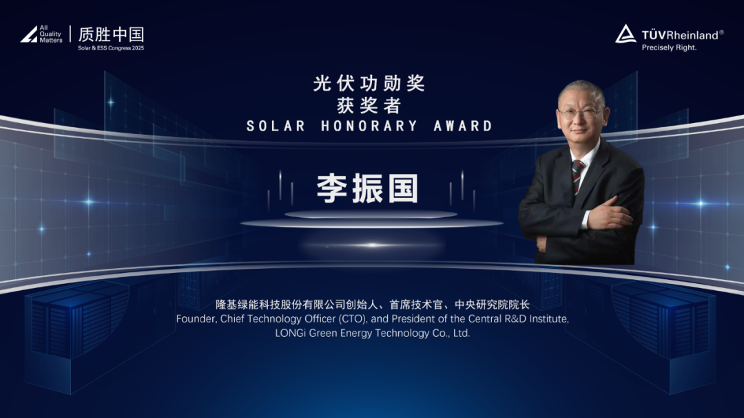 9月(yue)24日,在(zai)德國(guo)萊(lai)(lai)茵(yin)TüV集團(以(yi)下(xia)簡稱“TüV萊(lai)(lai)茵(yin)”)主辦的(de)2025“質勝(sheng)(sheng)中(zhong)國(guo)”光儲盛(sheng)典頒獎(jiang)(jiang)(jiang)典禮上,隆基綠(lv)能(neng)創始人(ren)、首席技術官李振國(guo)憑借多年來在(zai)光伏行業(ye)的(de)持續(xu)創新、產(chan)業(ye)引領(ling)(ling)以(yi)及對全球能(neng)源轉型的(de)卓越貢獻,榮獲(huo)TüV萊(lai)(lai)茵(yin)授予的(de)“光伏功勛獎(jiang)(jiang)(jiang)”。據(ju)了解,這(zhe)一獎(jiang)(jiang)(jiang)項是TüV萊(lai)(lai)茵(yin)優(you)勝(sheng)(sheng)獎(jiang)(jiang)(jiang)體系中(zhong)的(de)最高個人(ren)榮譽(yu),旨在(zai)表彰(zhang)對光伏行業(ye)產(chan)生深遠(yuan)影(ying)響的(de)領(ling)(ling)軍人(ren)物。 TüV萊茵(yin)在頒(ban)獎詞中表示,“他(ta)是中國光伏(fu)(fu)產業(ye)(ye)的(de)執燈者,以單晶(jing)技術的(de)星火燎原,照(zhao)亮了(le)光伏(fu)(fu)清潔能源發(fa)電的(de)漫漫長路;他(ta)是行業(ye)(ye)變革的(de)破冰人(ren),在多(duo)晶(jing)技術壟斷的(de)迷霧(wu)中,錨定(ding)單晶(jing)硅未(wei)來(lai)的(de)航向(xiang),用(yong)十(shi)余年堅守改寫了(le)全球光伏(fu)(fu)產業(ye)(ye)的(de)歷史(shi)篇章”。 頒獎詞特別提到,從(cong)戰略性(xing)踏(ta)入光伏(fu)賽(sai)道的(de)(de)抉擇,到研發出(chu)的(de)(de)單晶(jing)產品突破90%市占率的(de)(de)輝煌,李振(zhen)國以科學家的(de)(de)嚴謹(jin)測算(suan)度電(dian)成本(ben)的(de)(de)未來,打(da)通單晶(jing)硅(gui)棒(bang)、硅(gui)片(pian)到單晶(jing)電(dian)池(chi)、組件的(de)(de)全產業鏈,多(duo)次取(qu)得系(xi)統性(xing)突破,為行業降(jiang)本(ben)增效乃至(zhi)光伏(fu)度電(dian)成本(ben)降(jiang)低作出(chu)了積(ji)極貢獻。 同(tong)時,李(li)振(zhen)國(guo)提出“Solar for Solar”發展(zhan)理念(nian),帶領(ling)隆(long)基率先布局(ju)“綠(lv)電”+“綠(lv)氫”解(jie)決方案,破(po)解(jie)能源“不可(ke)能三角”,展(zhan)現了他對能源革命終極構想的(de)深(shen)刻(ke)理解(jie)與(yu)推動全(quan)球能源轉(zhuan)(zhuan)型的(de)堅定決心。如今,這一理念(nian)已在全(quan)球多地實(shi)踐,李(li)振(zhen)國(guo)帶領(ling)隆(long)基以(yi)技術創新引領(ling)產(chan)業變革,切實(shi)推動全(quan)球能源公正轉(zhuan)(zhuan)型與(yu)可(ke)持續發展(zhan)。 “這(zhe)既(ji)是對隆基過(guo)去堅(jian)持技術(shu)創新、推動行(xing)(xing)業(ye)進(jin)步的(de)認可,更是對我(wo)們未來繼續篤行(xing)(xing)于此(ci)的(de)巨大勉勵。”對于獲此(ci)殊榮,李振國認為,從(cong)單晶技術(shu)起步,自(zi)己與(yu)隆基共(gong)(gong)同見證并參與(yu)了(le)中國光(guang)伏(fu)從(cong)追(zhui)趕到引領的(de)全程。然而,光(guang)伏(fu)的(de)價值不止于“用得起”,更應追(zhui)求“用得方便”。隆基愿與(yu)全行(xing)(xing)業(ye)攜手努力(li),讓綠色能源真正(zheng)變得觸手可及、隨(sui)心所用。這(zhe)條(tiao)路漫(man)長(chang)而堅(jian)定,需要共(gong)(gong)同走下去。 下一篇: 河南能源和平煤神馬擬實施戰略重組